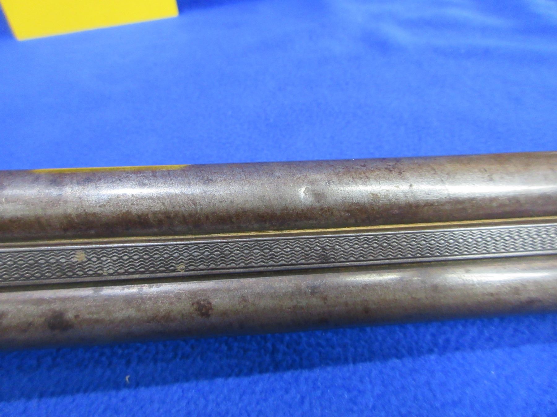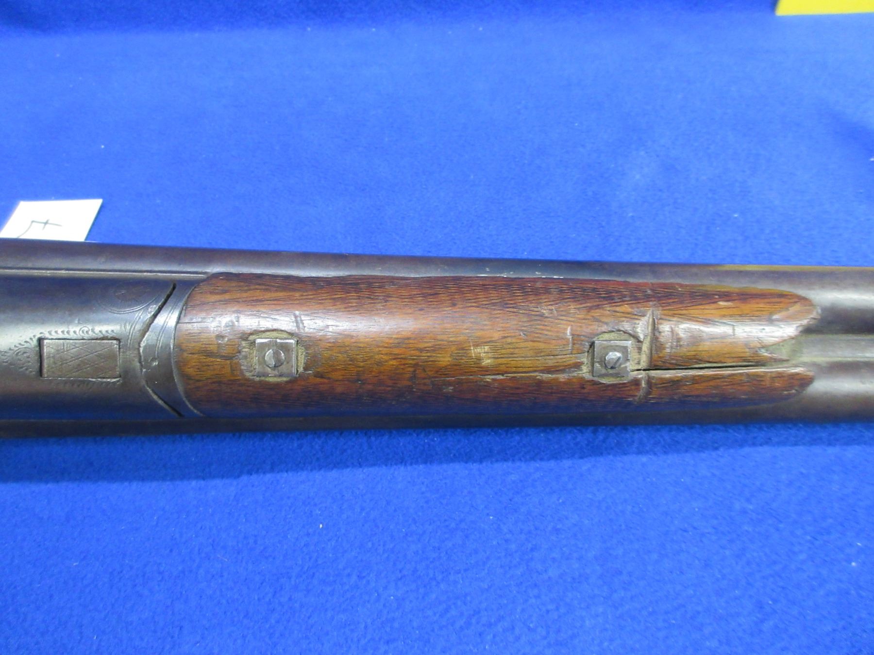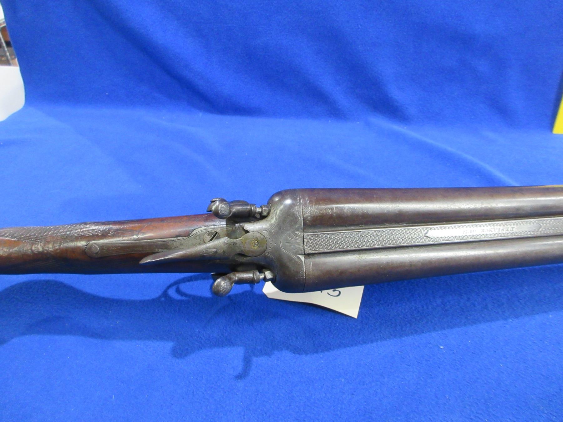 Non-Restricted - W&J Davis (Birmingham) SXS in 12 Ga. 2 3/4" - This is a tip up SXS hammer shotgun, action appears to be in good working order, action is tight. Damascus barrels are 30" - left barrel has two dents approx 9" from muzzle, bores are fair to good (may need wet cleaning), bluing is turning brown or gone, has bead front sight, stock is good with many usage marks, forearm is poor, slip-on rubber recoil pad poor. Ser # 101971