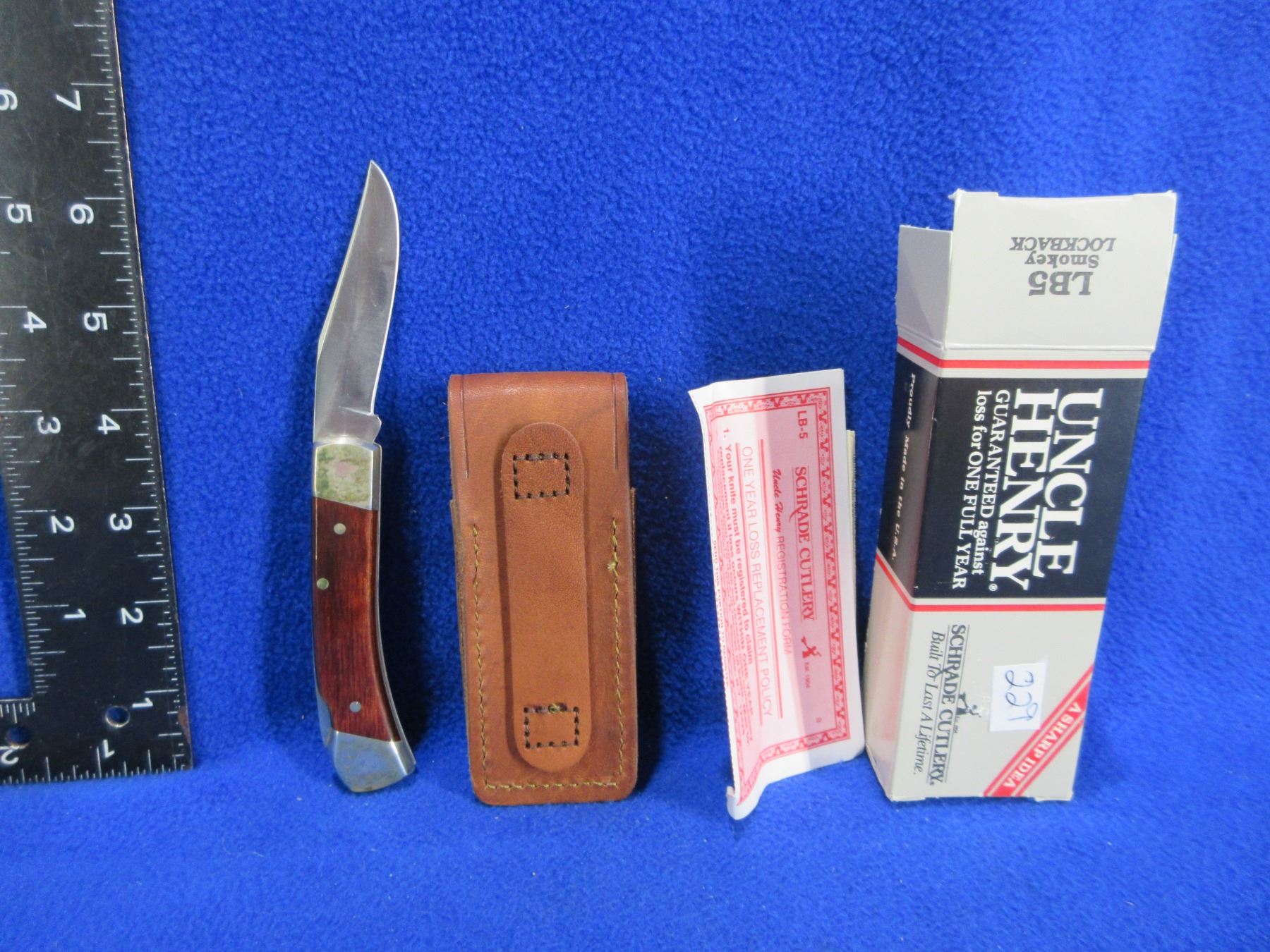 Schrade Uncle Henry LB5 Smokey Lockback Folding Blade Knife with Leather Sheath and Original Box