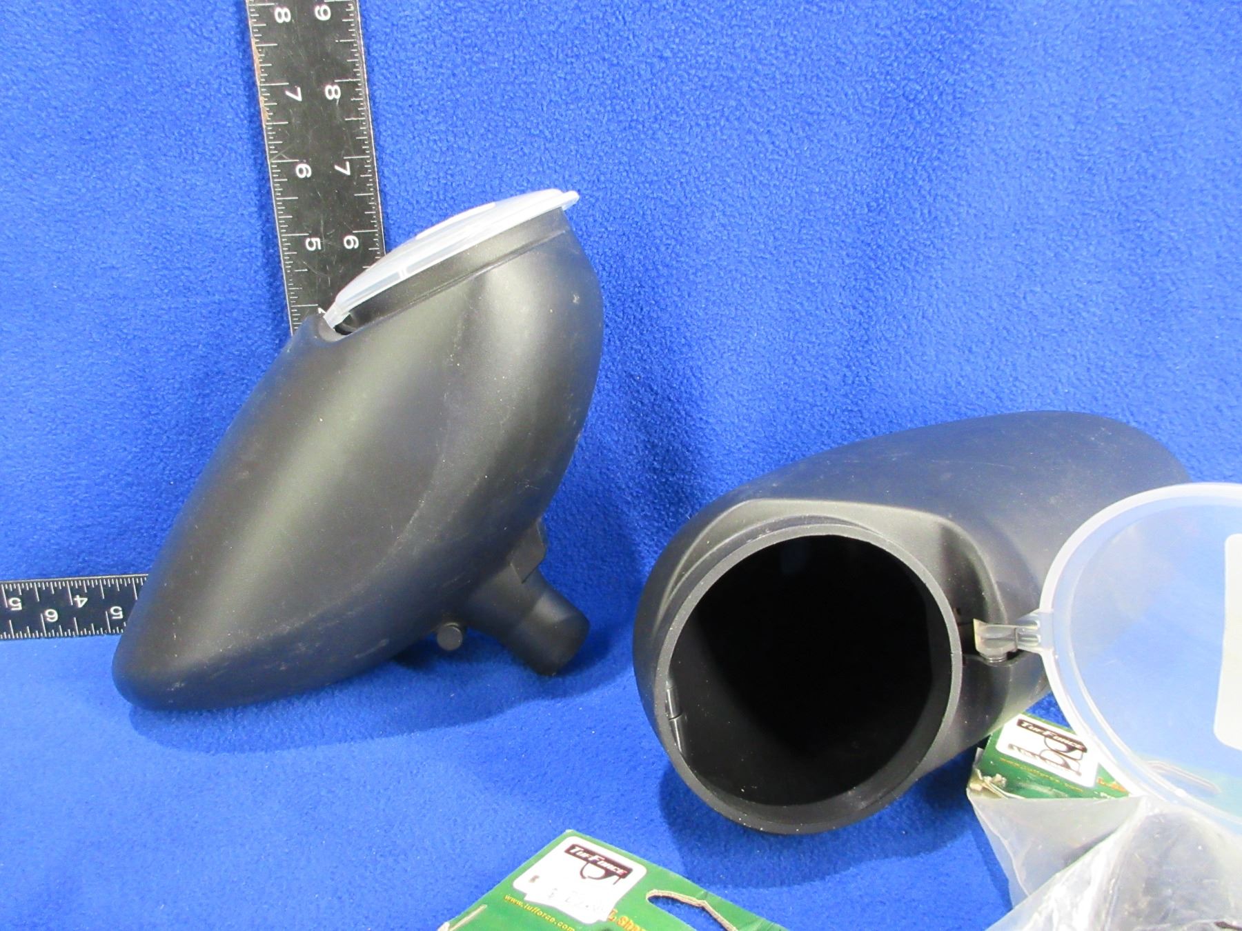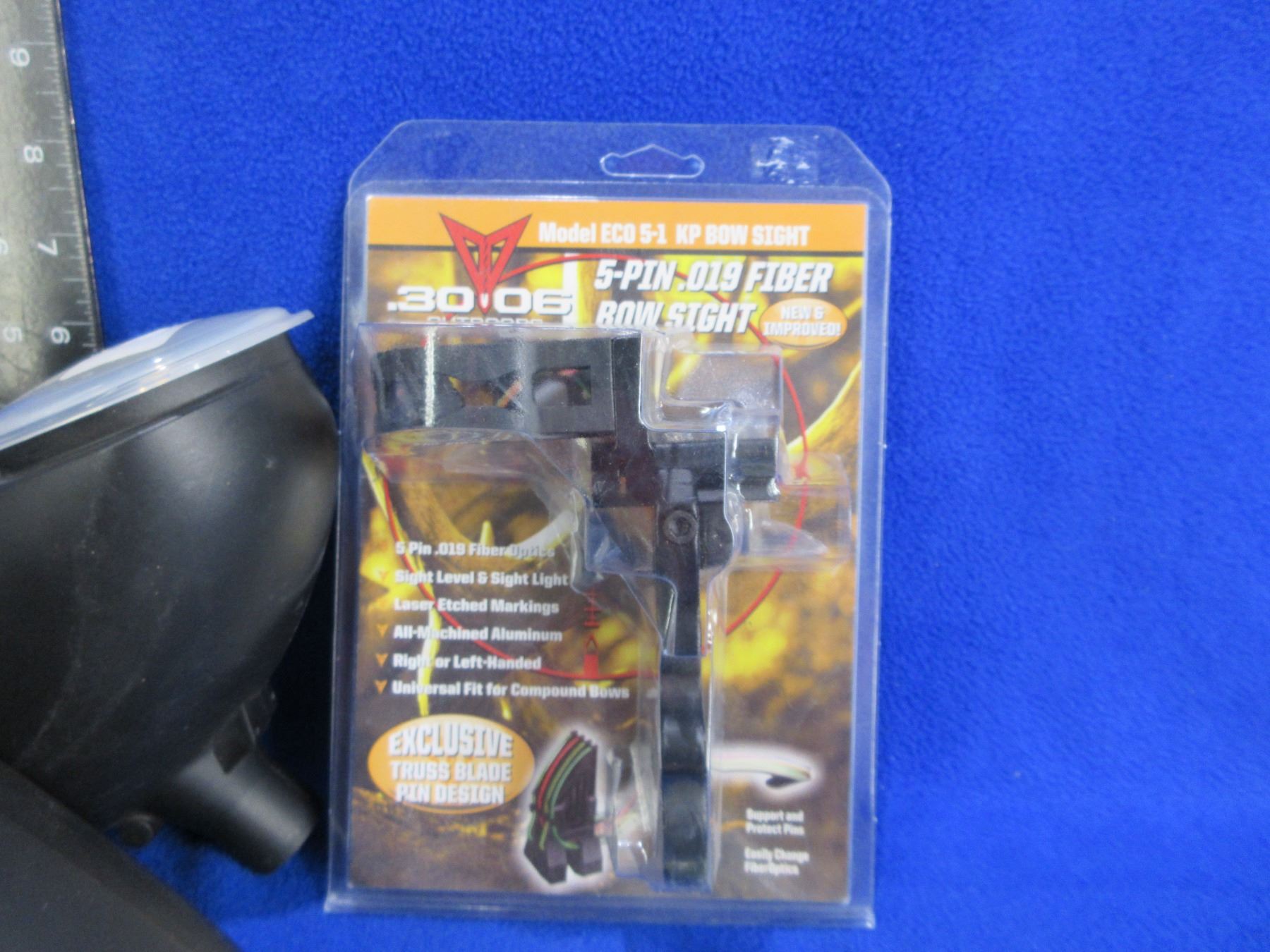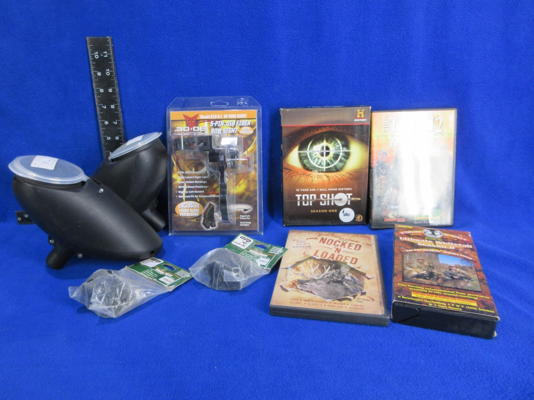 Lot of Misc. - 5 Pin Bow Sight, 2 Paintball Hoppers (200 Round Loaders), 2 TufForce 1" Aluminum L-Shape Rings (Weaver/Picatinny), 4 Hunting DVD's