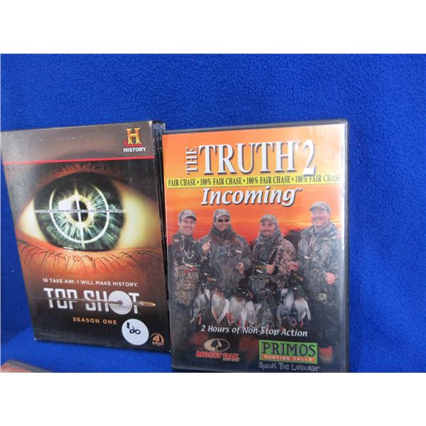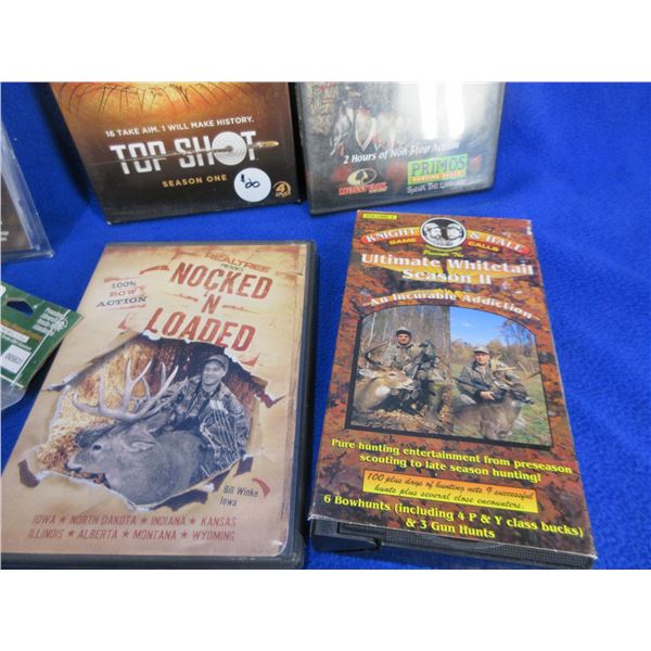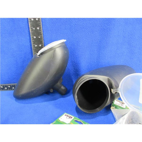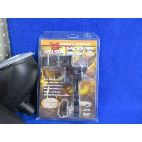 Lot of Misc. - 5 Pin Bow Sight, 2 Paintball Hoppers (200 Round Loaders), 2 TufForce 1" Aluminum L-Shape Rings (Weaver/Picatinny), 4 Hunting DVD's