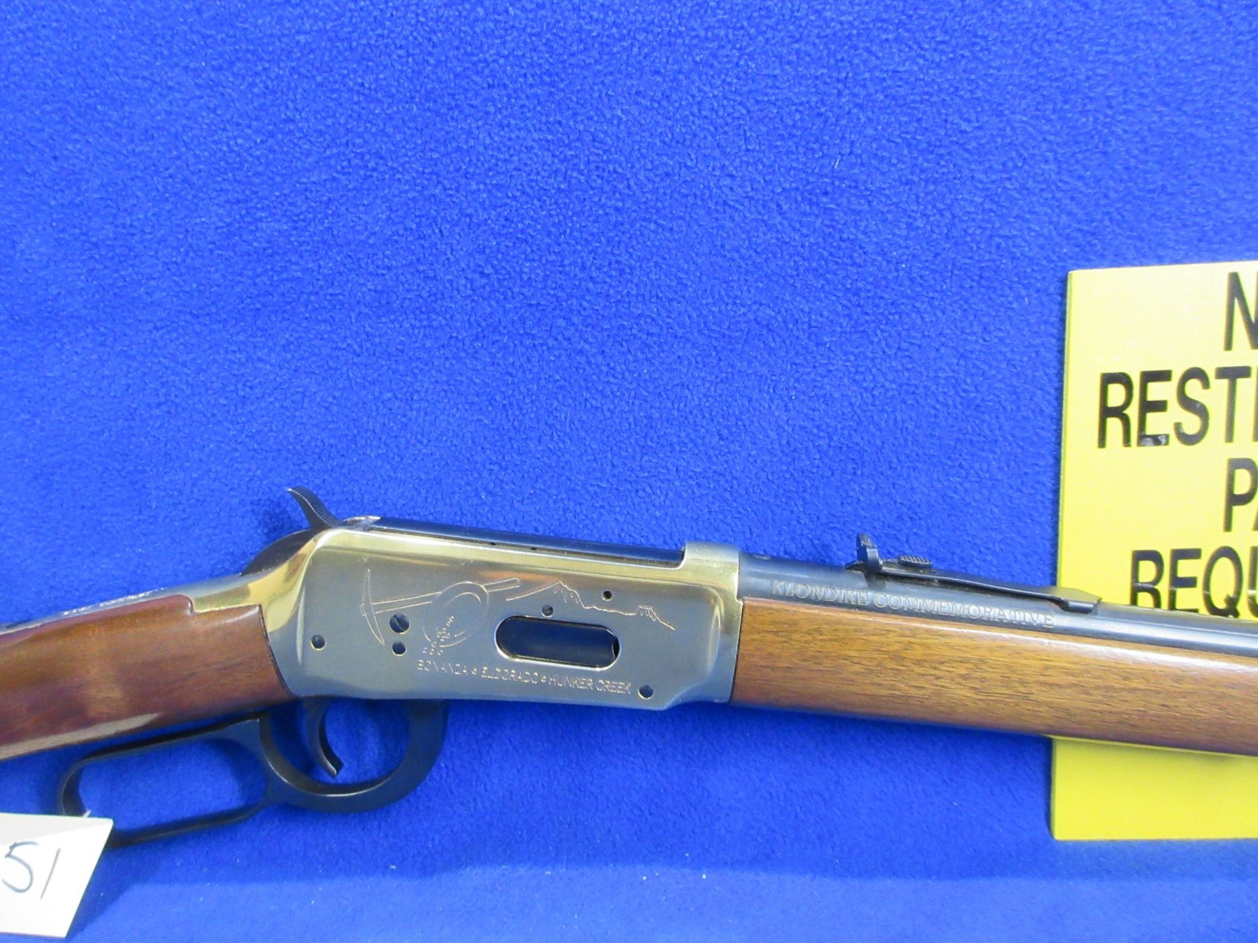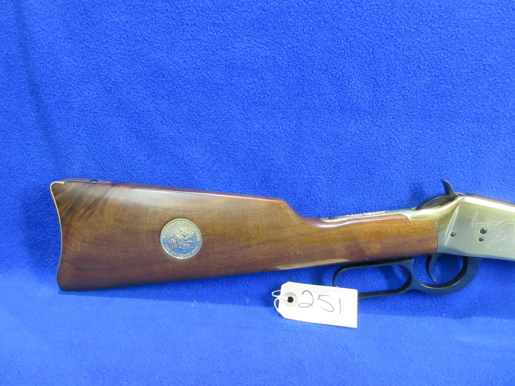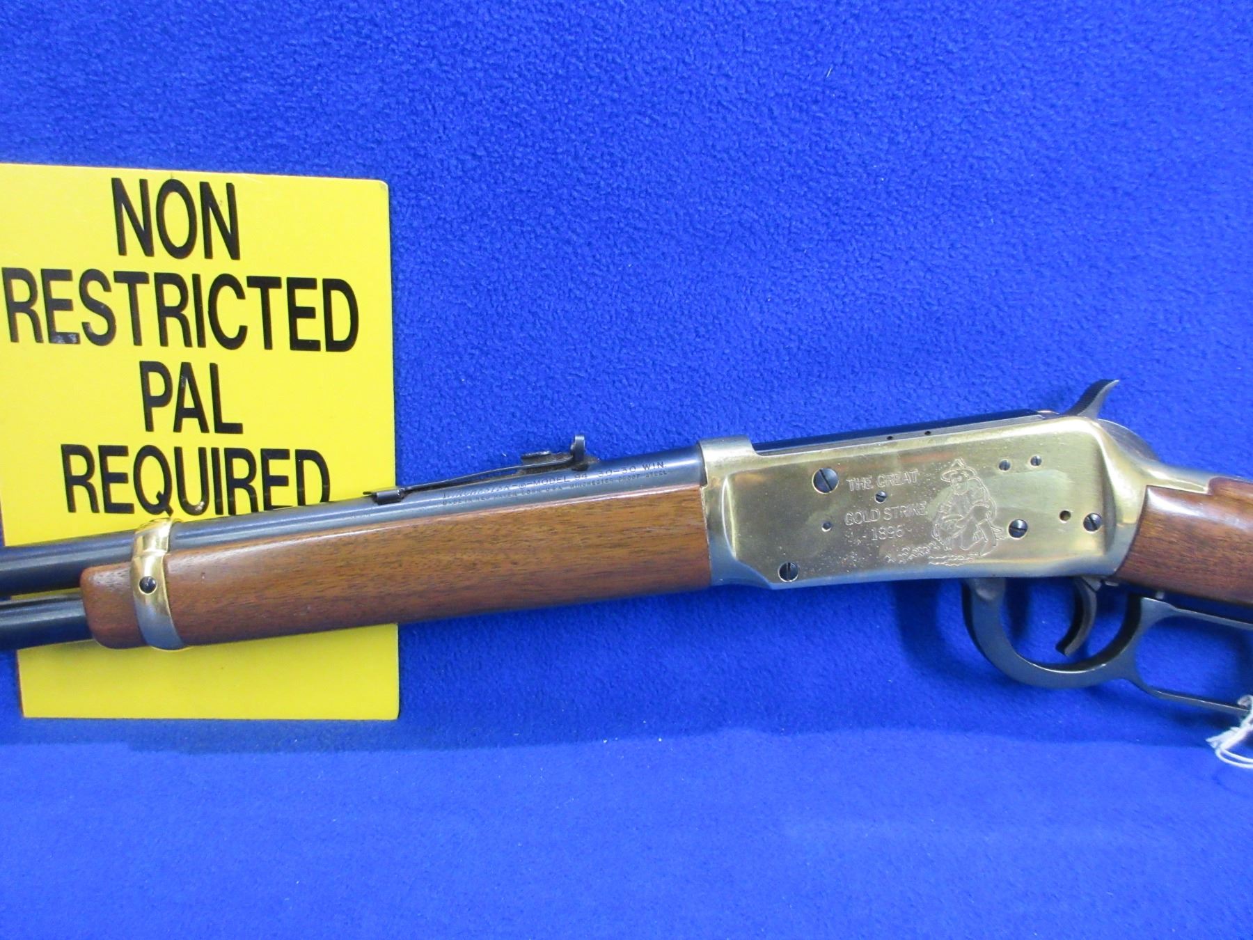 Non-Restricted - Winchester Model 94 in 30-30 Win - This is a Klondike Commemorative lever action rifle with tube magazine, action appears to be in never fired condition. Barrel is 20", rifling is very good, bluing is good with some very light pitting on top of the barrel, action has some speckling on the left side, has both sights, stock and forearm are good to very good with some handling marks, brass furniture and butt plate good to very good. Ser #KGR7910