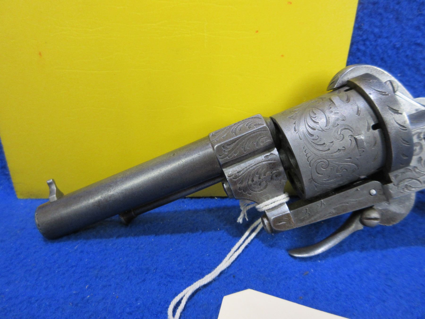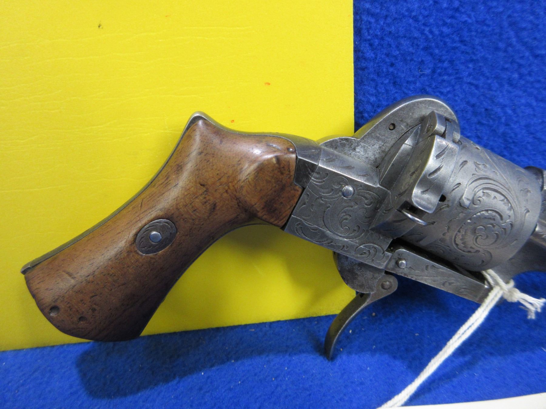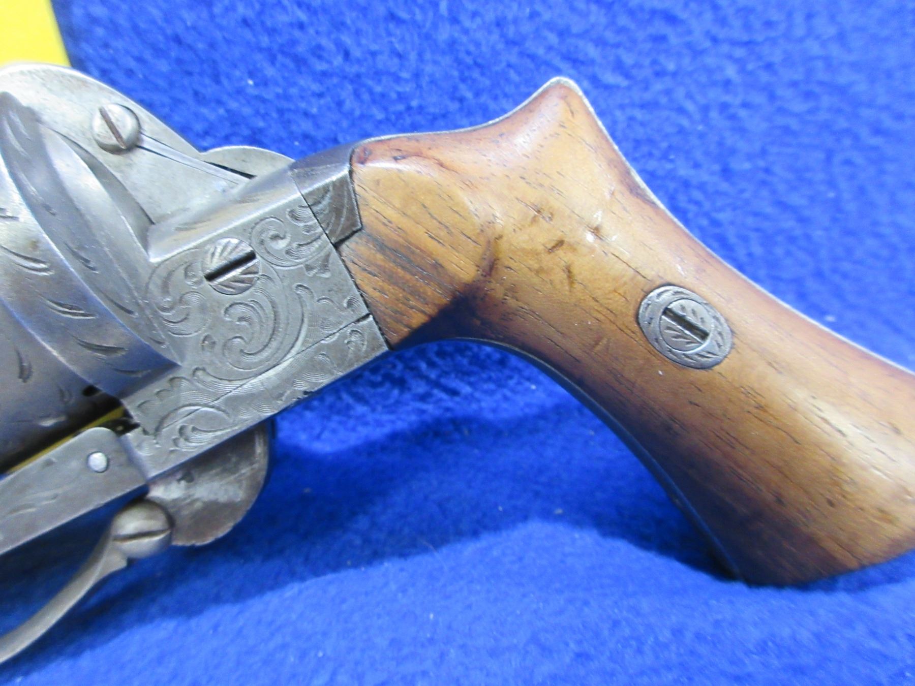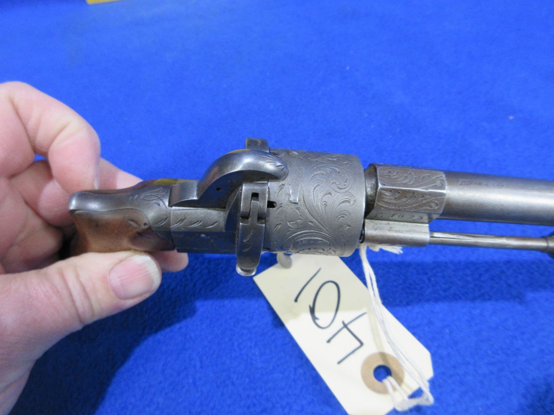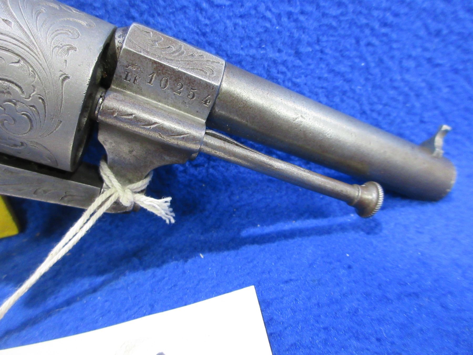Antique - No PAL Required - Le Faucheux in 7mm Pinfire - Very nice condition for it's age, this six shot double action only revolver appears to be in good working order. Round barrel is 3 3/8", rifling appears good, has front sight, nicely engraved cylinder and action, wood grips good for age. Ser # 10254