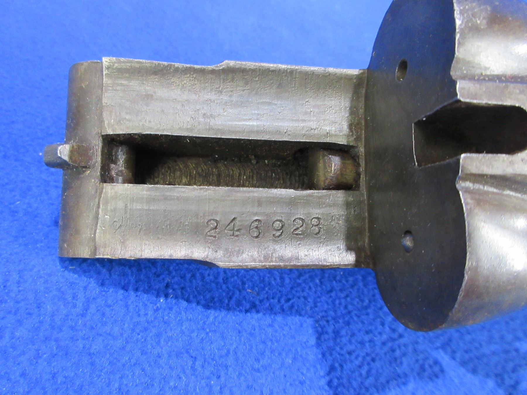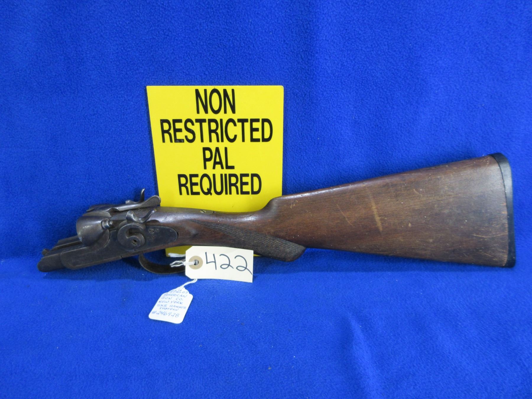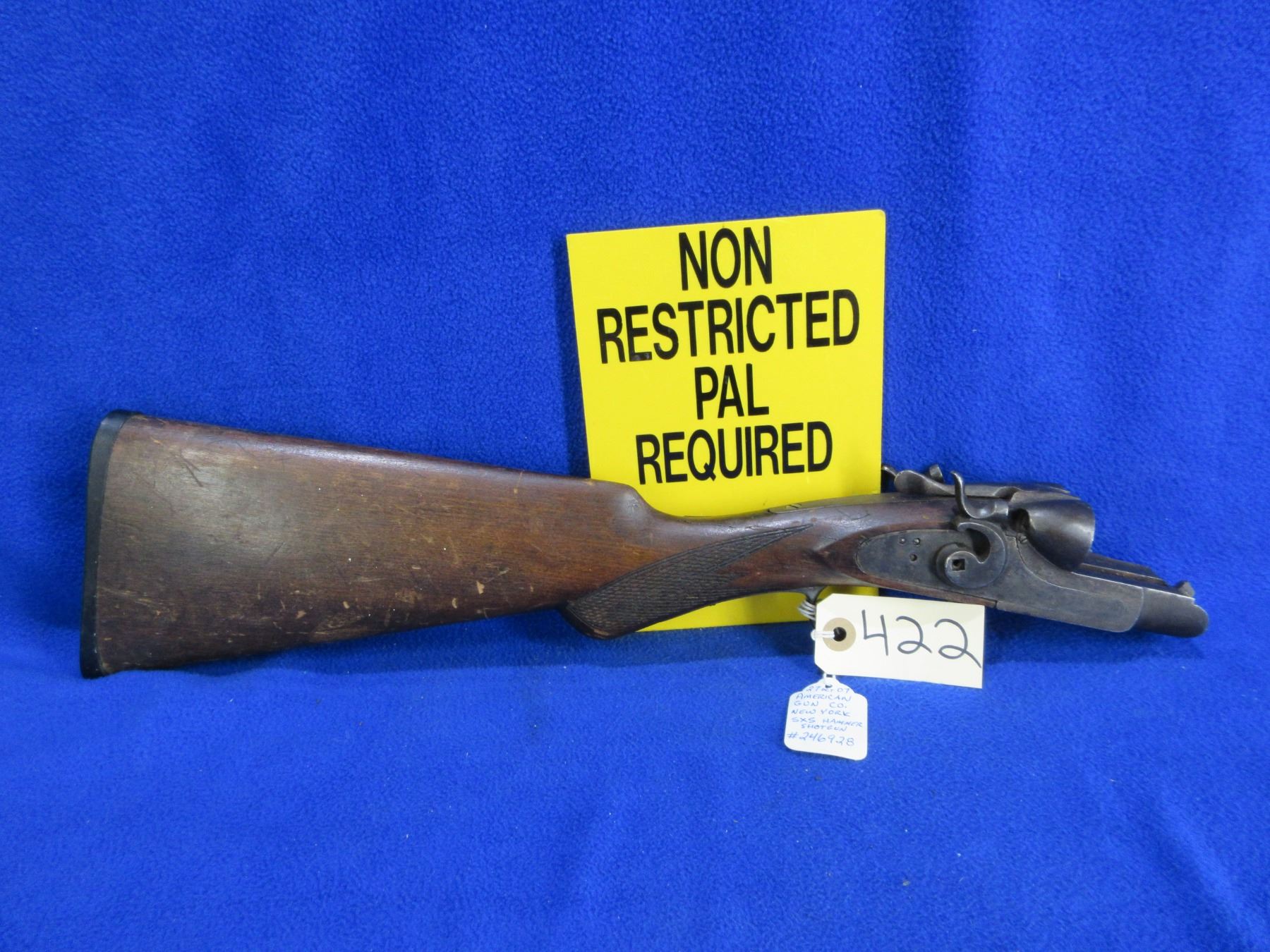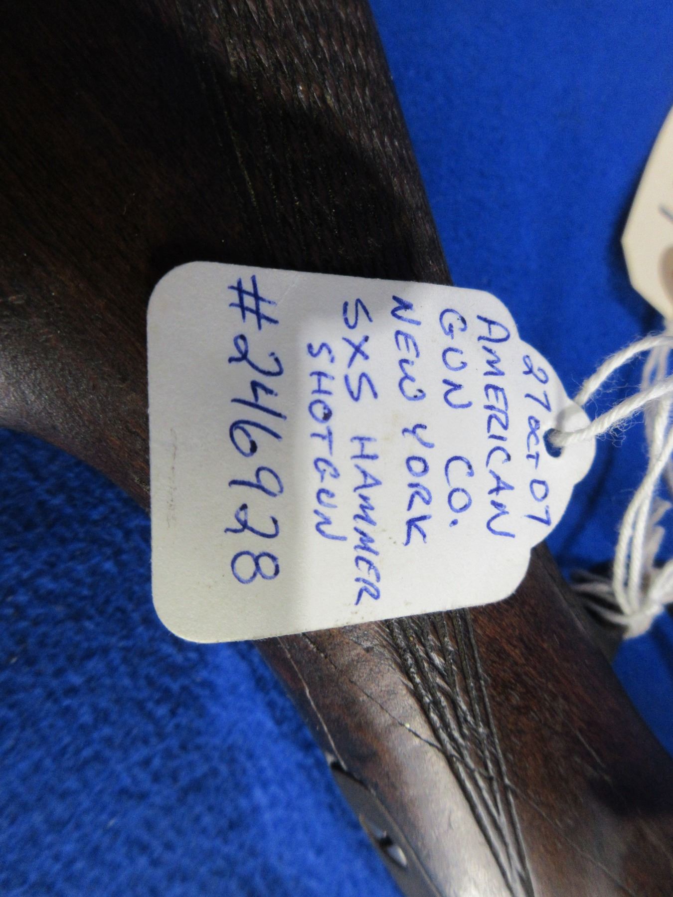 Non-Restricted - Action and Stock - American Gun Co. SXS Hammer in Appears to be 12 Ga. - This is an action and stock only. Action is missing a firing pin and triggers, stock has cracks on top in the wrist area and a chip on the toe, comes with a butt plate.Ser # 246928