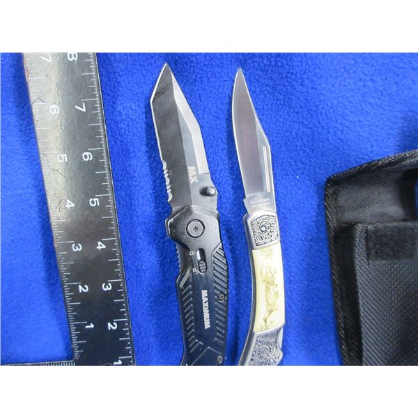 2 Folding Blade Lock Knives - Fighter Plus (NEW 3 1/4" Blade with Sheath), Maximum MX (3" Blade)