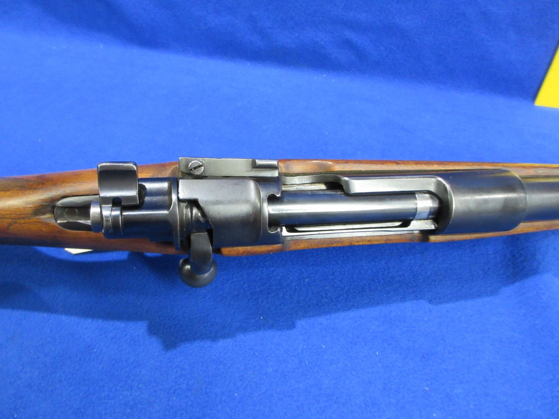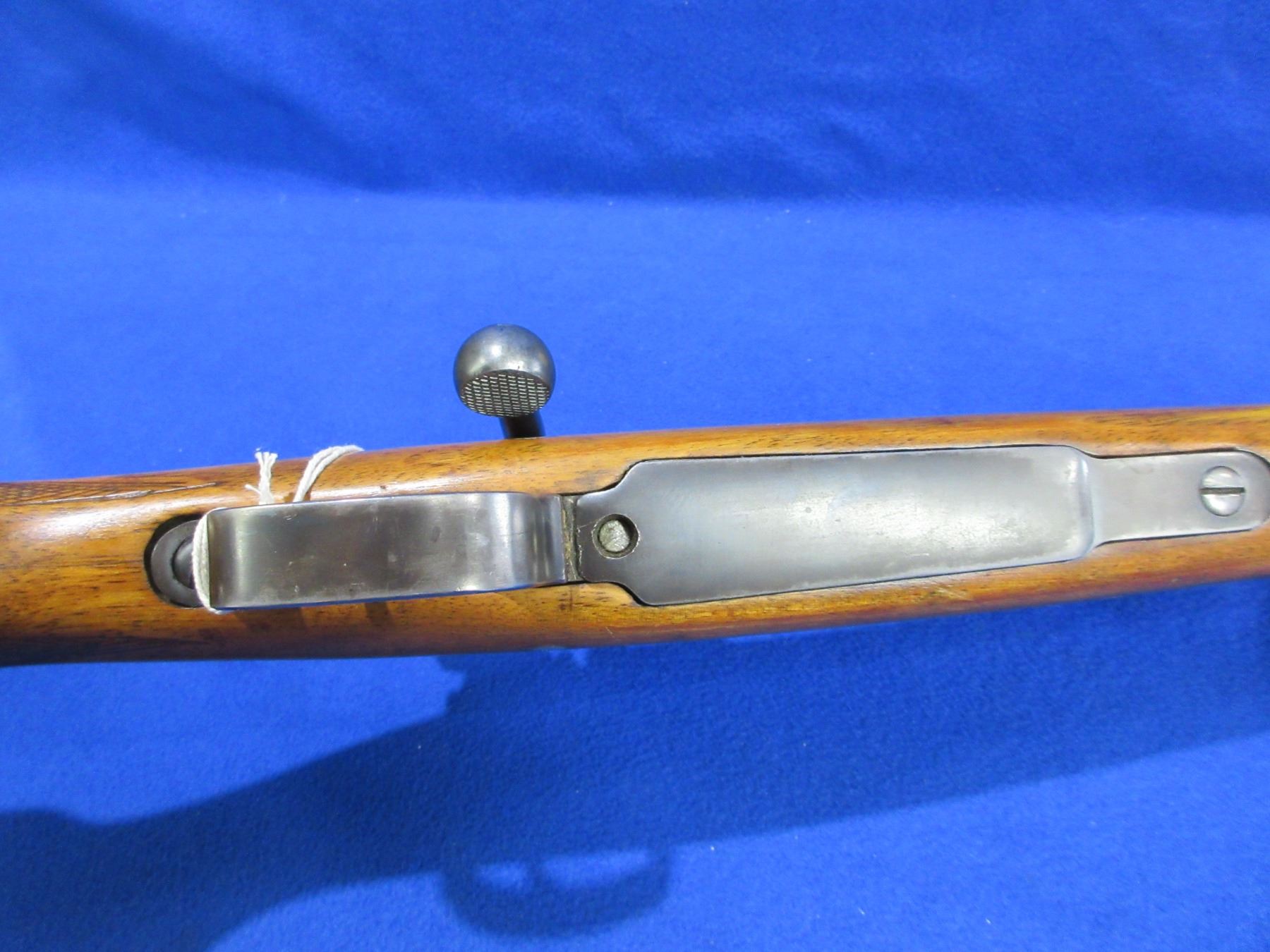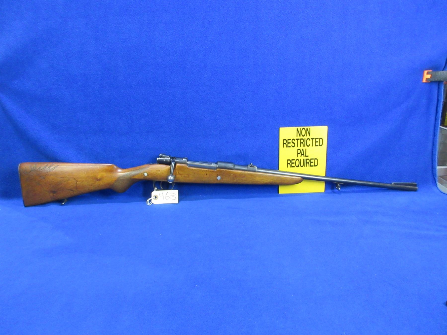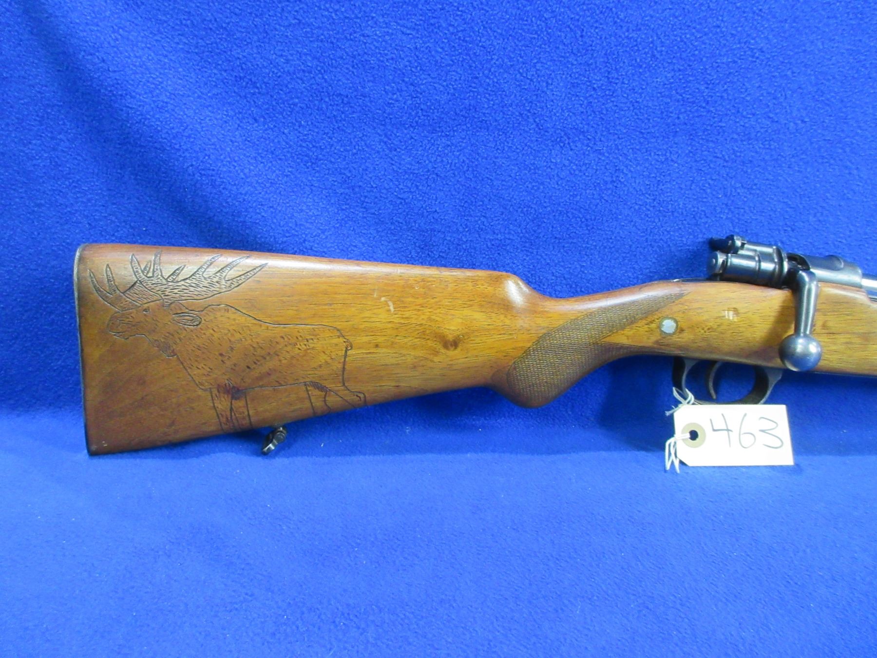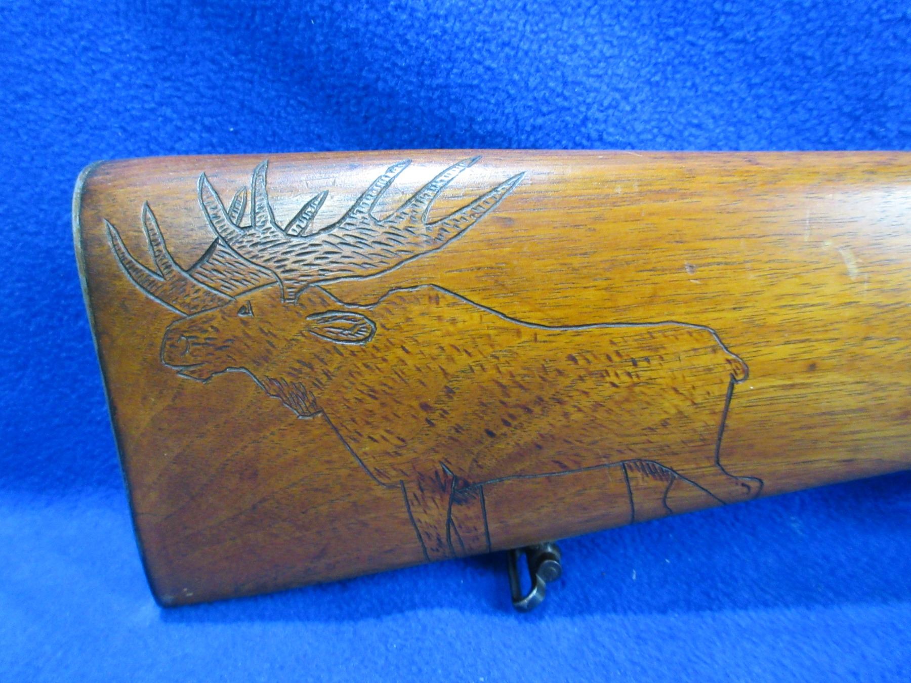 Non-Restricted - Geco Model 98 in 8x57 - This is a bolt action rifle with floorplate magazine, action appears to be in good to very good working order. Barrel is 21 1/4", rifling is good, bluing is good, has both sights, stock has a moose carved on right side and notches on left side and hairline cracks top and bottom in the wrist area, metal butt plate good, comes with swivels. Ser #4016