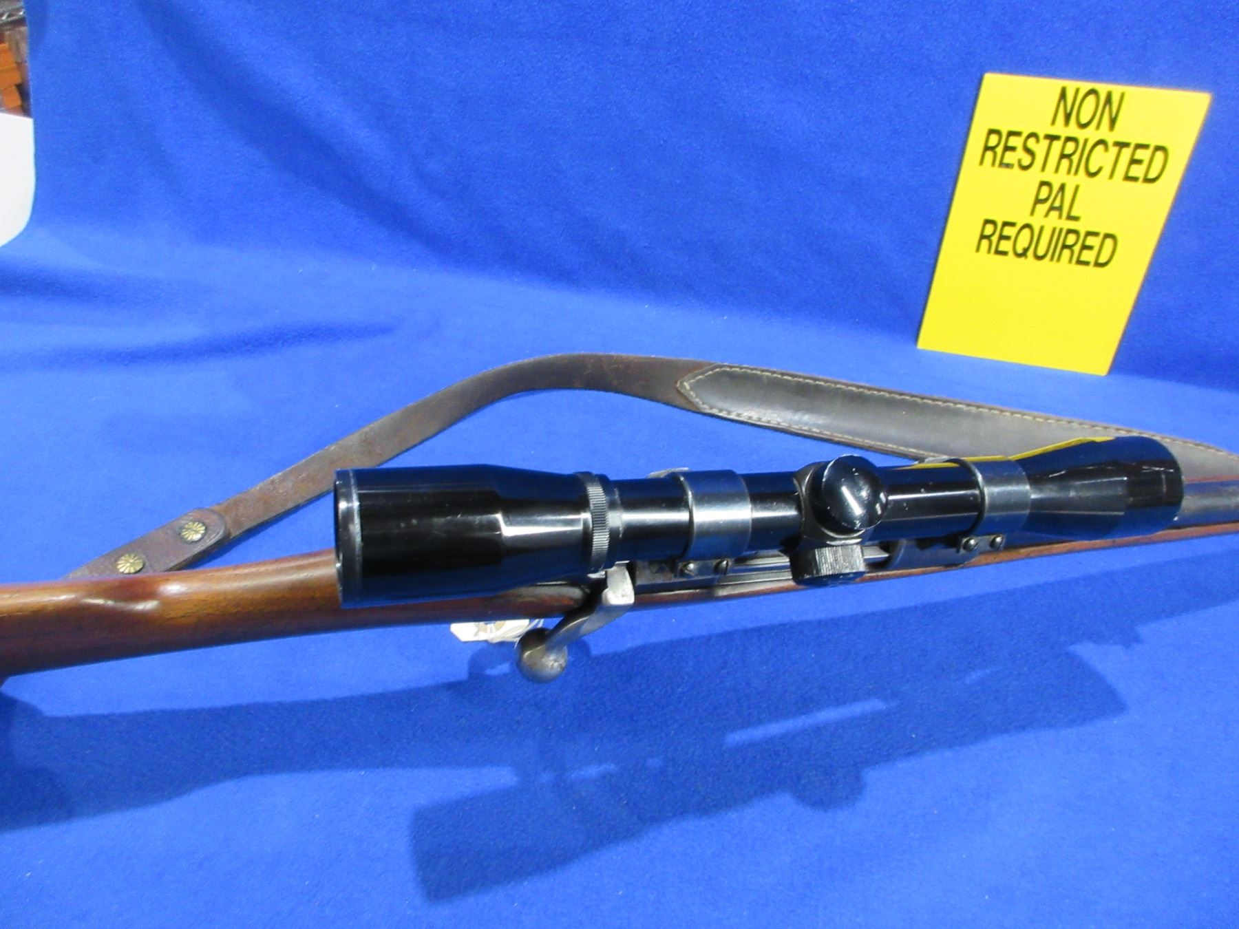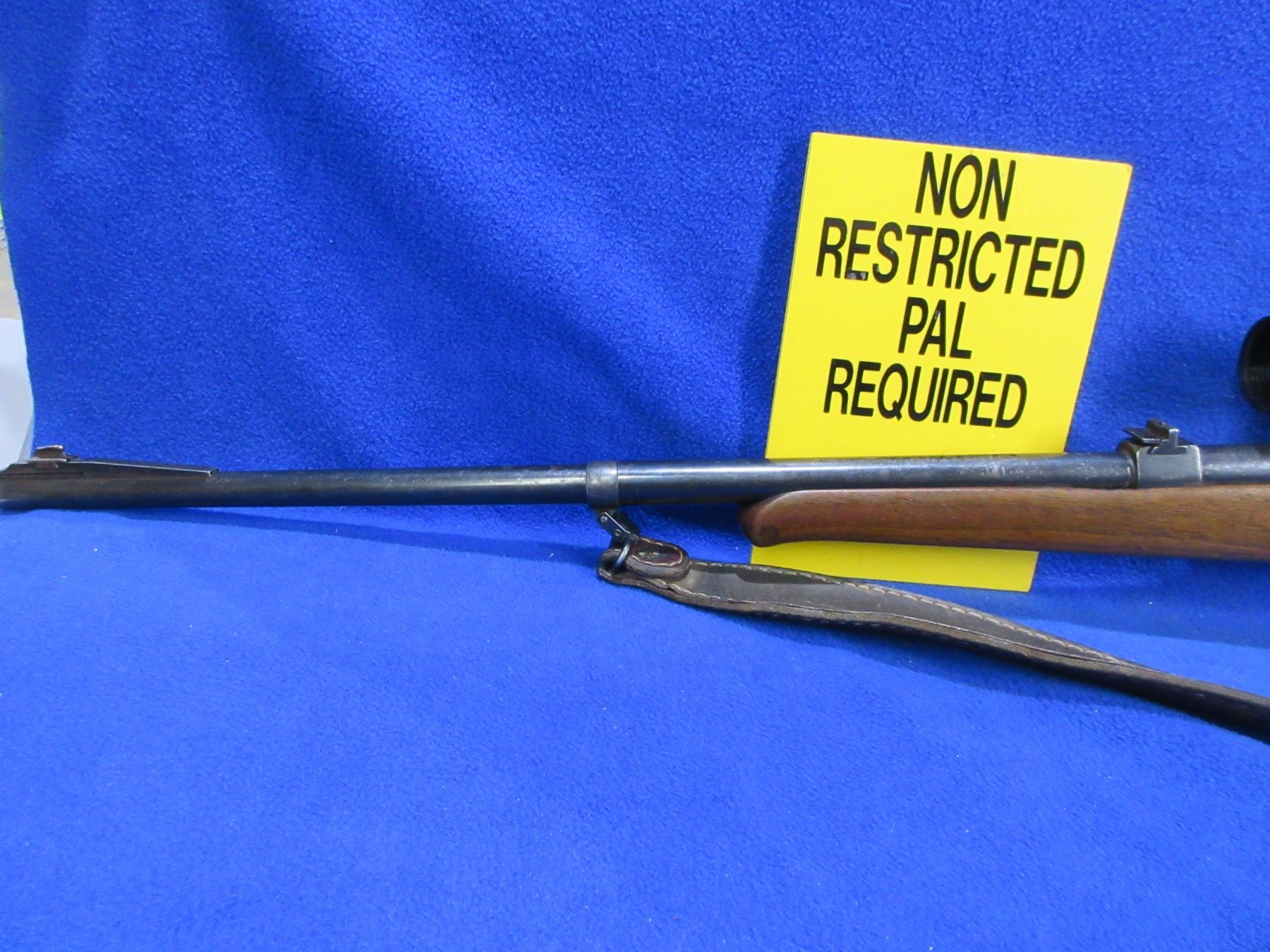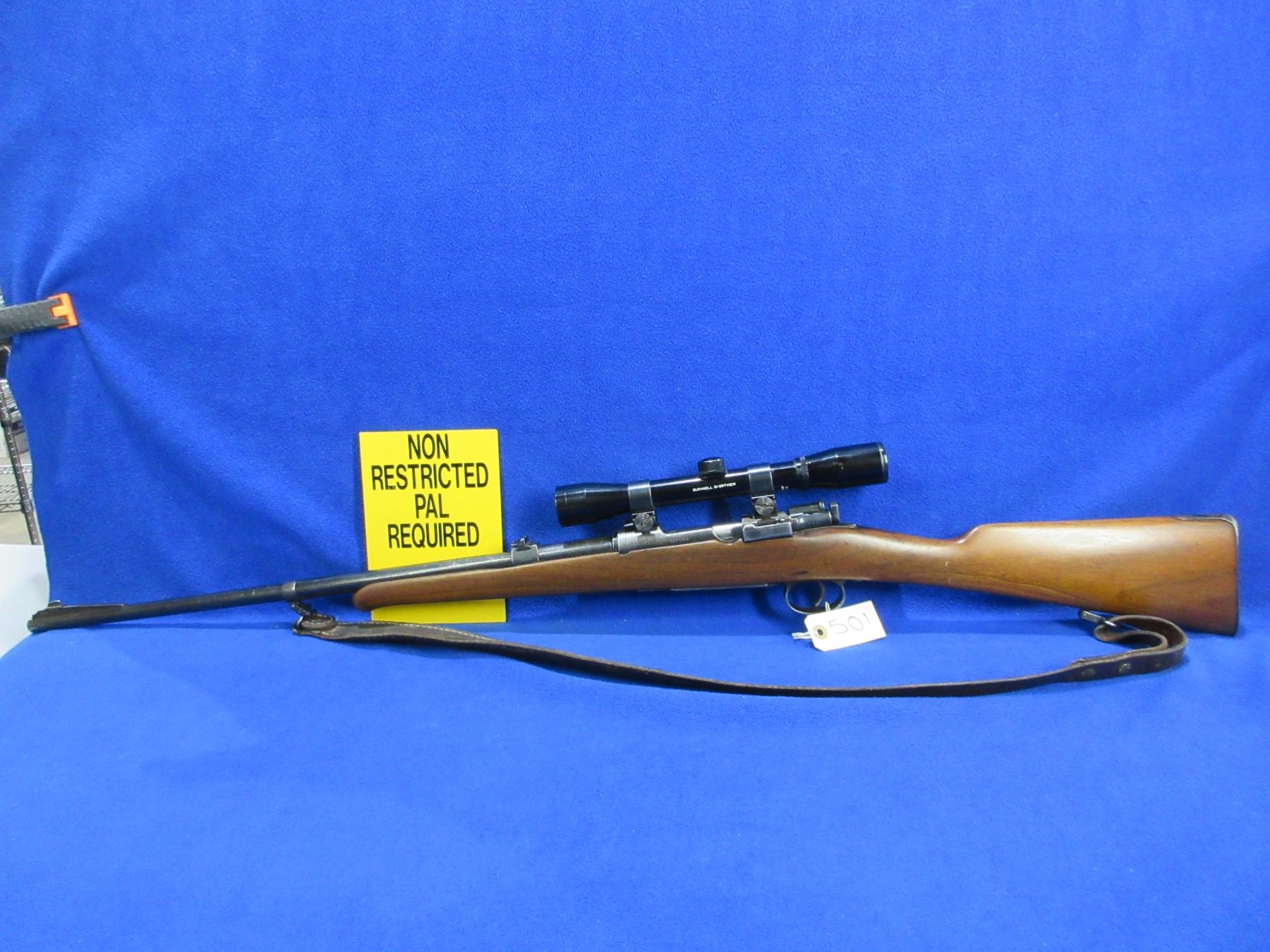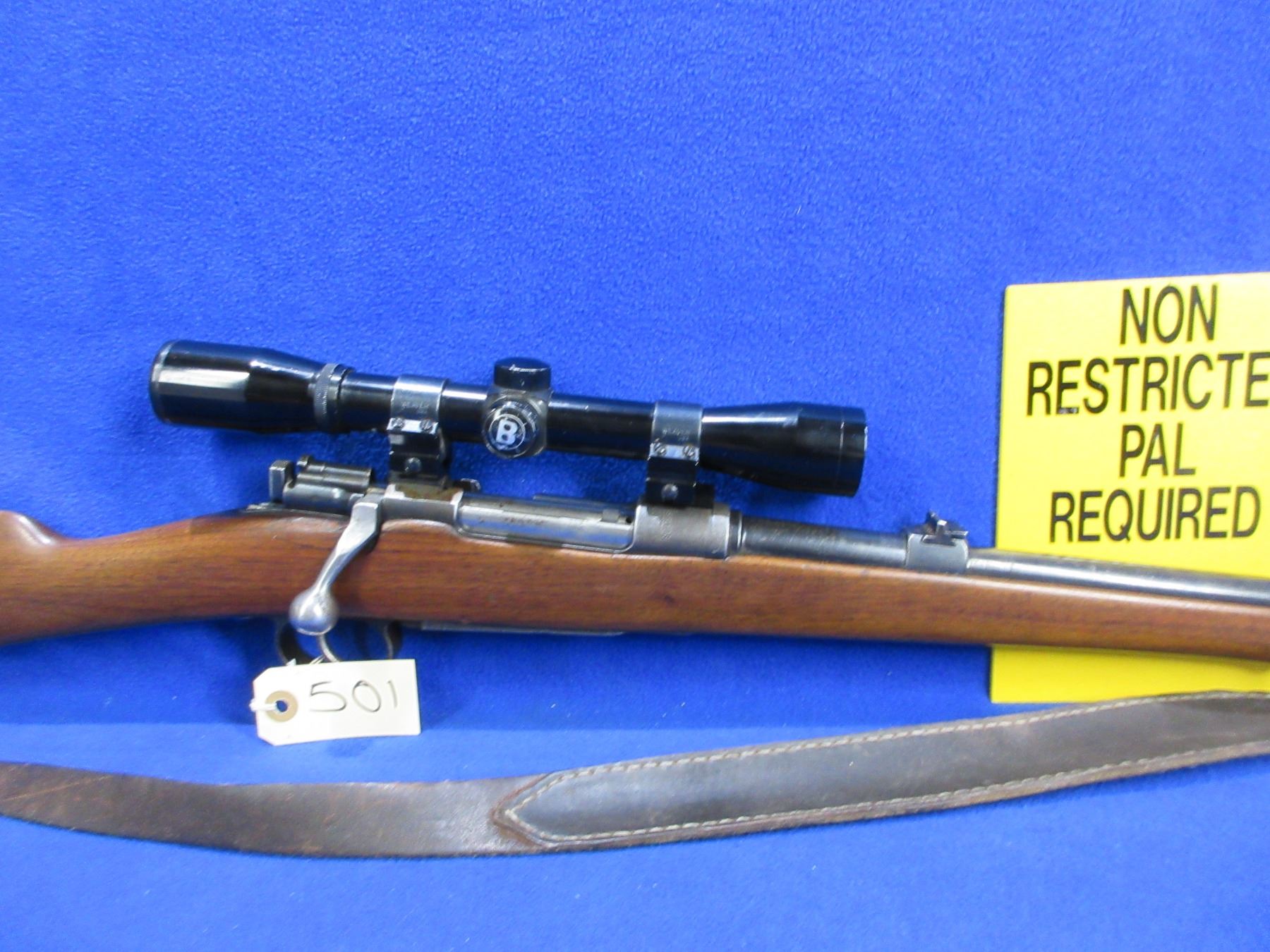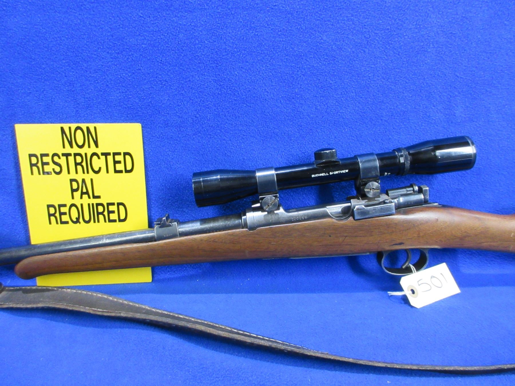 Non-Restricted - Husqvarna Carl Gustaf in 8mm - This is a bolt action rifle with floorplate magazine, action appears to be in good working order but safety is missing. Barrel is 23 1/2", rifling is good to very good, bluing is turning grey or patchy, has both sights and has Bushnell Sportview 4x32 scope - appears clear - duplex reticle - Weaver rings, stock has a crack behind the upper tang, metal butt plate good, comes with swivels and strap. Ser #100699