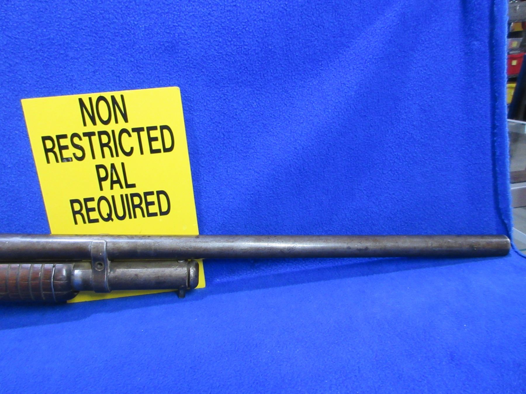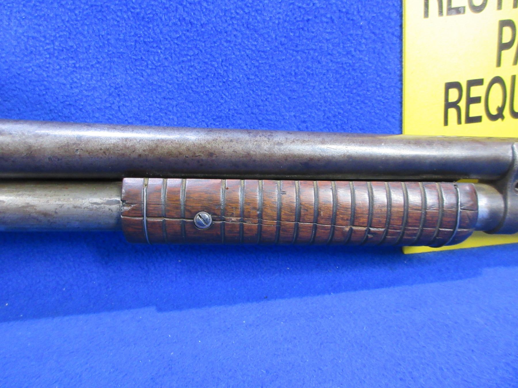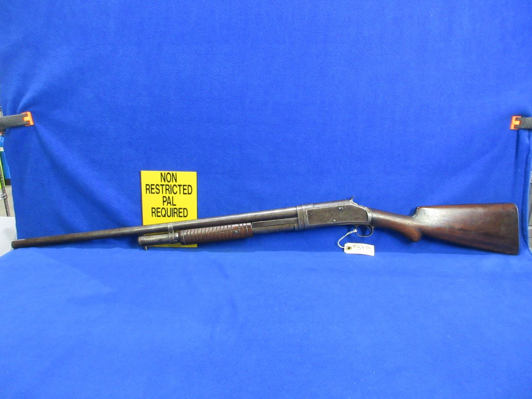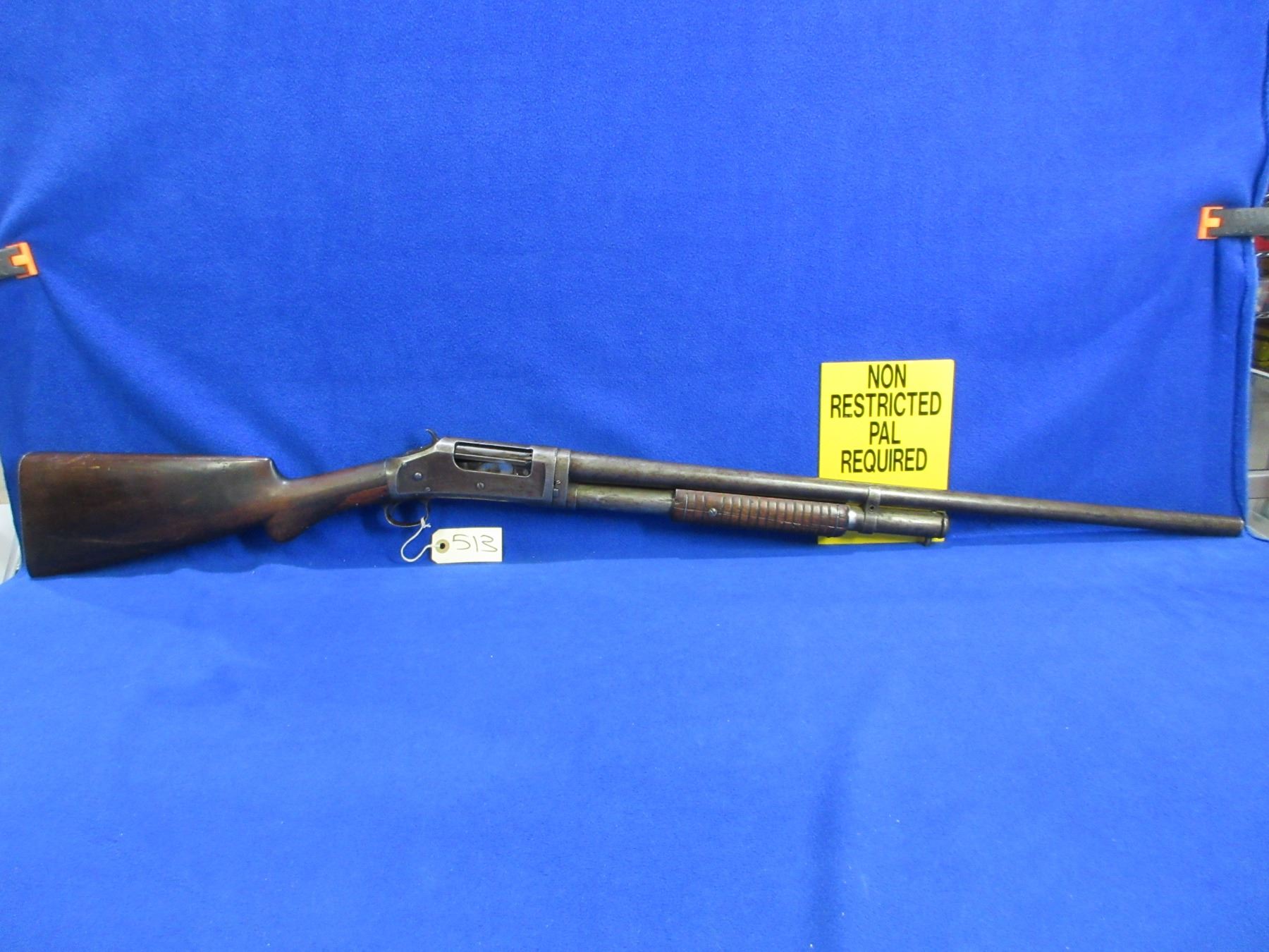 Non-Restricted - Winchester Model 1897 in 12 Ga. 2 3/4" Full - Made in 1900, this is a pump action shotgun, action appears to be in good working order. Barrel is 28 1/4" and appears to have been shortened, bore is fair to good, bluing is turning brown or gone, front bead sight is missing, stock has a major crack repair in the wrist area, forearm has large cracks on both sides, metal butt plate good. Ser # 127516