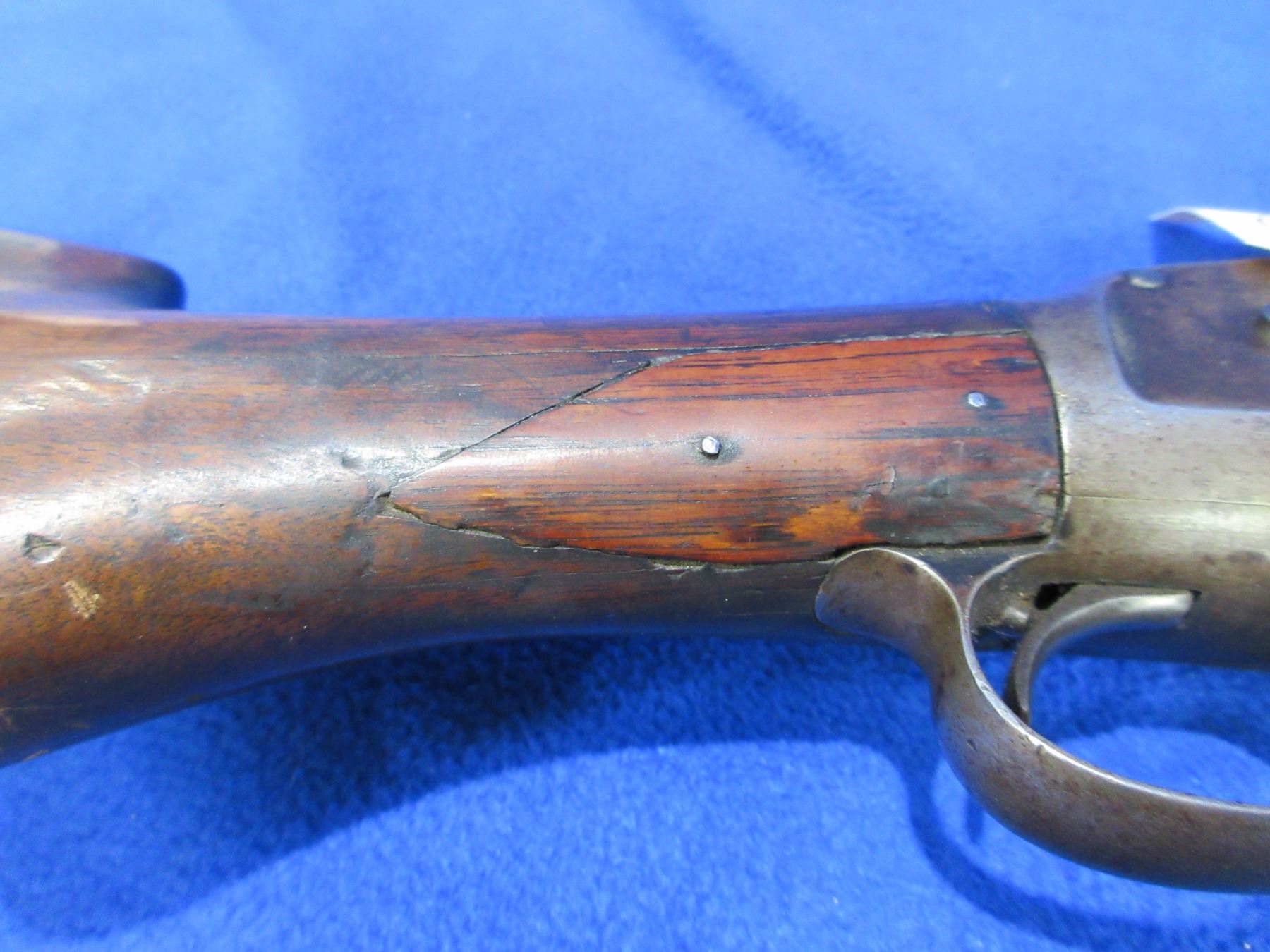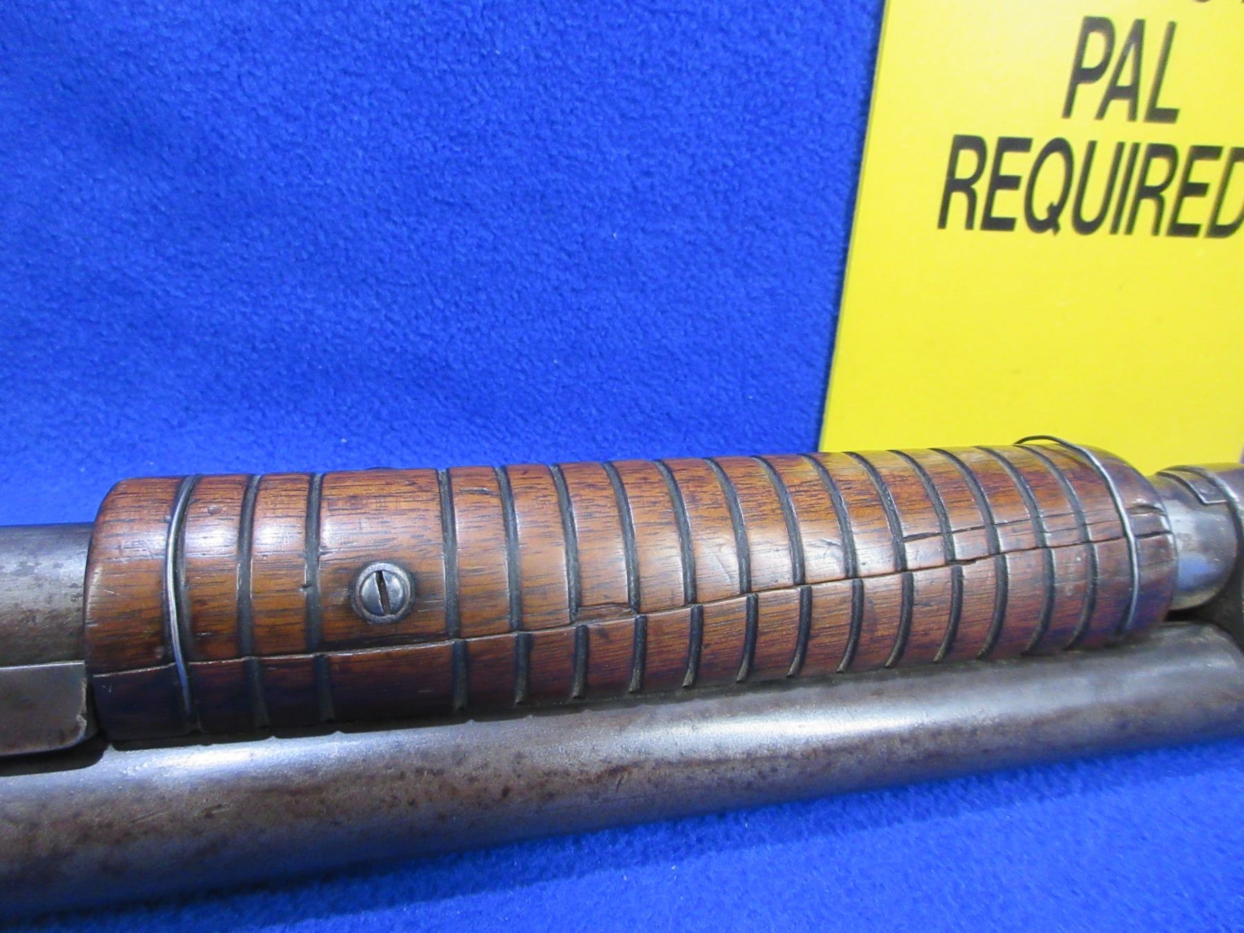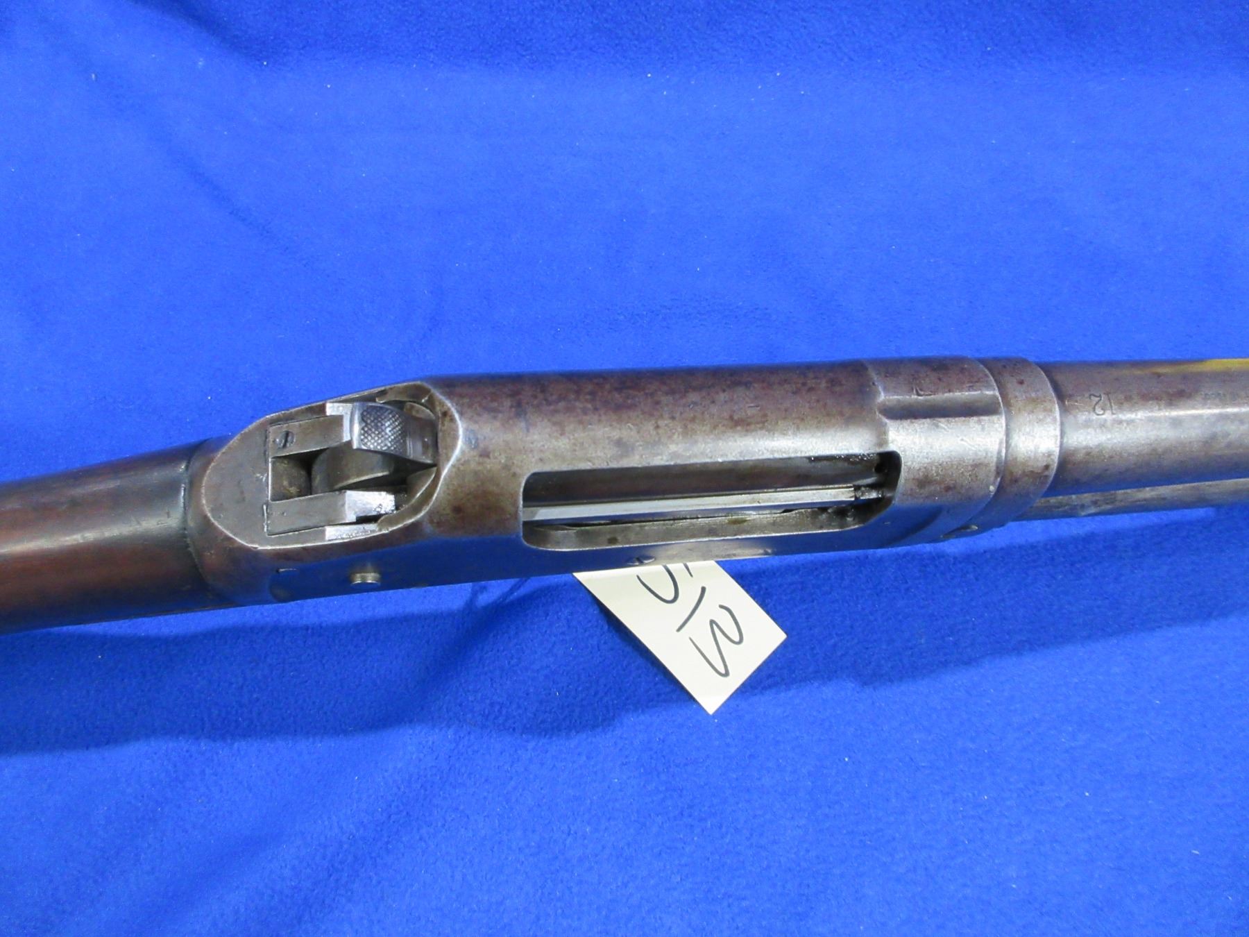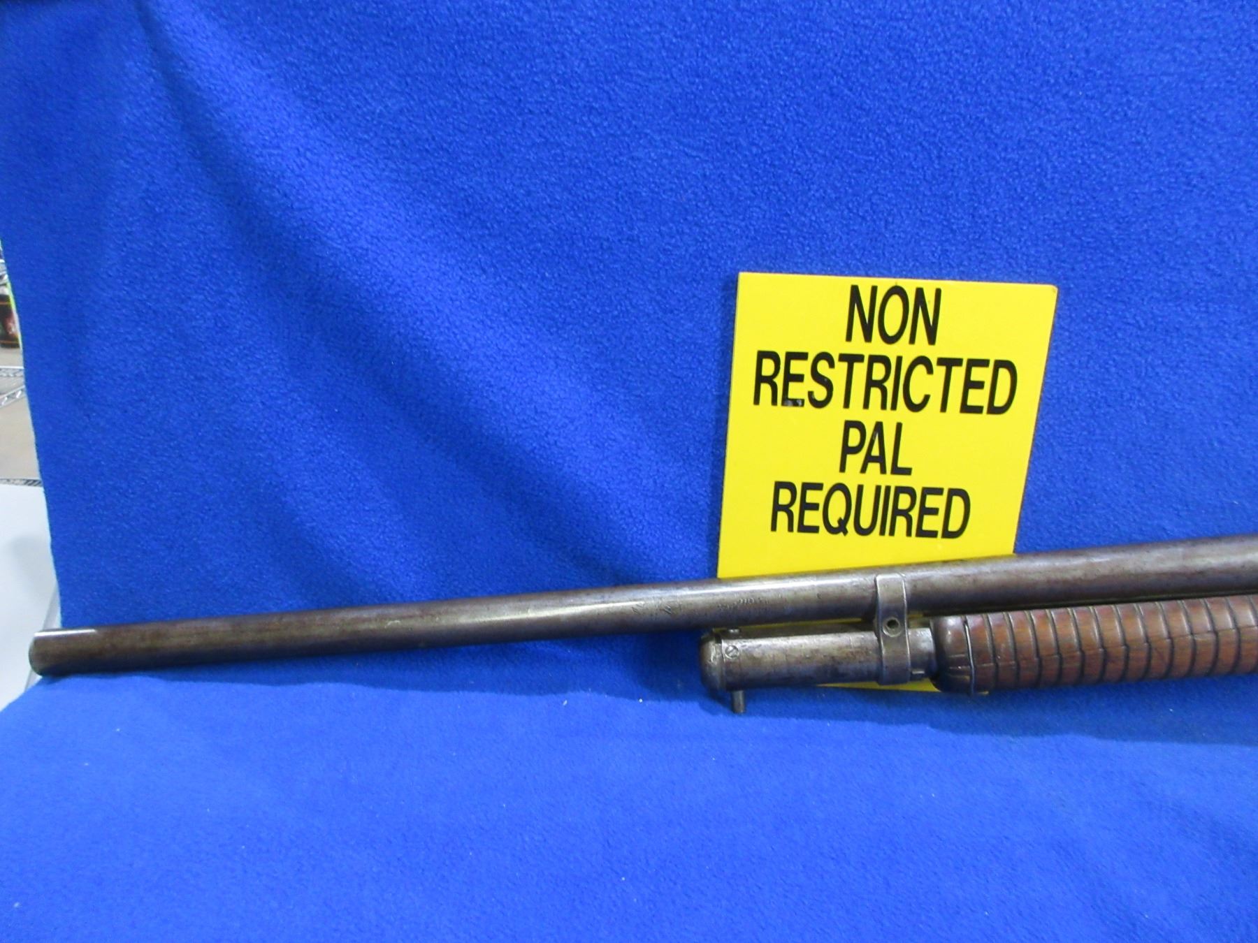 Non-Restricted - Winchester Model 1897 in 12 Ga. 2 3/4" Full - Made in 1900, this is a pump action shotgun, action appears to be in good working order. Barrel is 28 1/4" and appears to have been shortened, bore is fair to good, bluing is turning brown or gone, front bead sight is missing, stock has a major crack repair in the wrist area, forearm has large cracks on both sides, metal butt plate good. Ser # 127516