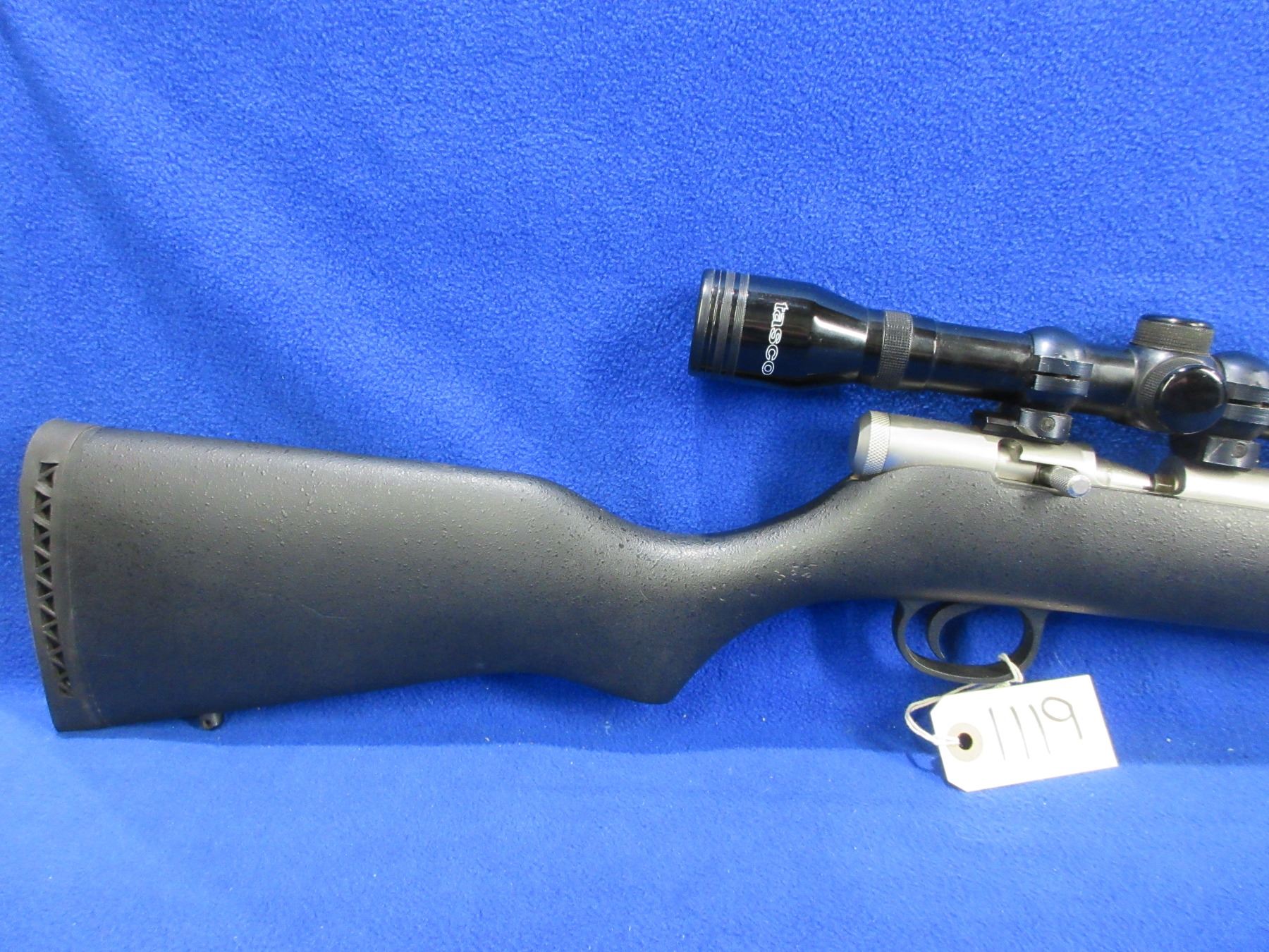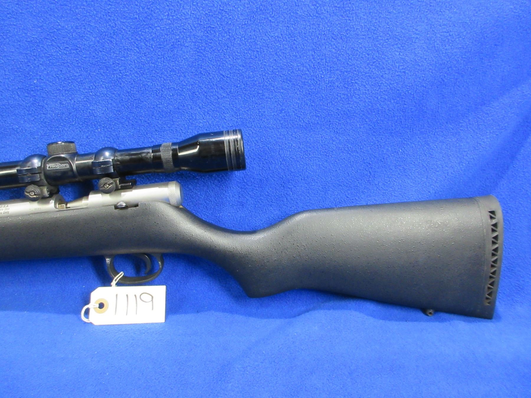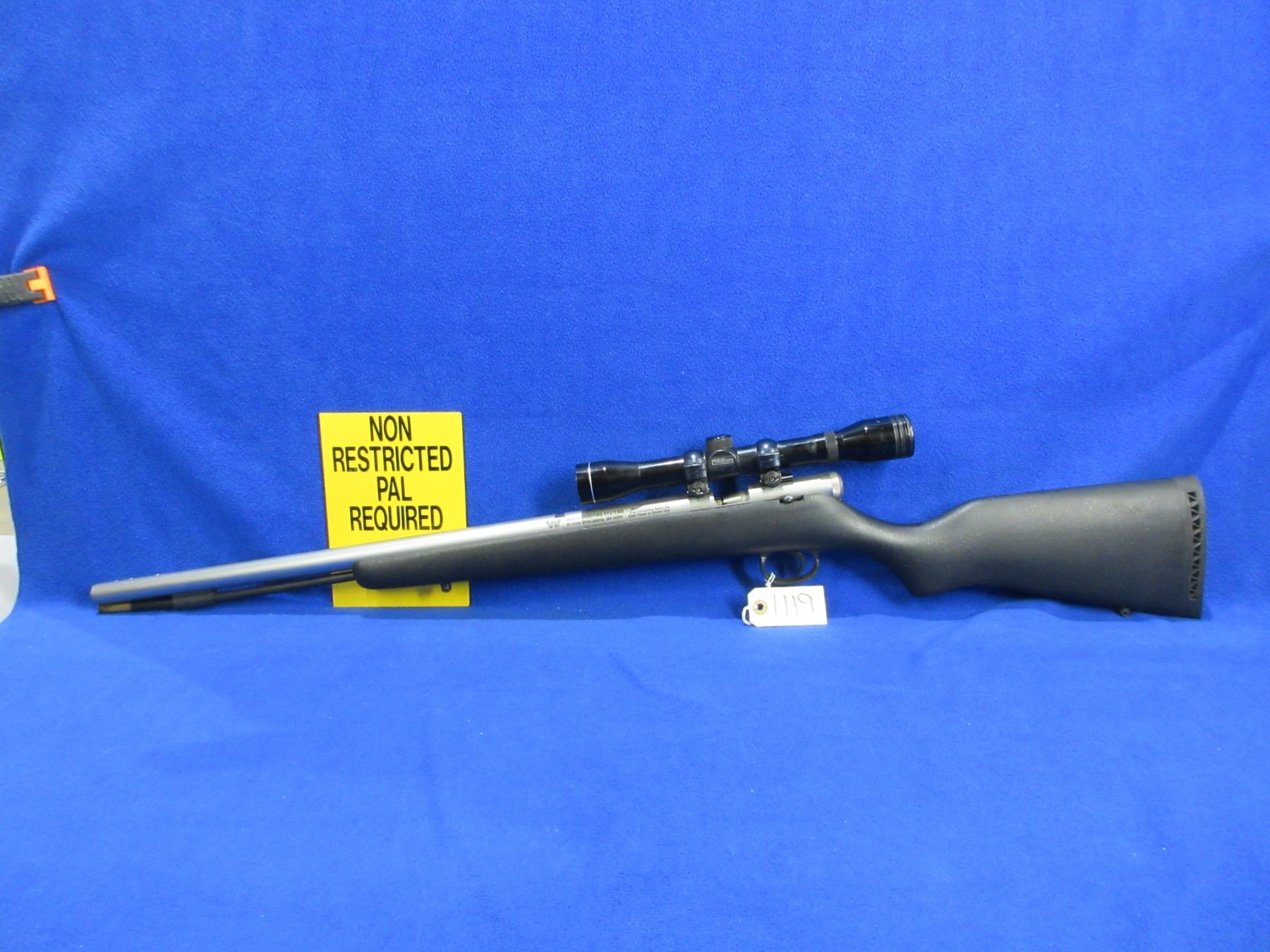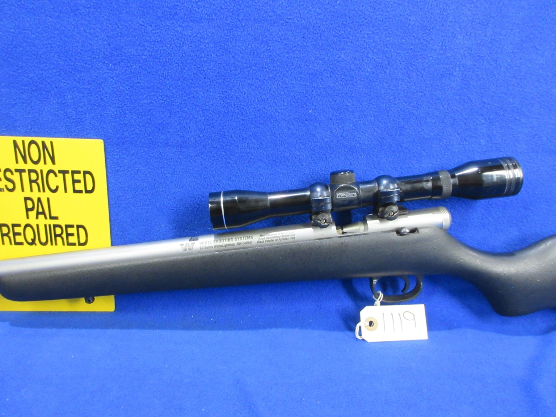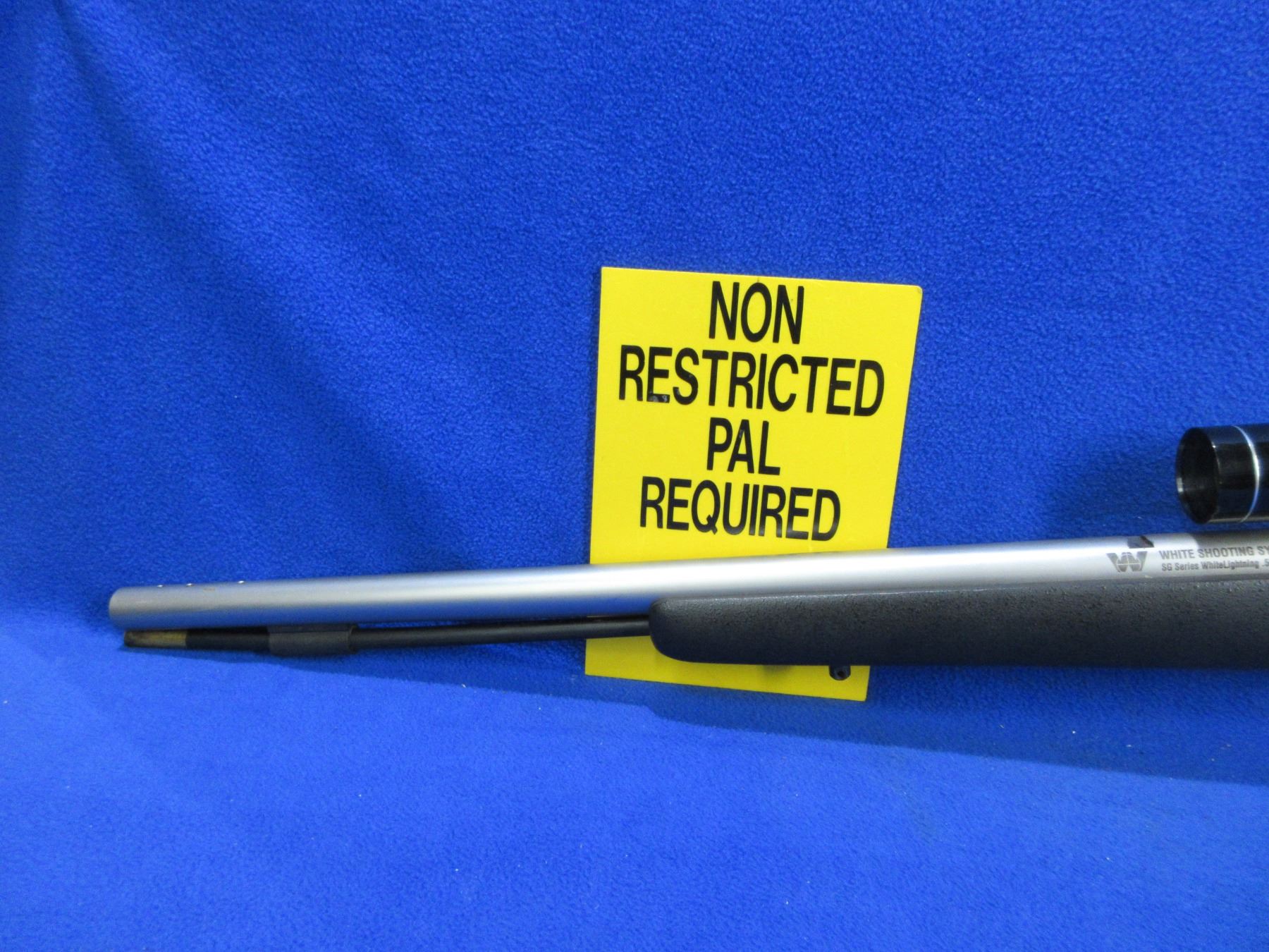 Non-Restricted - White Lightning SG Series in .504 Cal. - This is a muzzleloading percussion cap rifle, action appears to be in good working order. Barrel is 23", rifling appears good to very good, stainless finish is good, sights are missing but has Tasco Pronghorn 4x32 scope - appears clear - duplex reticle, synthetic stock is good to very good with usage marks, rubber recoil pad good, comes with ram rod and swivel studs. Ser # WL2826
