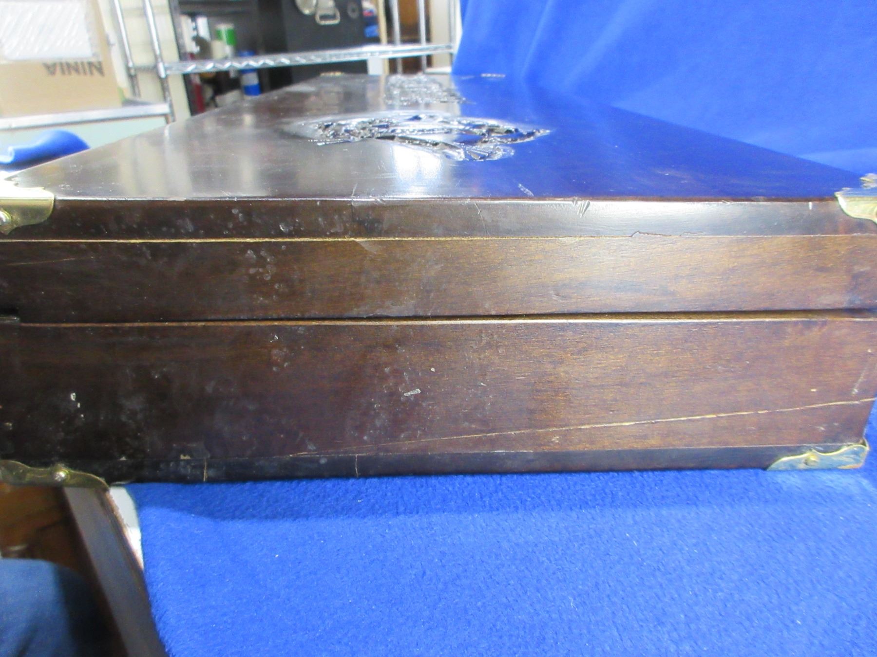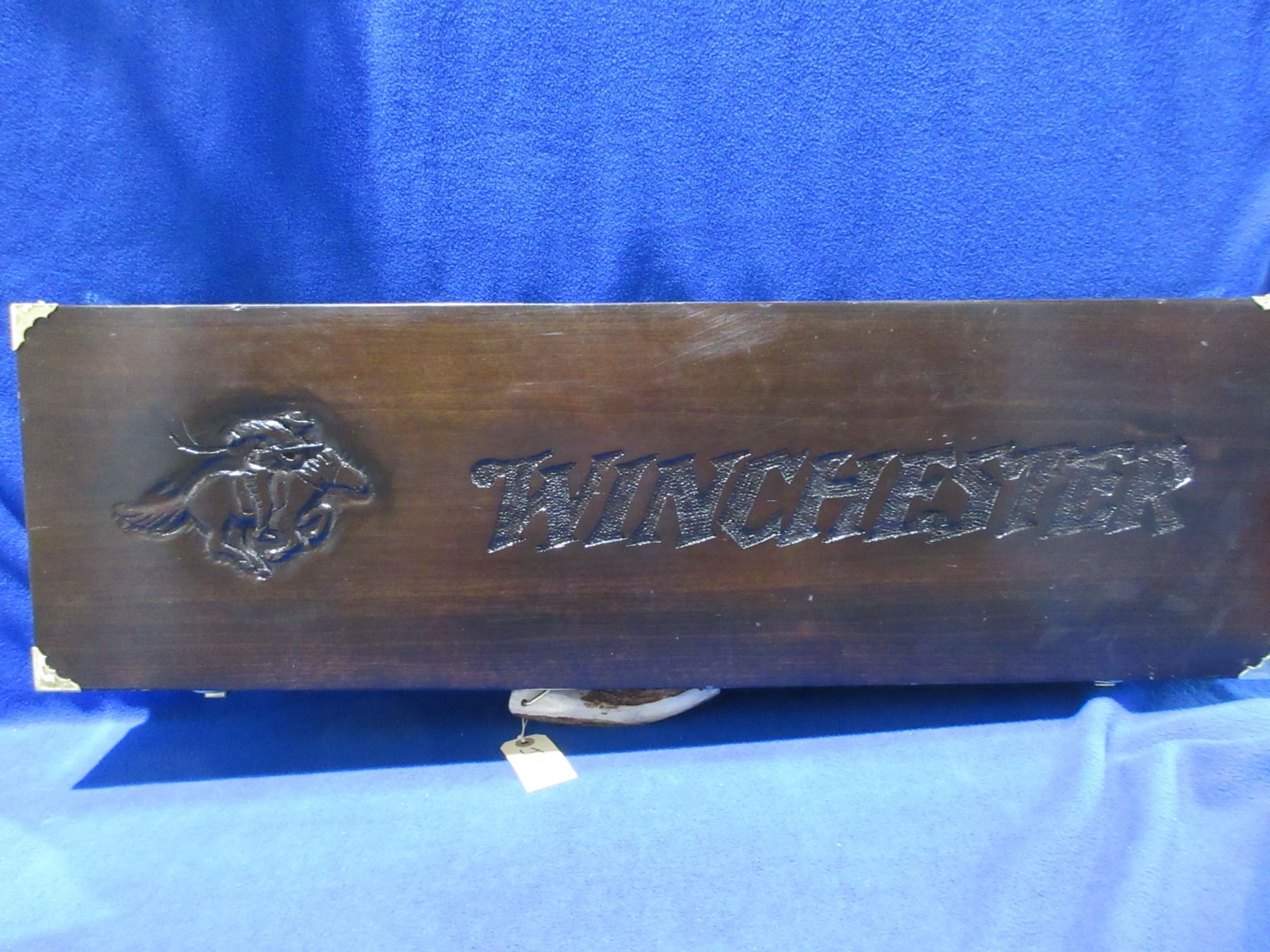 Vintage Wood Winchester Shotgun Case with Antler Handle - 34" x 10 1/2" x 3 1/2 - Case has very nice engraving on the top. Case has drying cracks on the bottom and 1 side