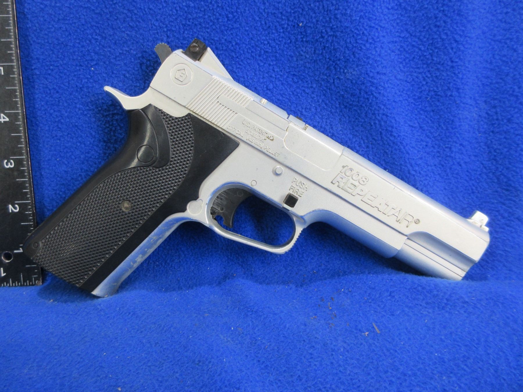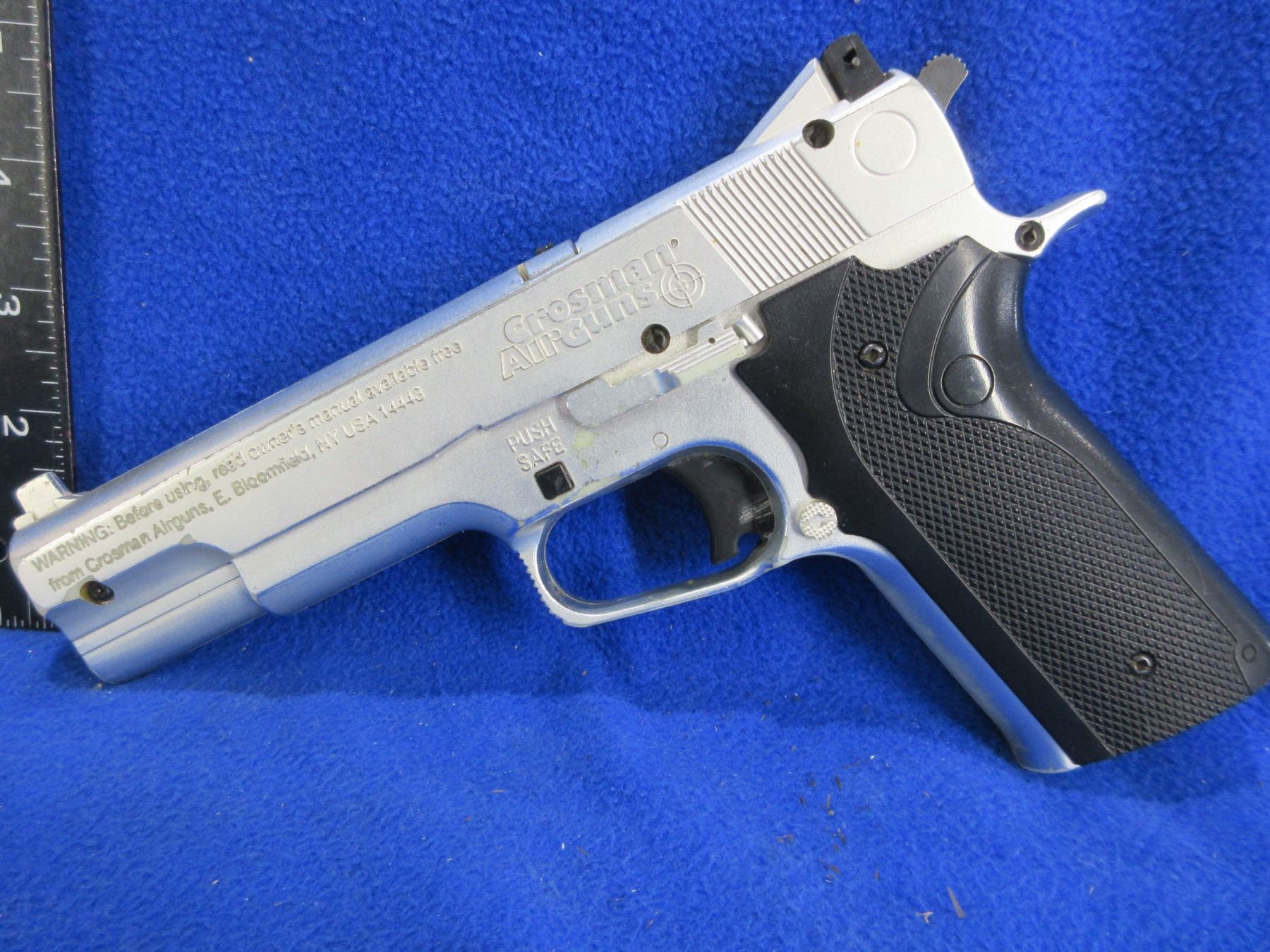 No PAL Required - Crosman 1008 Repeater Pistol in 177 Cal. - This double action semi-auto CO2 pellet pistol appears to be in working order but has not been tested and rotary magazine is missing. Barrel is 4 1/2", rifling is good, finish is good with usage marks, has both sights, grips are good.