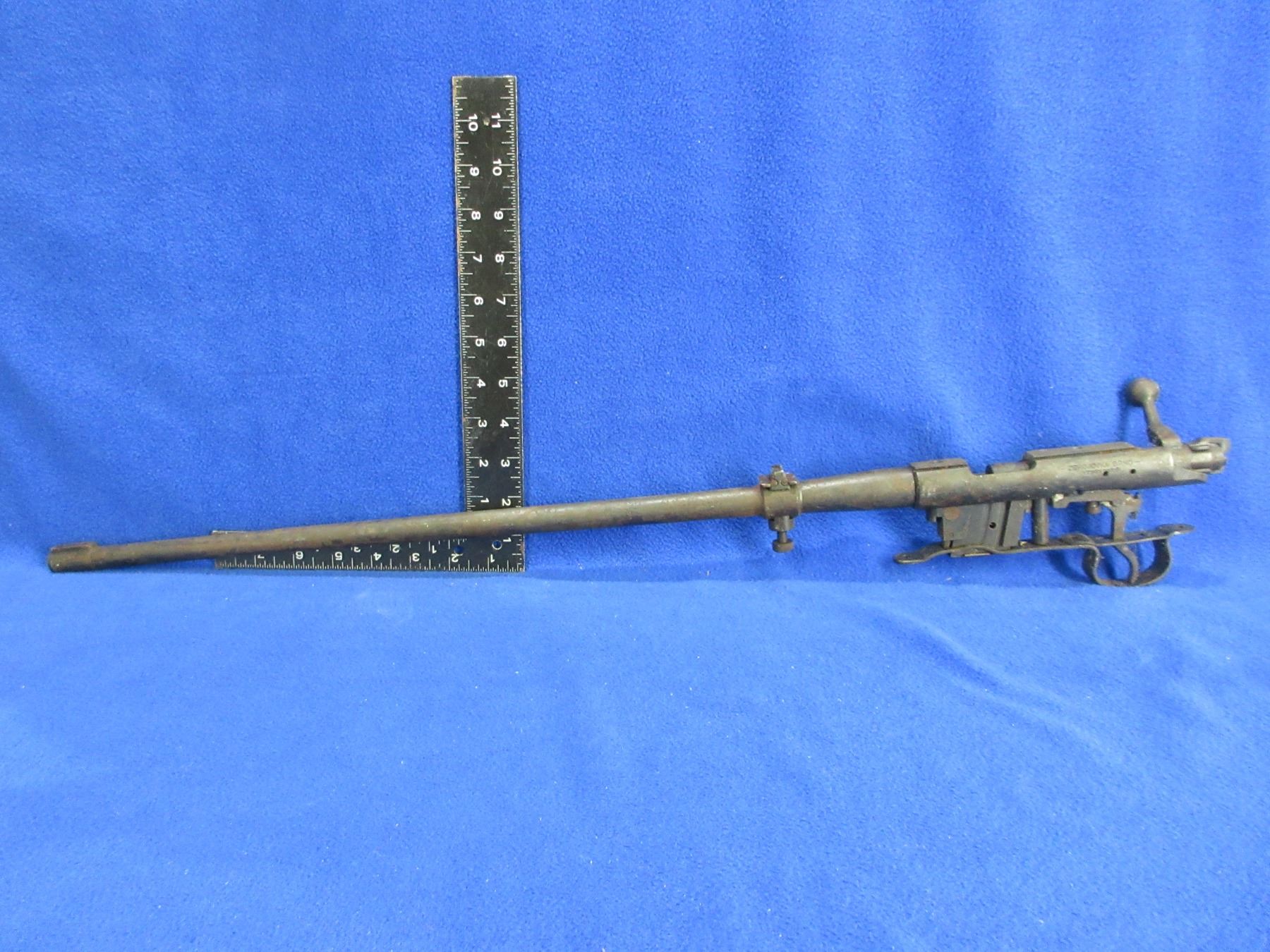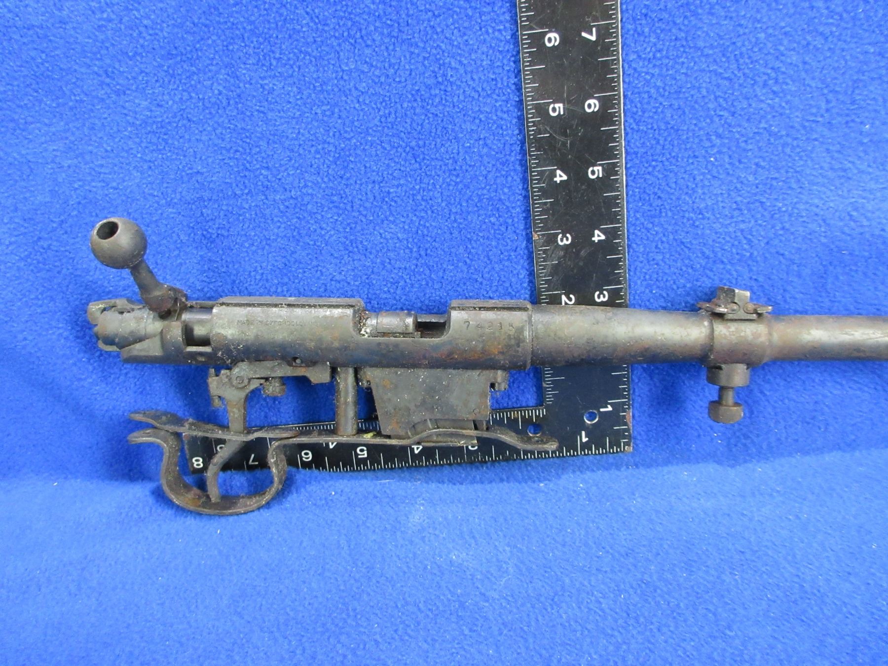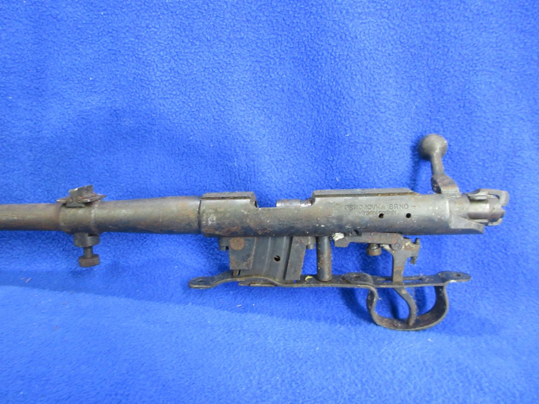 Non-Restricted - Barreled Action - BRNO Model 1 in 22 LR - This is a barrel, action, bolt, trigger/guard and magazine only. Barrel is 23", rifling unknown (has fire damage and needs major cleaning), bluing has rust and pitting, has rear sight. Ser # 74215