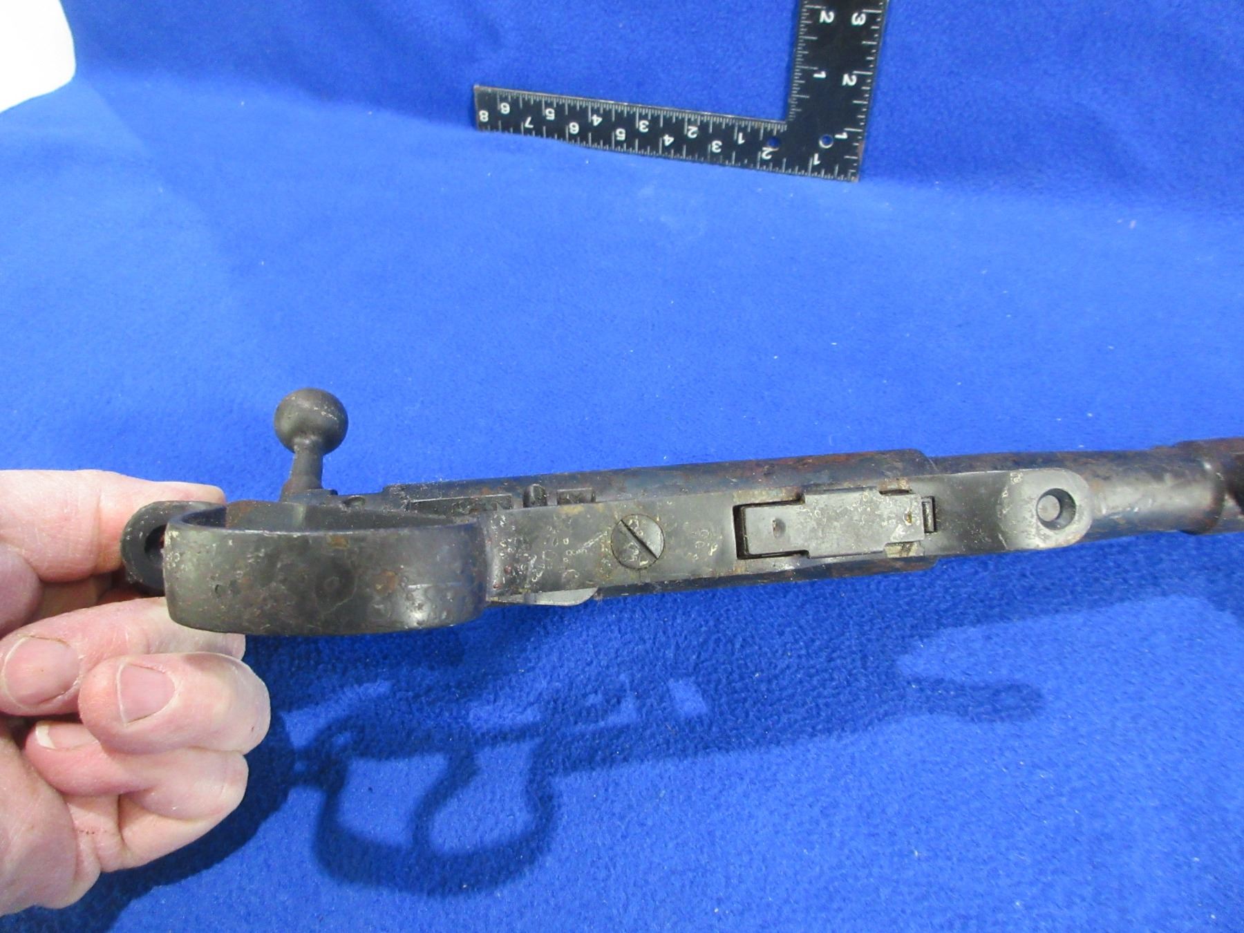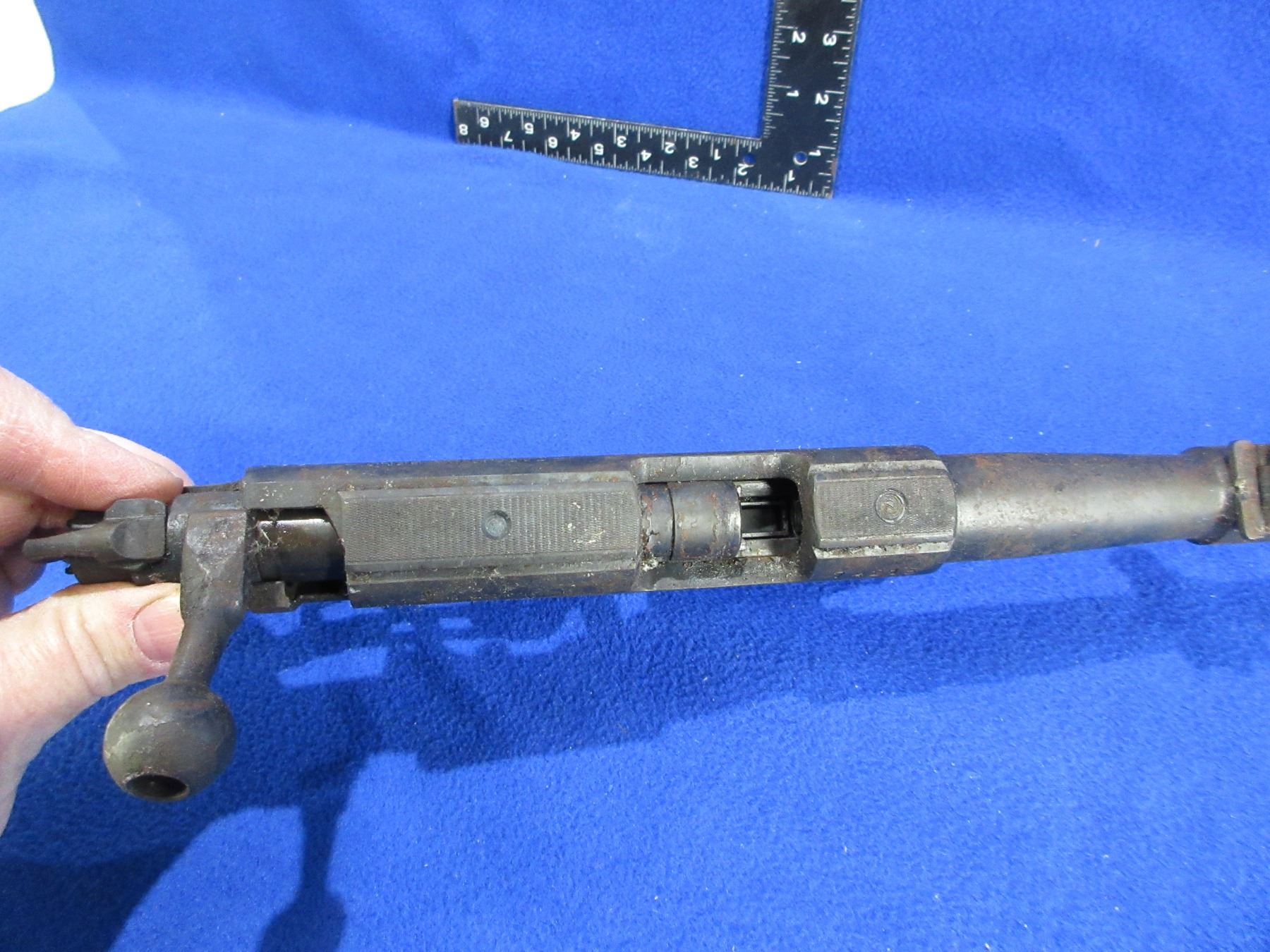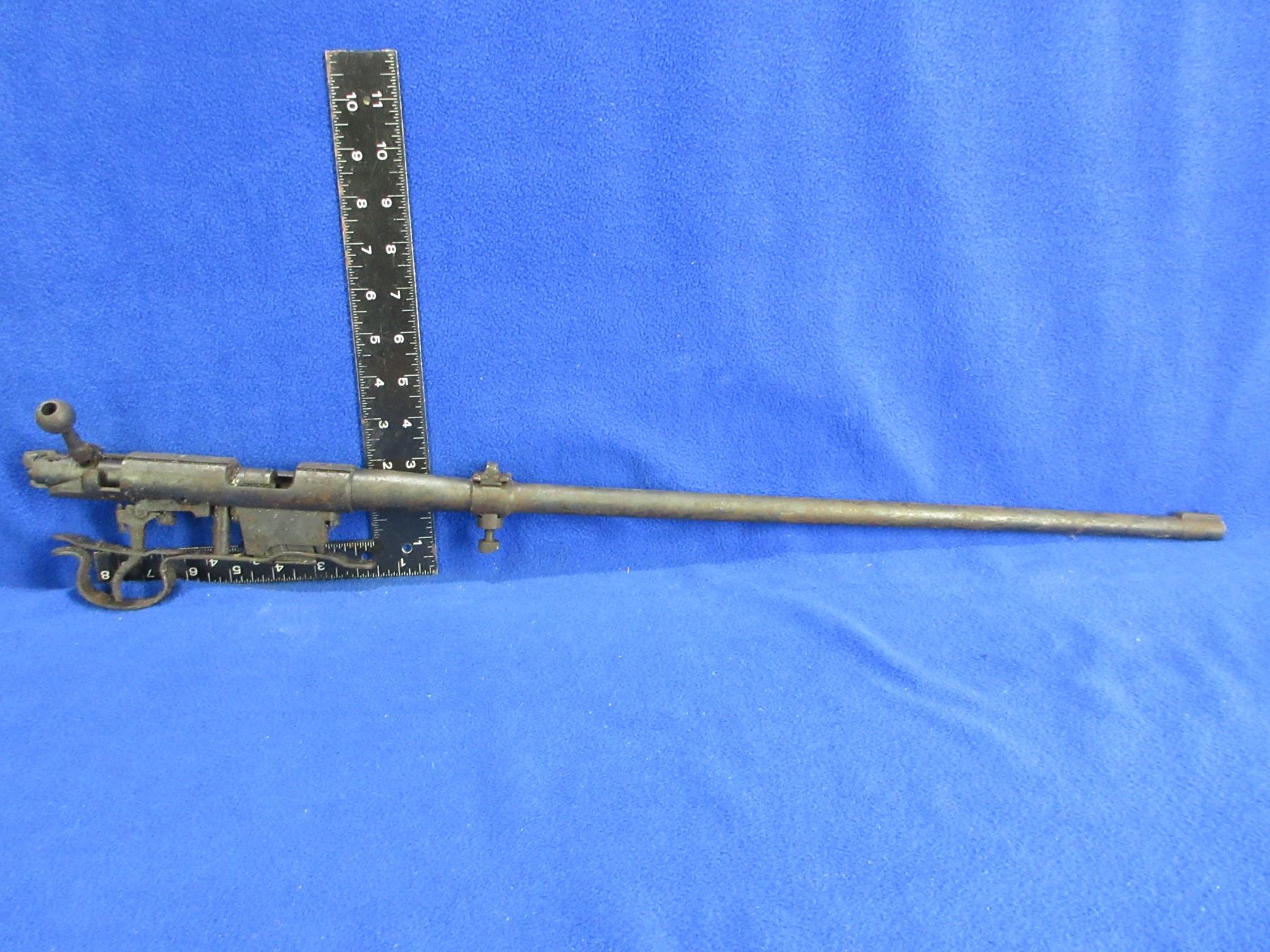 Non-Restricted - Barreled Action - BRNO Model 1 in 22 LR - This is a barrel, action, bolt, trigger/guard and magazine only. Barrel is 23", rifling unknown (has fire damage and needs major cleaning), bluing has rust and pitting, has rear sight. Ser # 74215