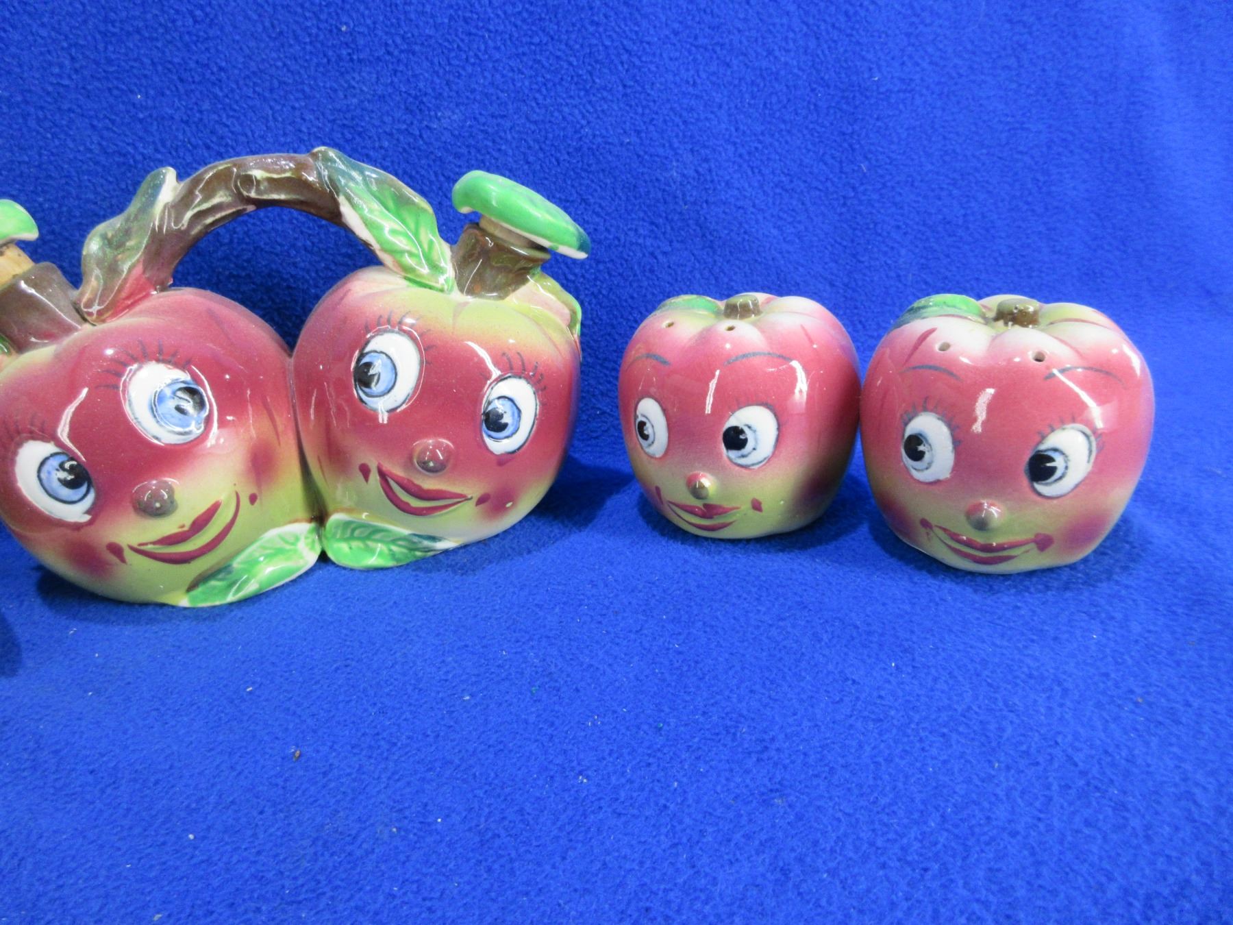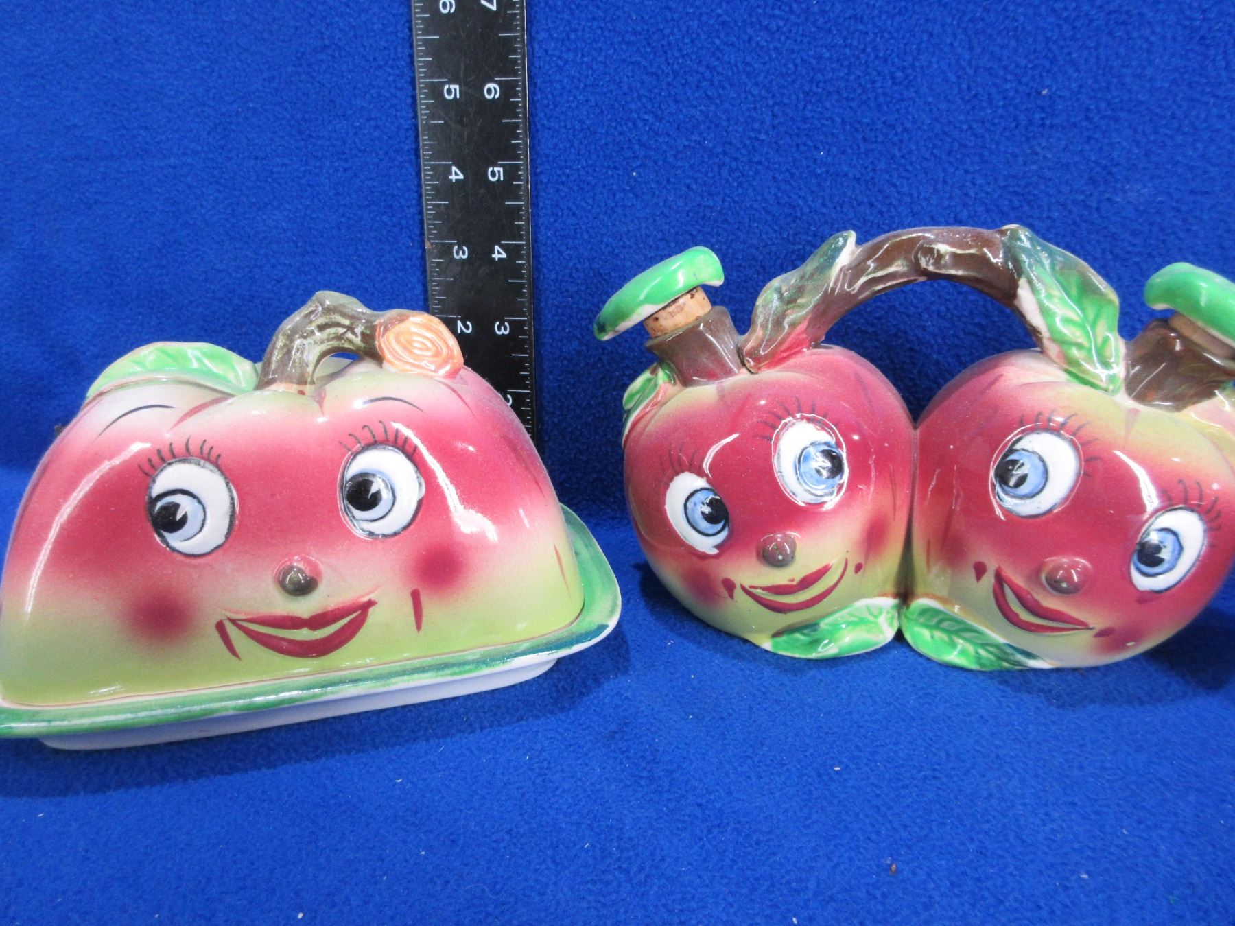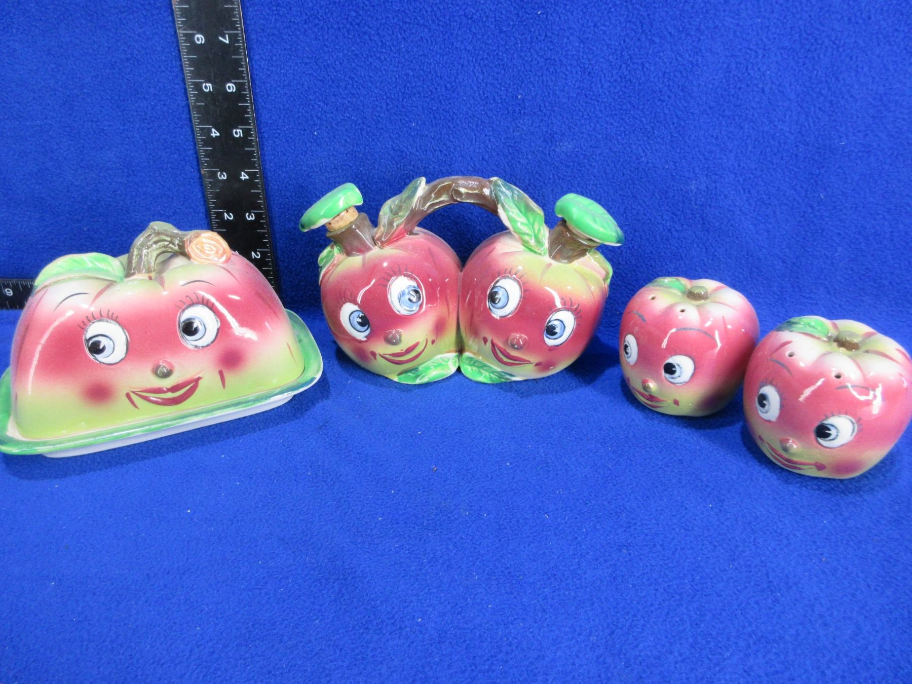 Vintage Ceramic Salt & Pepper Shakers, Butter Dish with Lid and Oil & Vinegar Server - Apple Face Motif