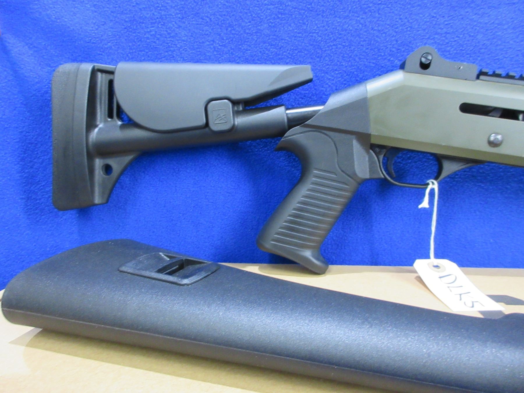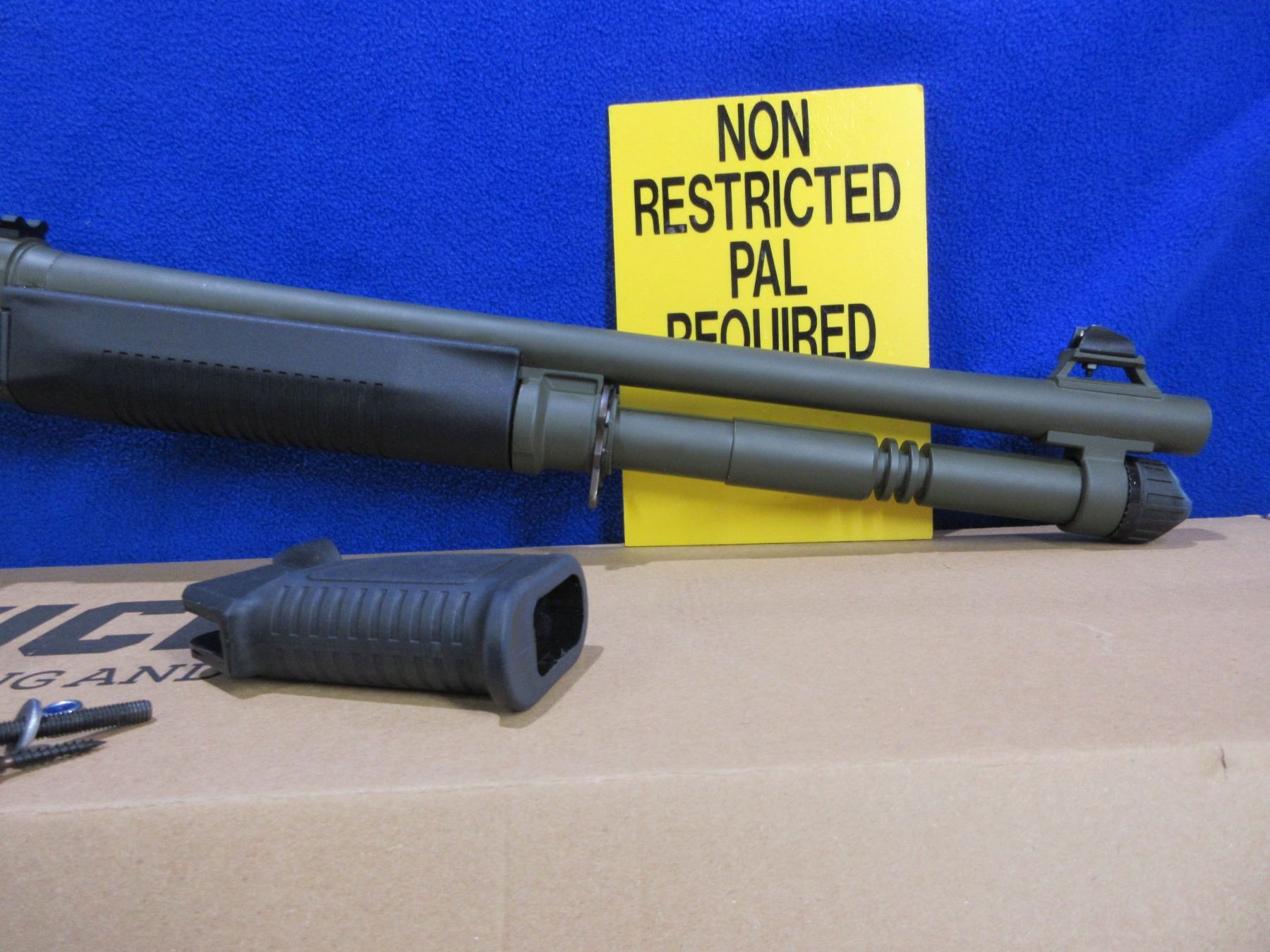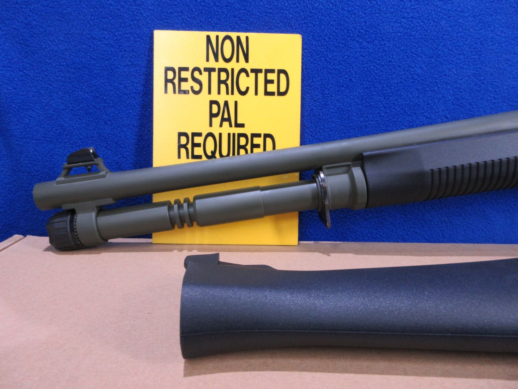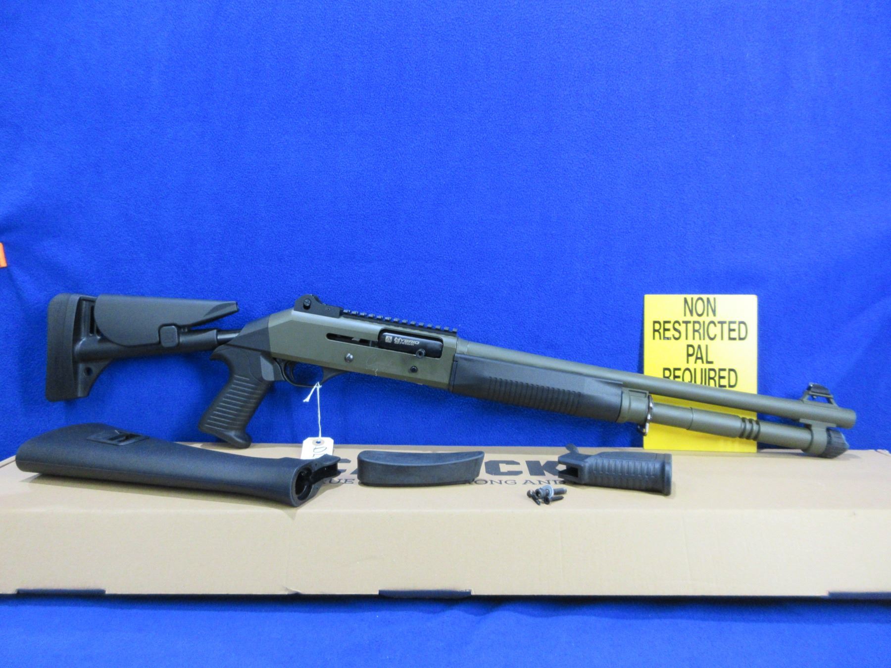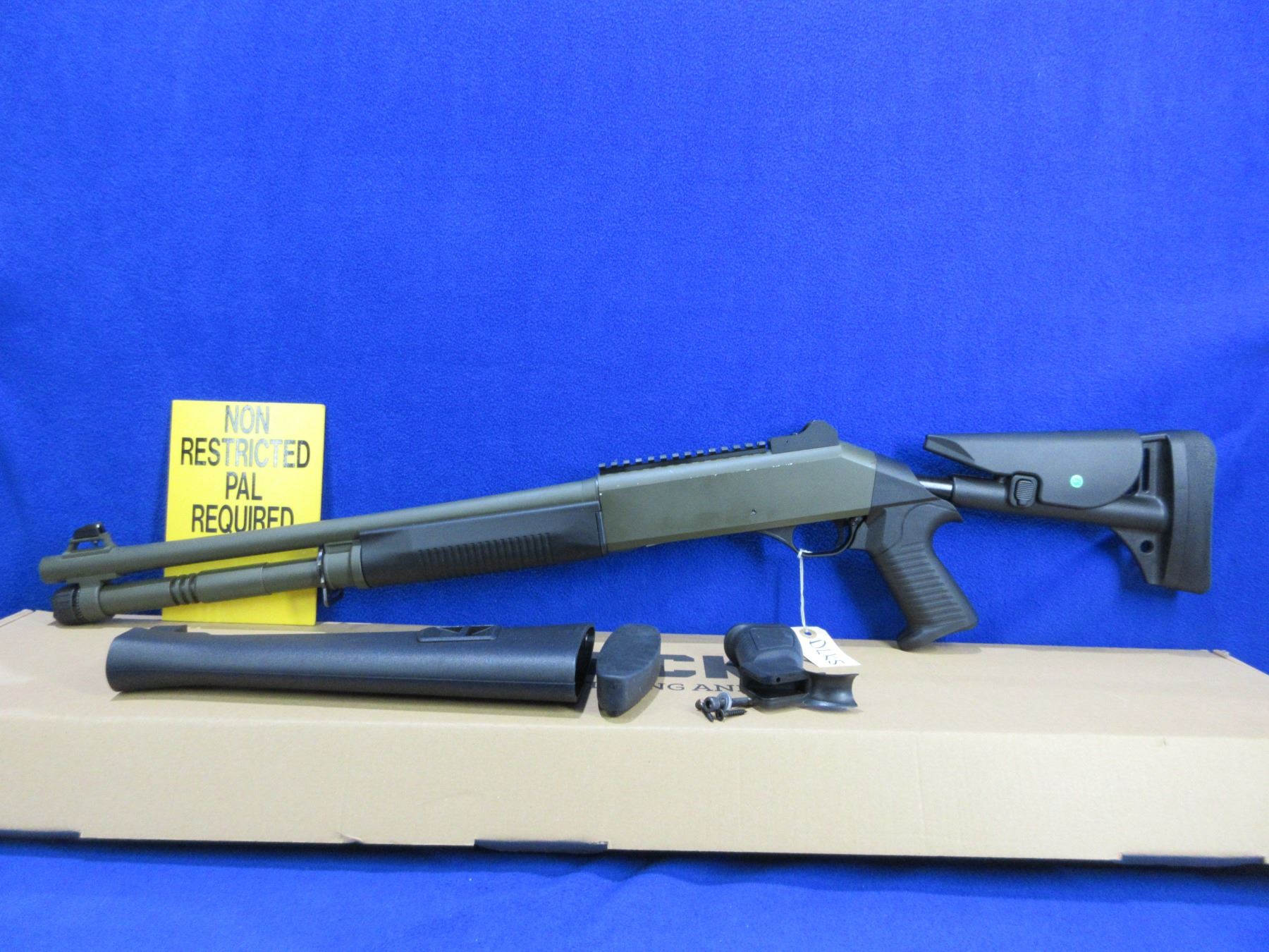 Non-Restricted - Canuck Elite Operator in 12 Ga. 3" - This is a semi-auto shotgun with removable choke, action appears to be in good to very good working order. Barrel is 18.6", bore is good to very good, green finish is good with some light scratches, has both sights and picatinny rail, adjustable synthetic stock with pistol grip is very good, synthetic forearm is very good, rubber recoil pad good, comes with swivels, synthetic stock, pistol grip, rubber recoil pad and original box. Ser #H23YT-001674