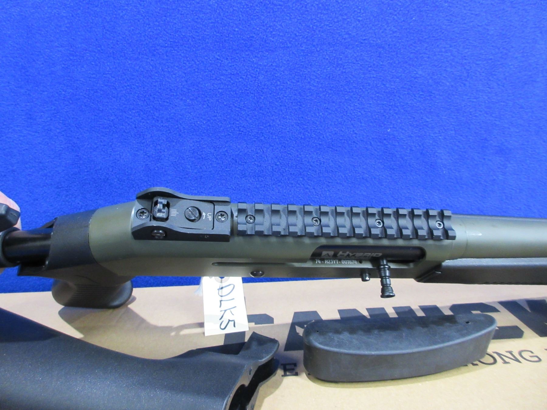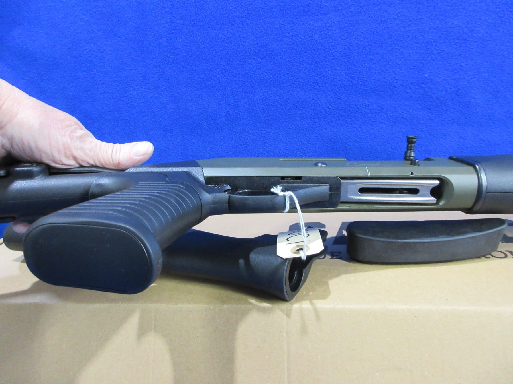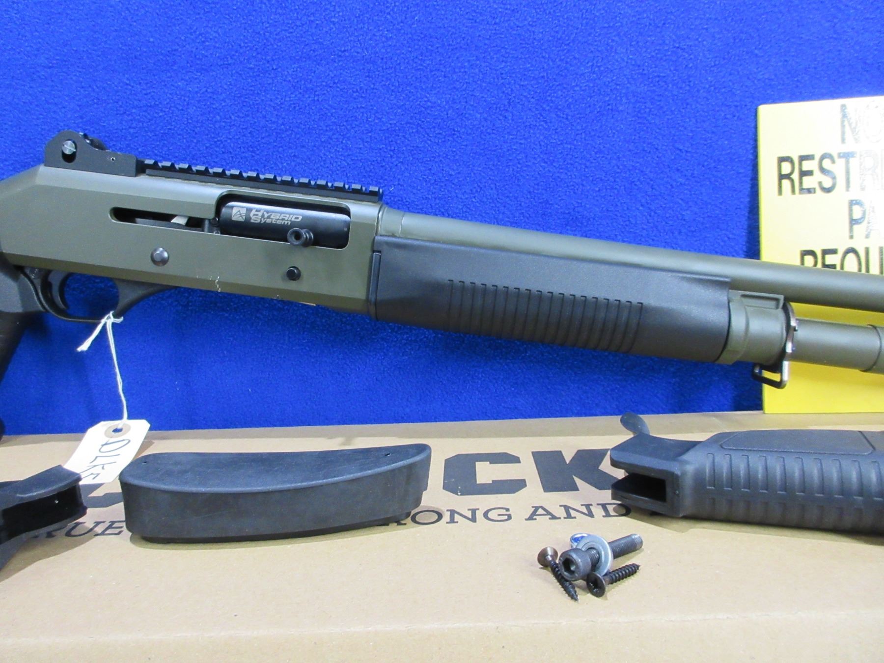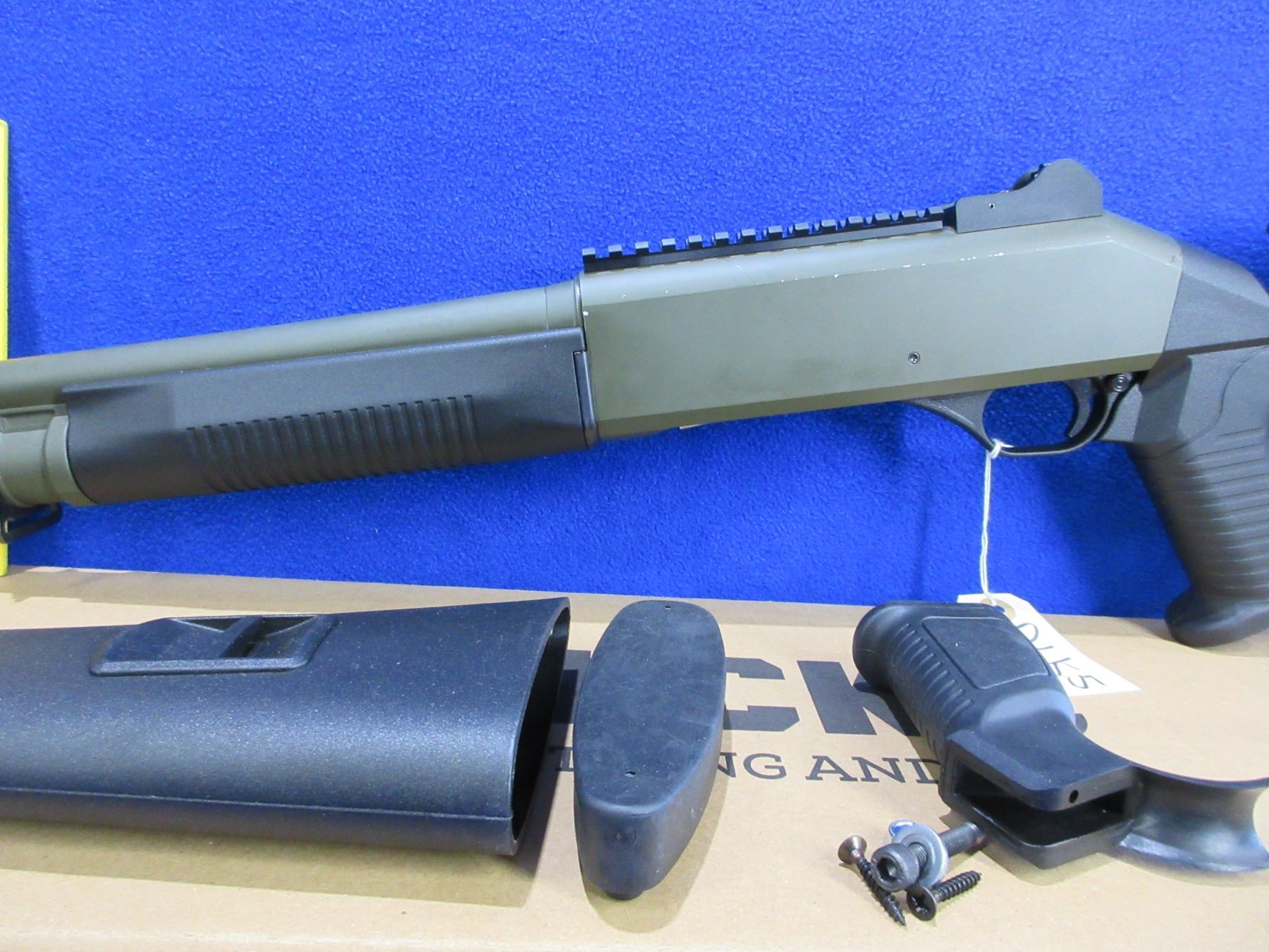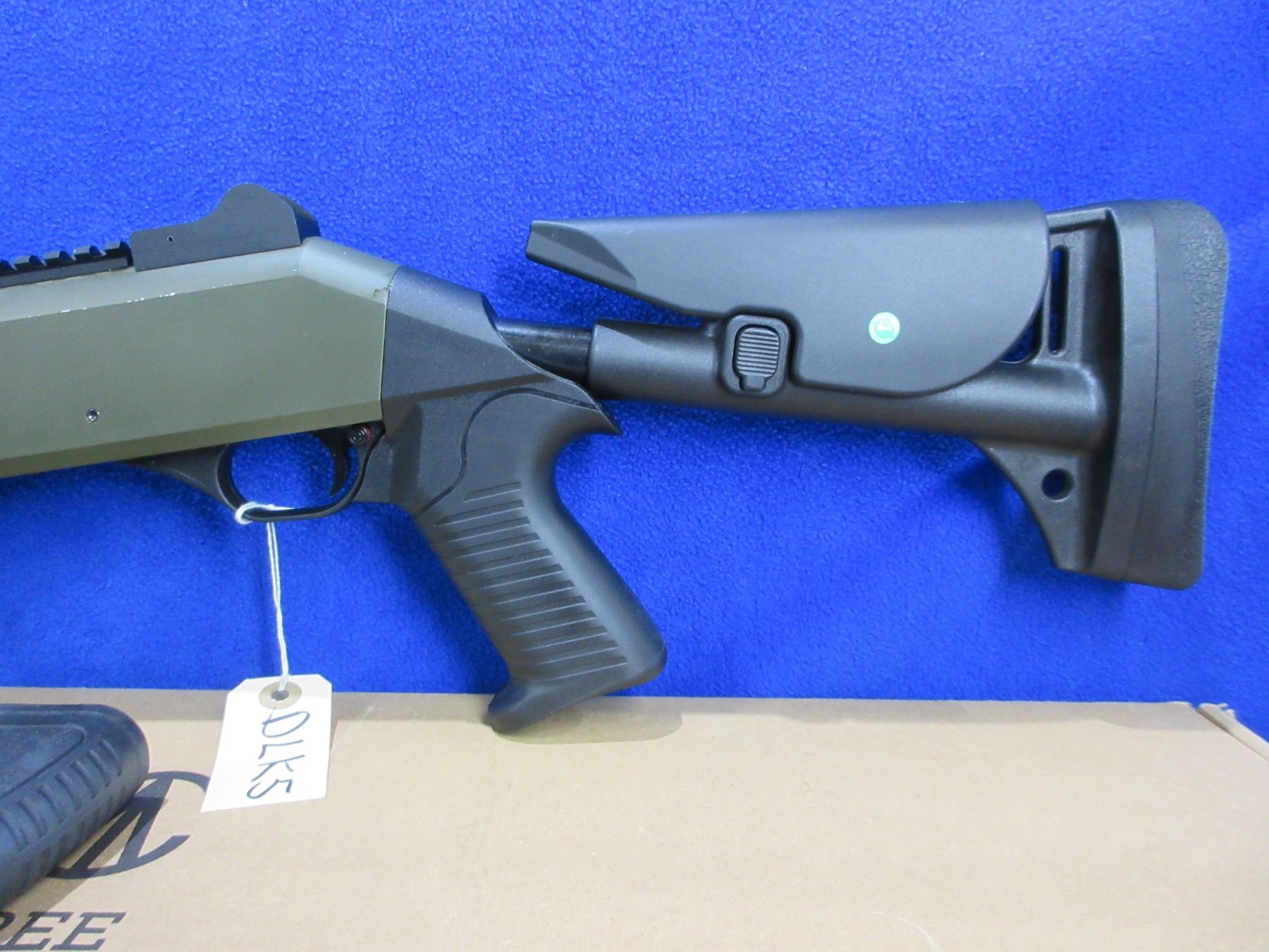 Non-Restricted - Canuck Elite Operator in 12 Ga. 3" - This is a semi-auto shotgun with removable choke, action appears to be in good to very good working order. Barrel is 18.6", bore is good to very good, green finish is good with some light scratches, has both sights and picatinny rail, adjustable synthetic stock with pistol grip is very good, synthetic forearm is very good, rubber recoil pad good, comes with swivels, synthetic stock, pistol grip, rubber recoil pad and original box. Ser #H23YT-001674