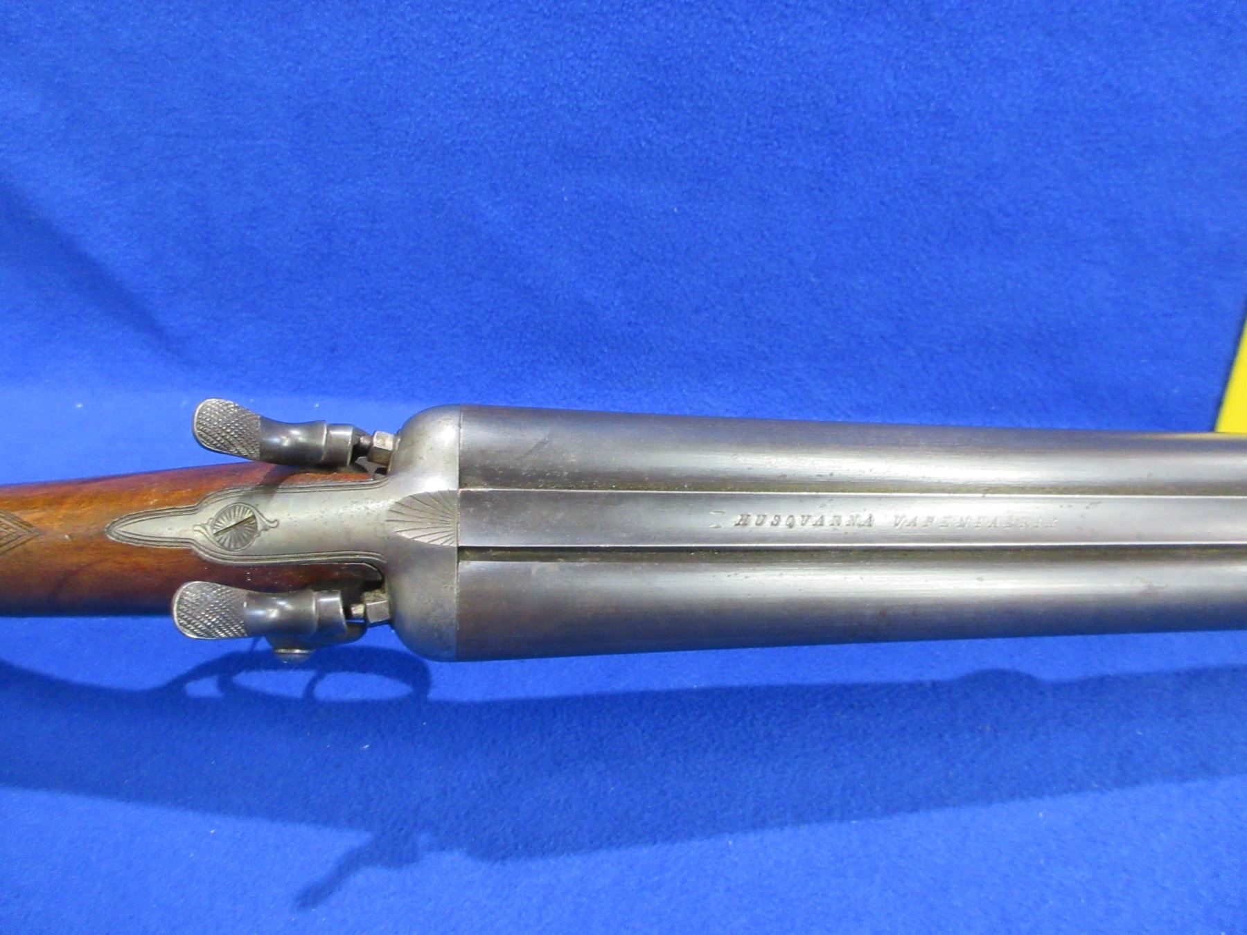 Non-Restricted - Husqvarna SXS in 12 Ga. 2 1/2" - This is a tip up SXS hammer under lever shotgun, action is tight and appears to be in good to very good working order. Barrels are 29 1/2", bores are good, bluing is good with some light pitting, has bead front sight, stock has a 1/4" hairline crack behind the upper tang, butt plate missing, comes with swivels. Ser # 81956