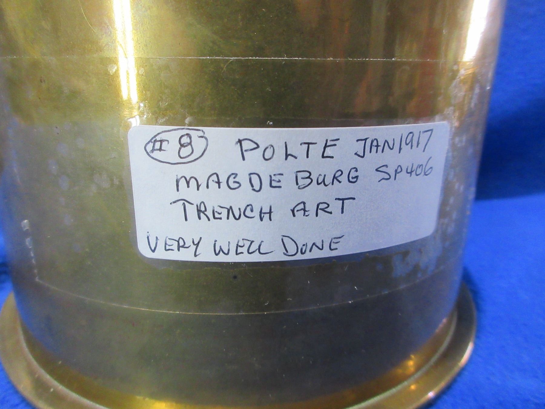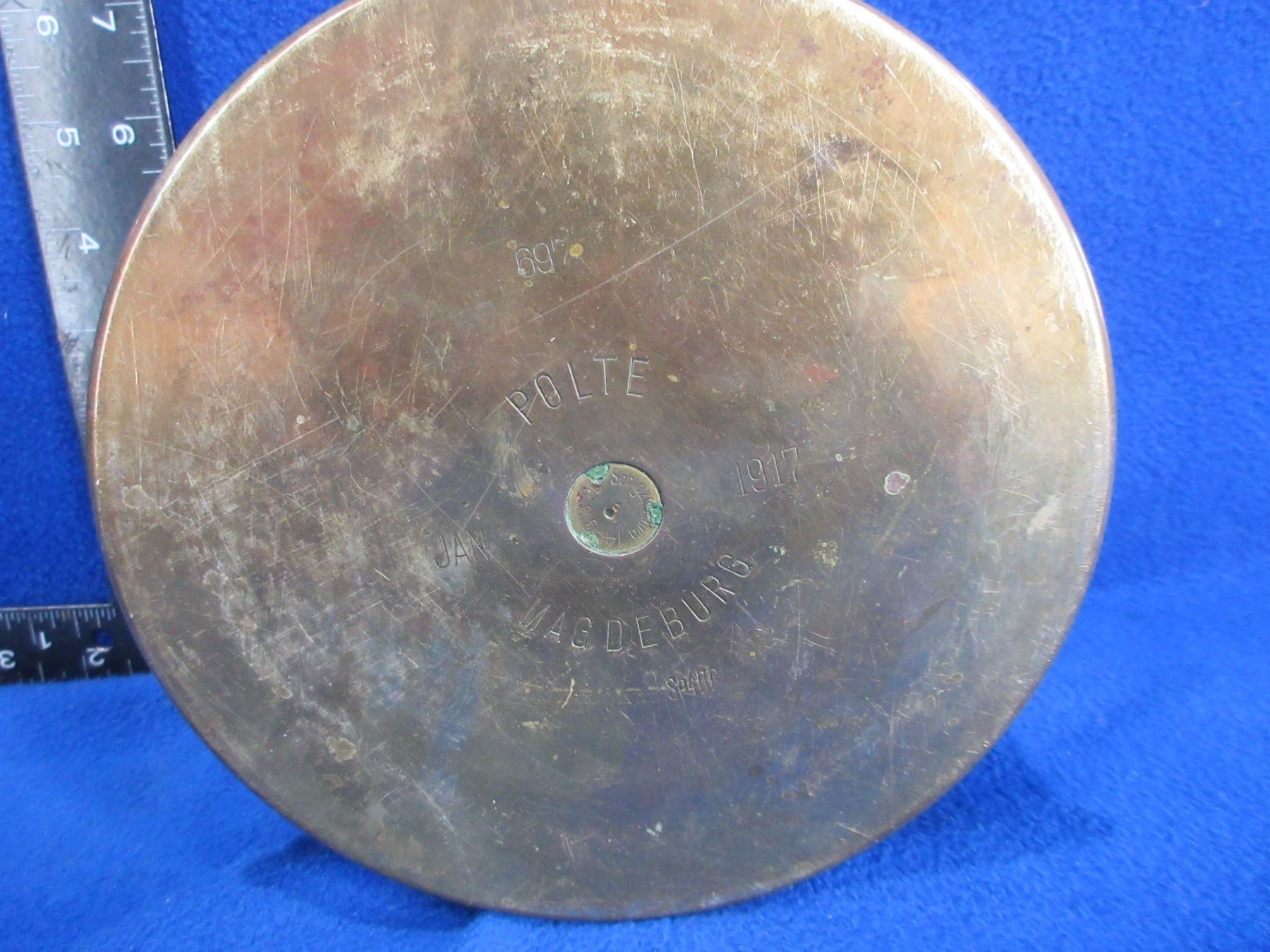 Brass Shell Casing Trench Art - 6 1/2" Base x 4 3/8" High - Marked "Polte Jan 1917 Magdeburg SP406"