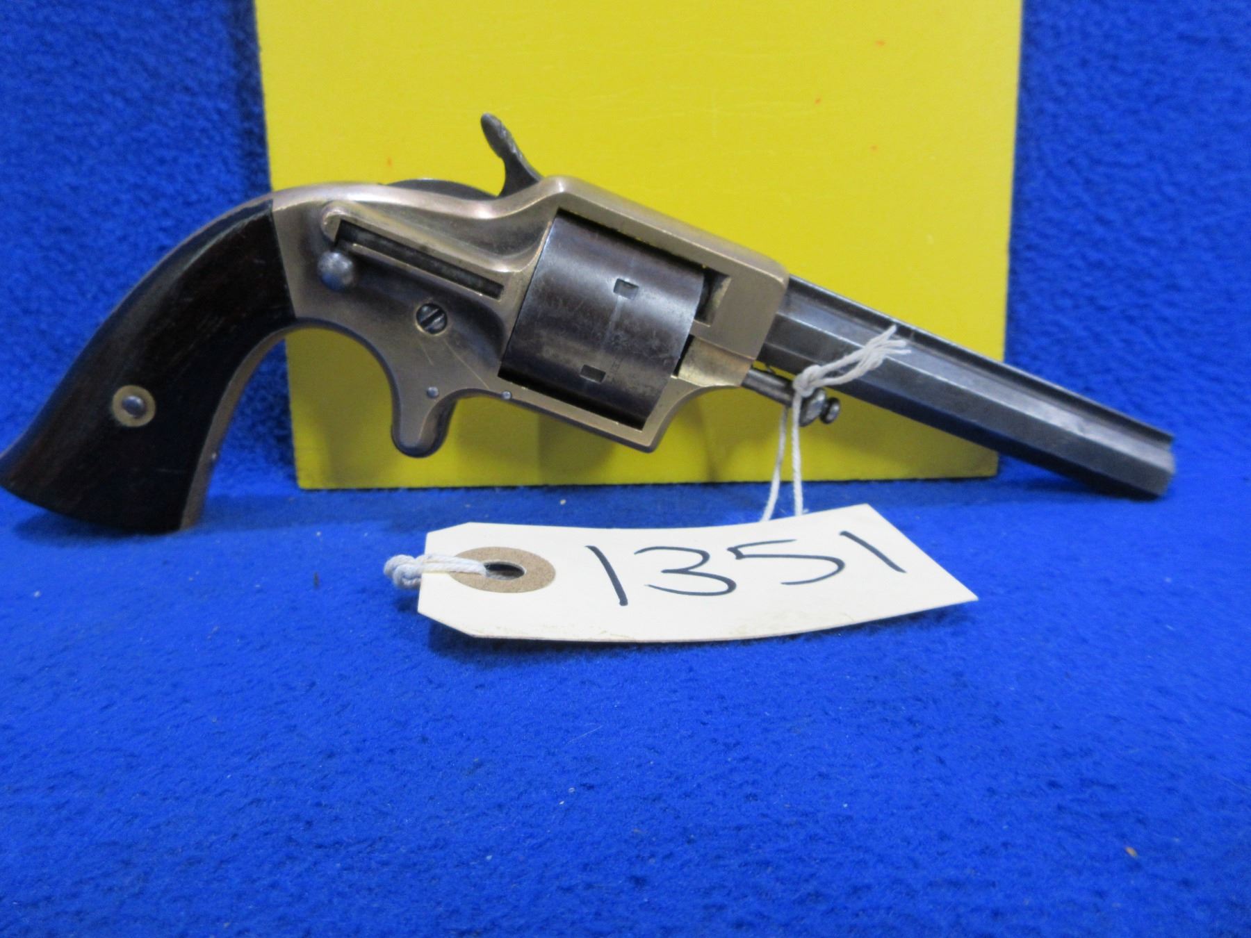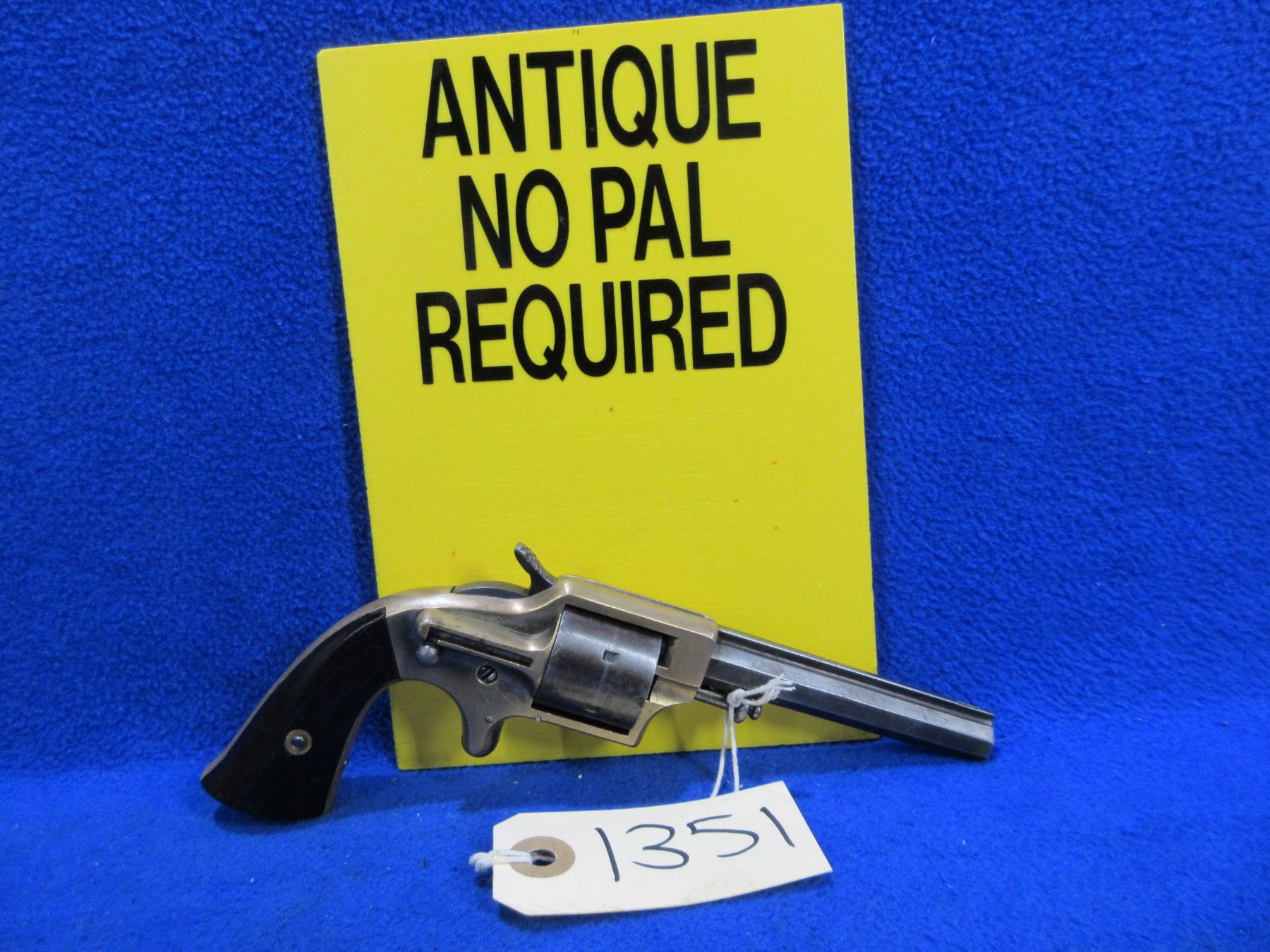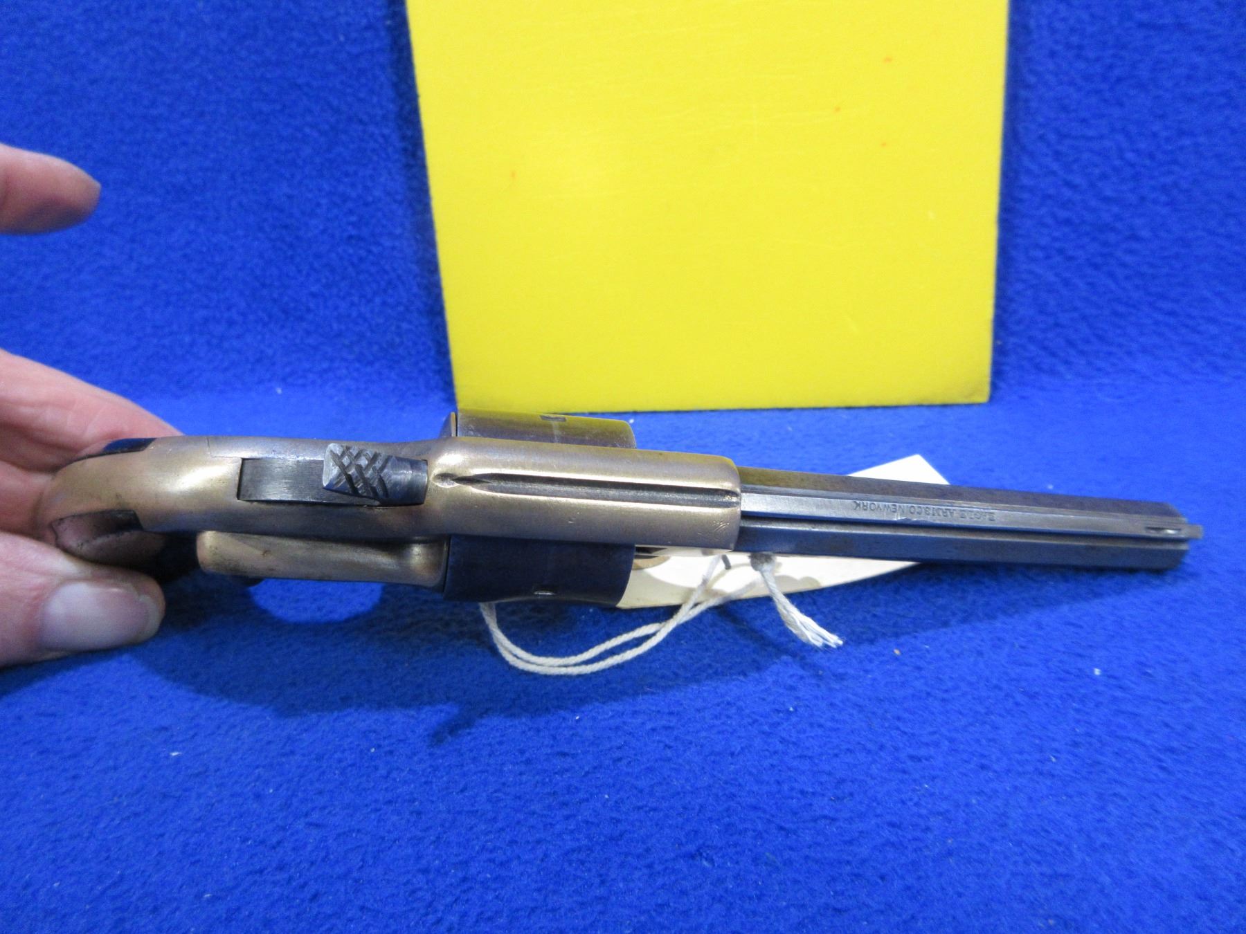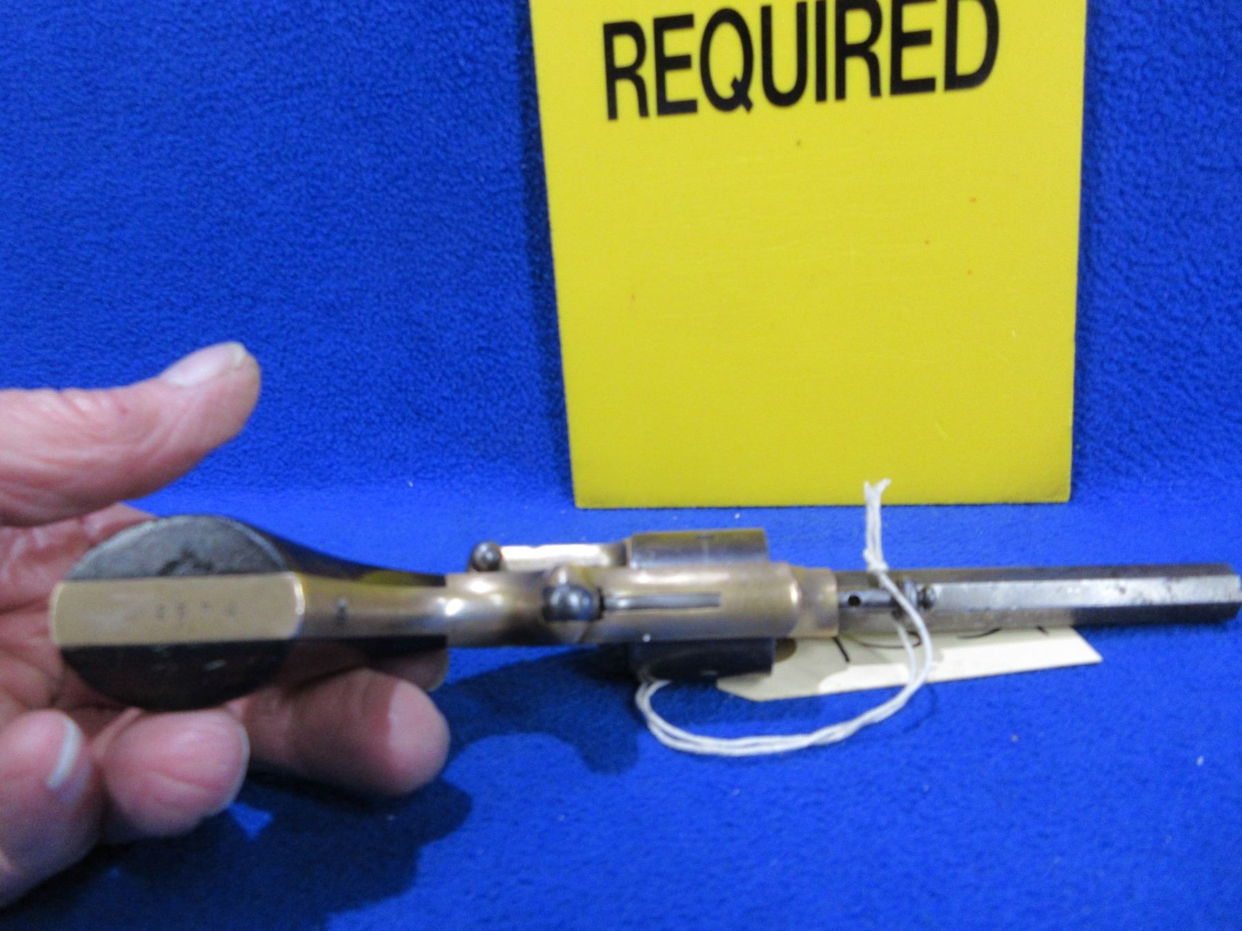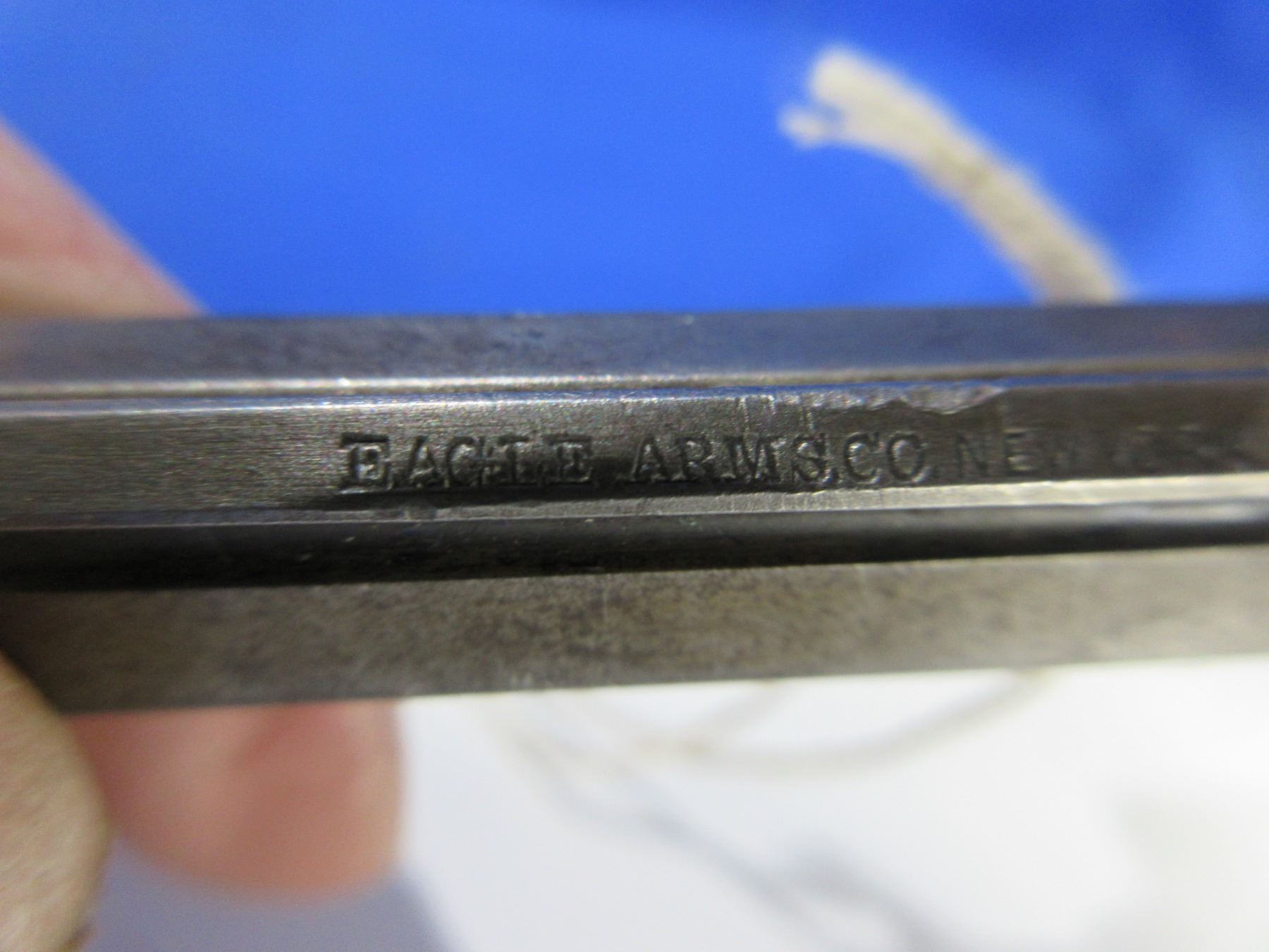 Antique - No PAL Required - Eagle Arms New York Cup Fire in 30 Cal - Rare and desireable, this is a six shot single action front loading revolver , action appears to be in working order but the indexing of the cylinder does not work (hammer locks cylinder but does not turn it). Blued cylinder is turning brown and marked "Patented July 12, 1859 & July 21, 1863" Octagon barrel is 3.5". rifling appears good, bluing on barrel is gone, has integral rear sight, front sight missing, wood grips are good. Ser # 2452