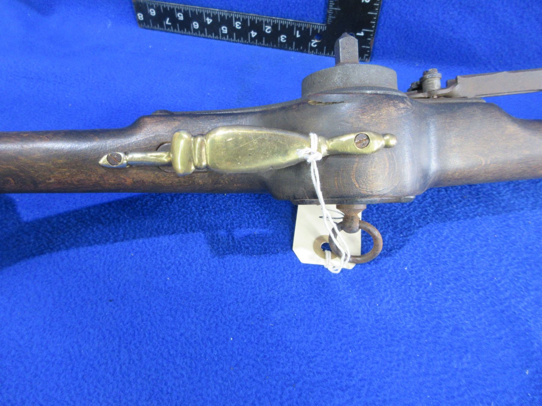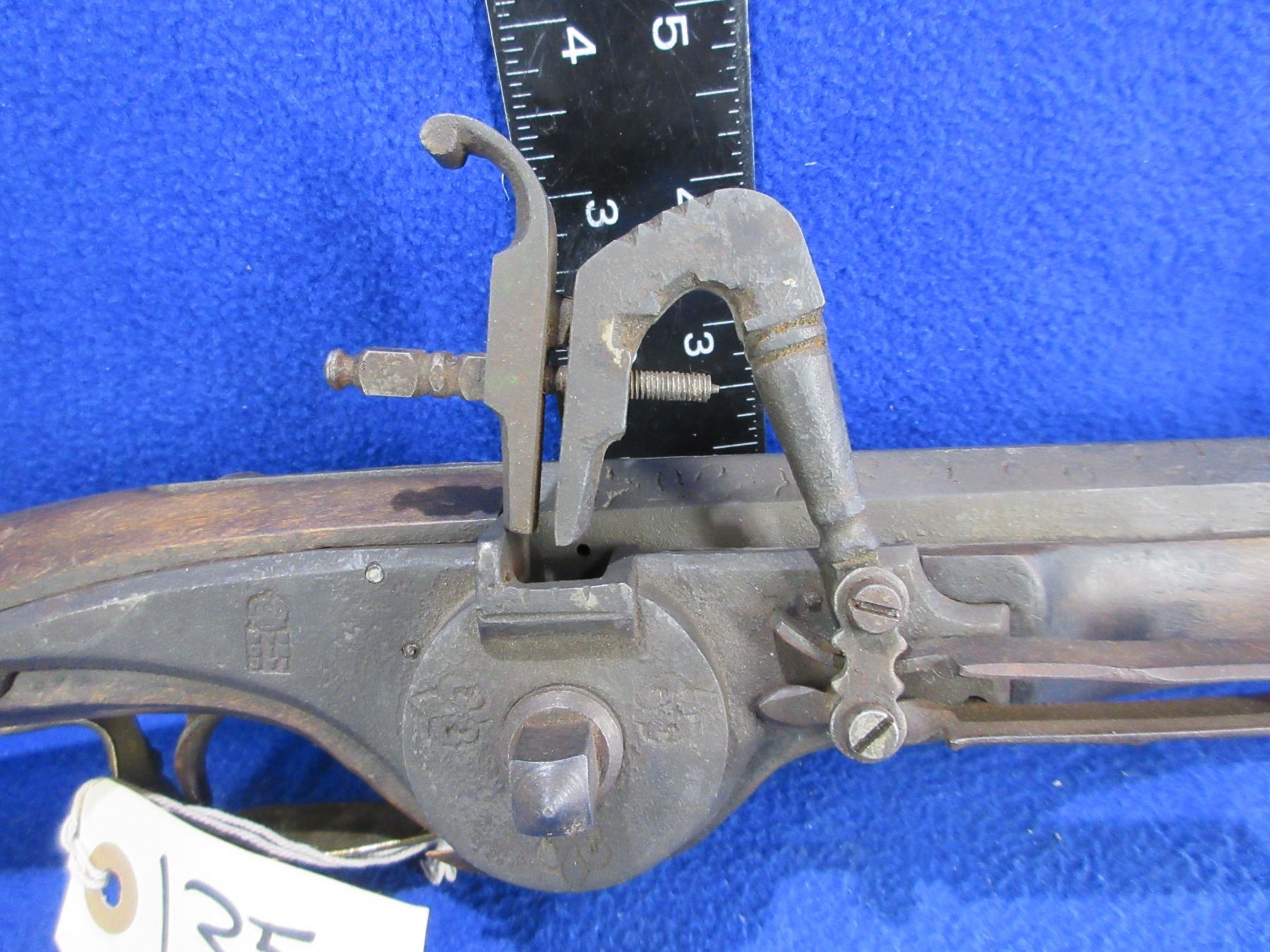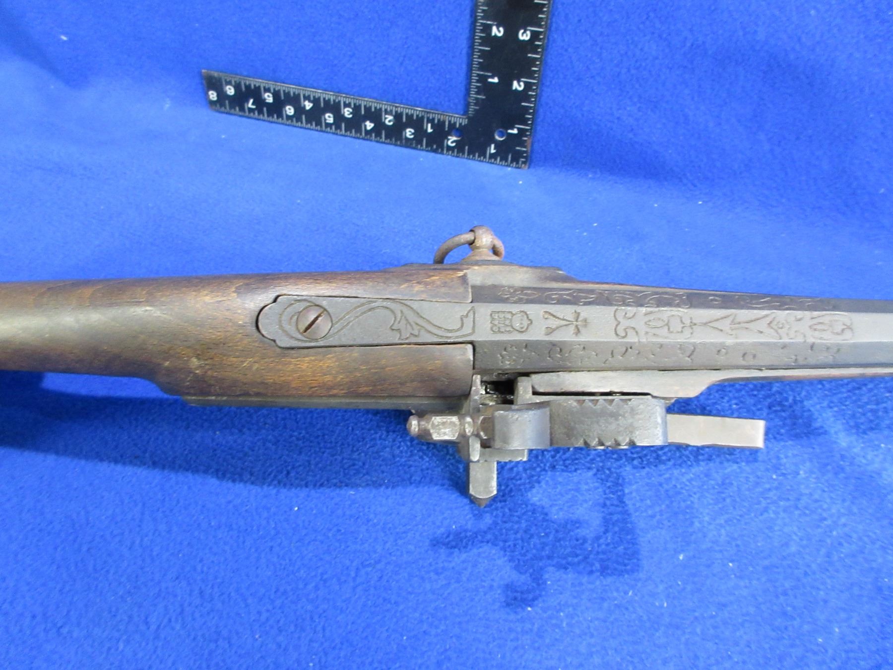 Replica Wheel Lock Flint Pistol in Approx. 50 Cal. - This Wheel Lock Flint Pistol is a Replica. 14 1/2" barrel. Wheel lock mechanism does turn. The lock and barrel are engraved. Brass trigger guard, butt plate and other brass furniture are good. Stock is good for age, comes with ram rod and lanyard ring.