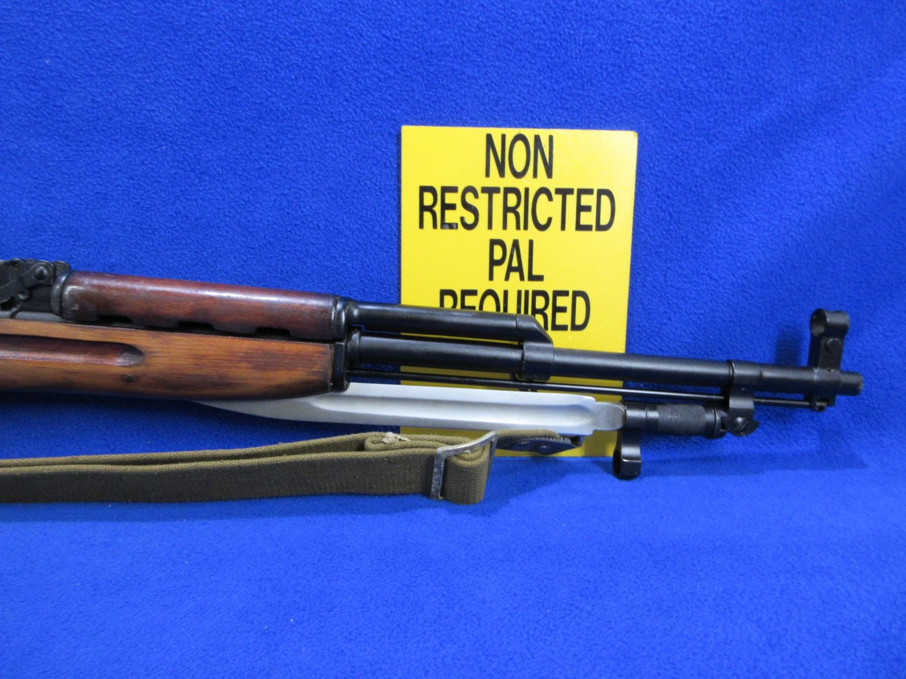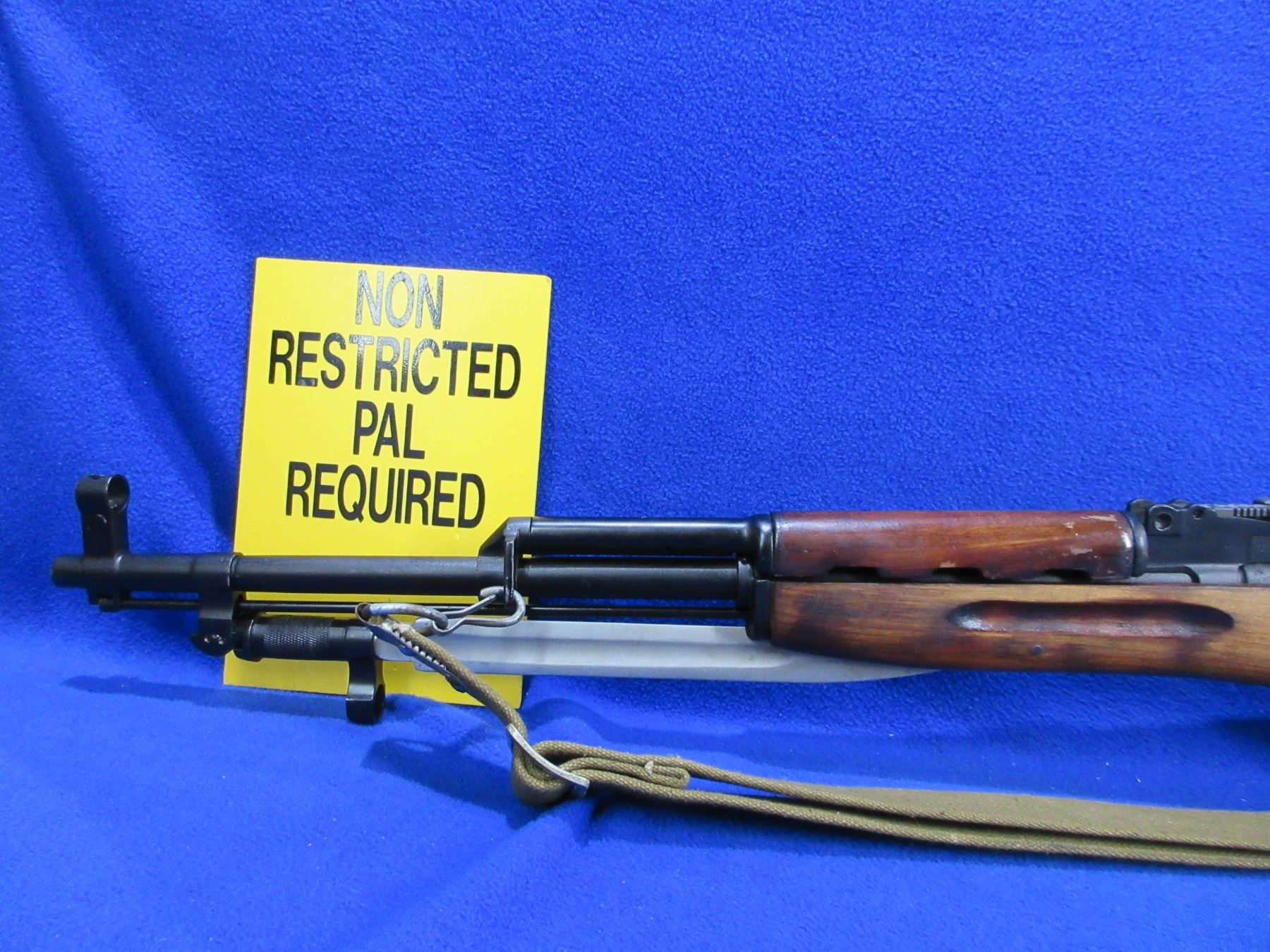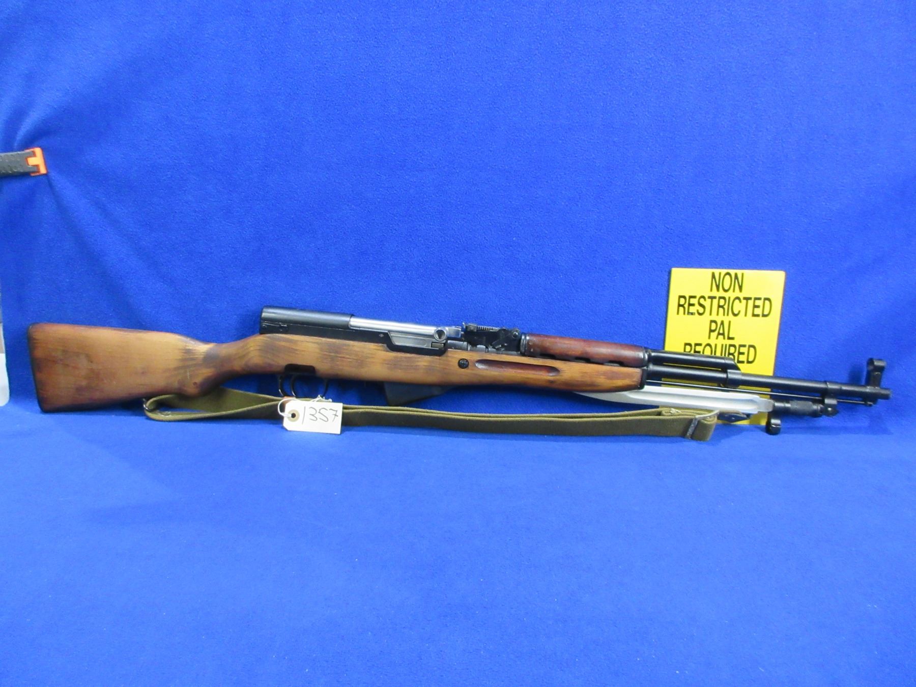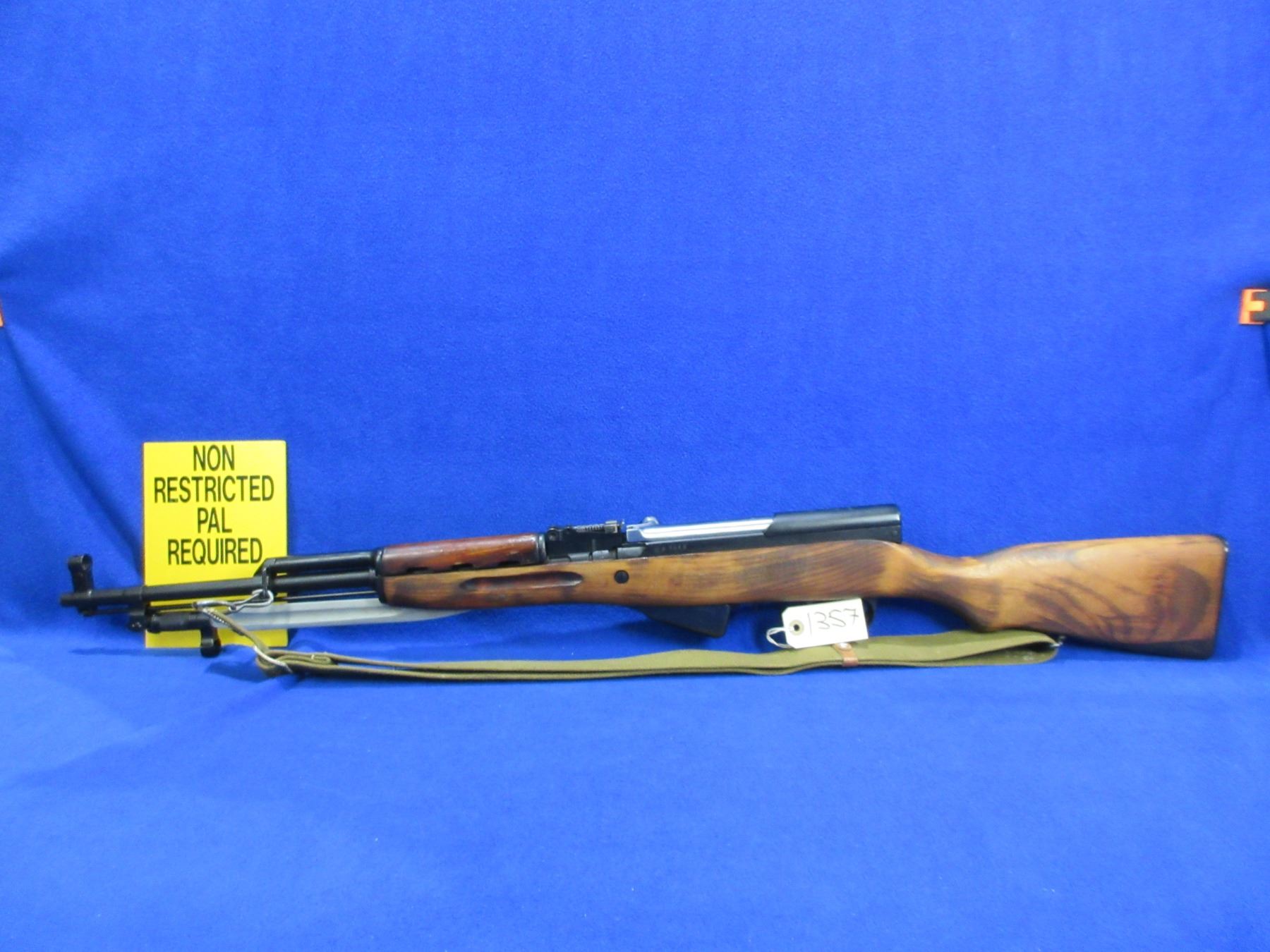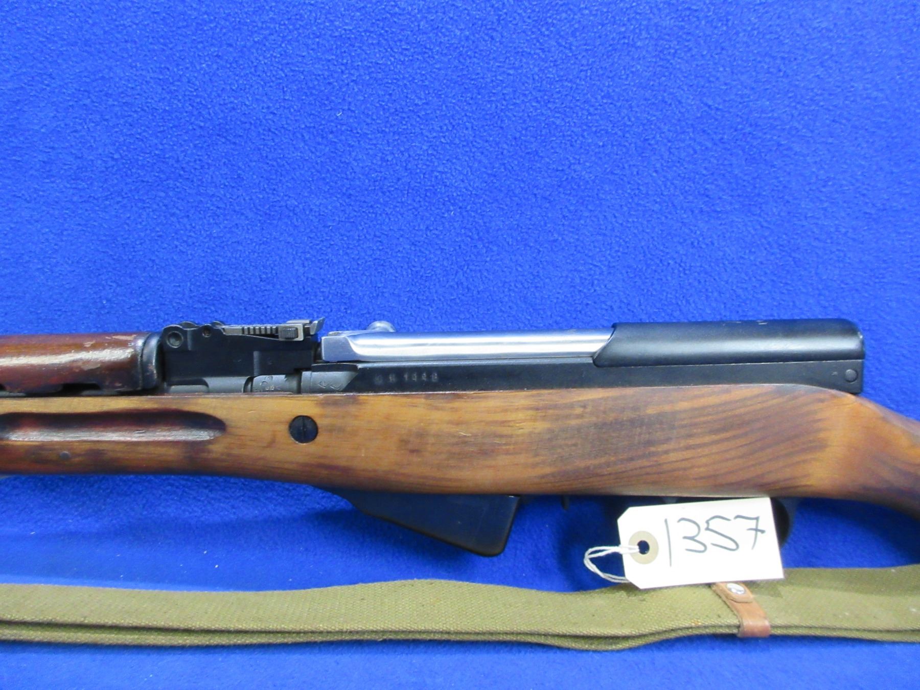 Non-Restricted - Russian SKS in 7.662x39 - This is a semi-auto rifle with detachable internal magazine, action appears to be in good to very good working order. Barrel is 20 1/4", rifling is good to very good, bluing is good to very good, has both sights, stock is good to very good, metal butt plate good, comes with bayonet, swivels and sling. Ser # 1448