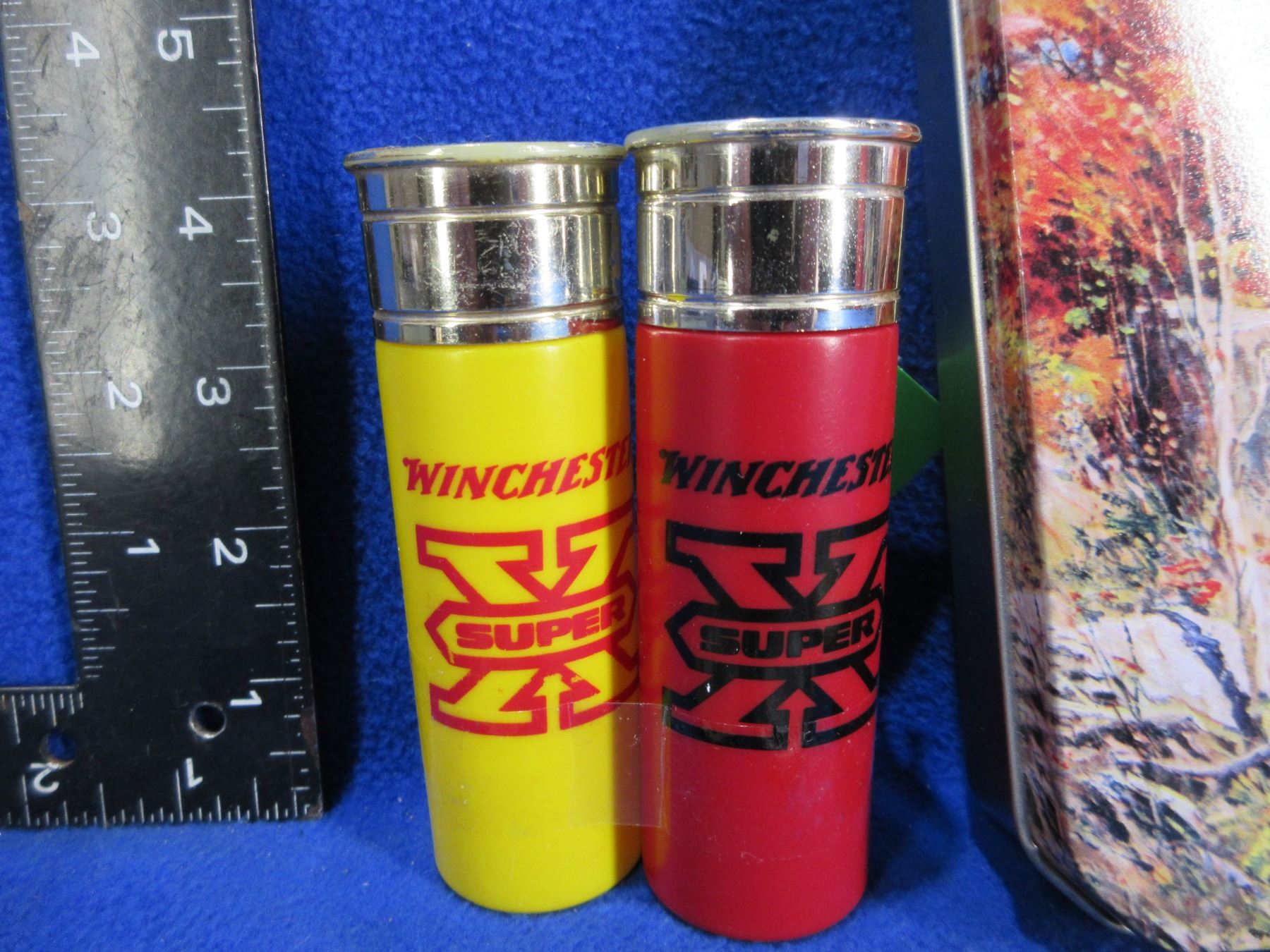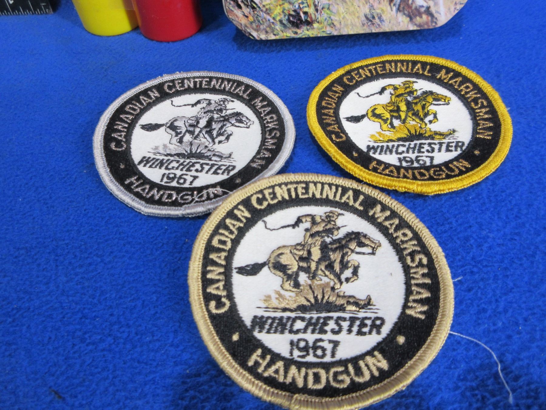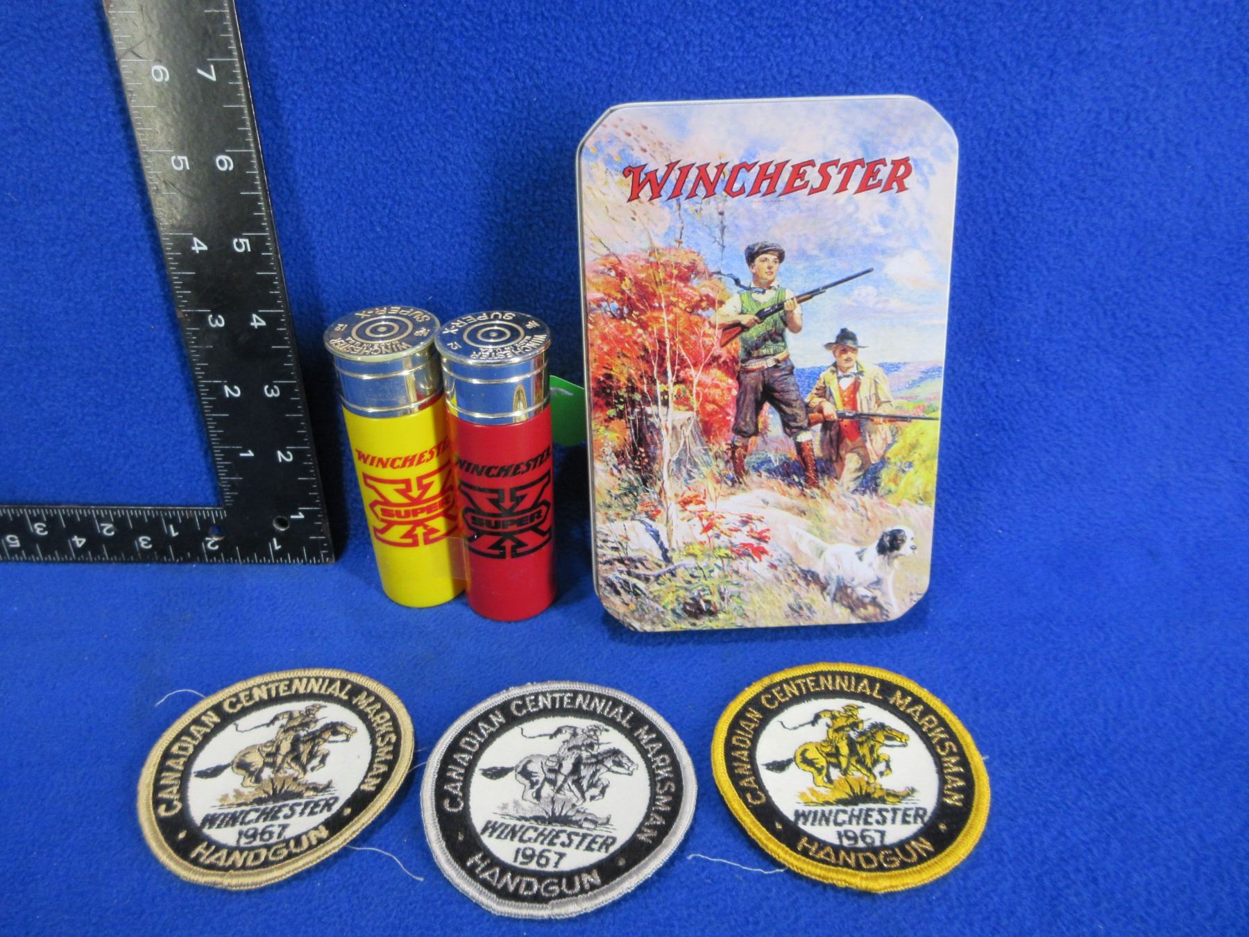 Lot of Misc. - Winchester Tin, 3 Shooting Competition Patches, 2 Aftershave Containers (Shotshells)