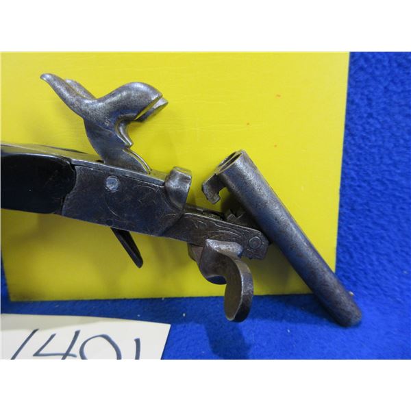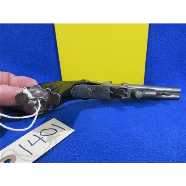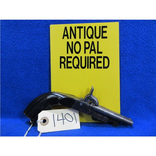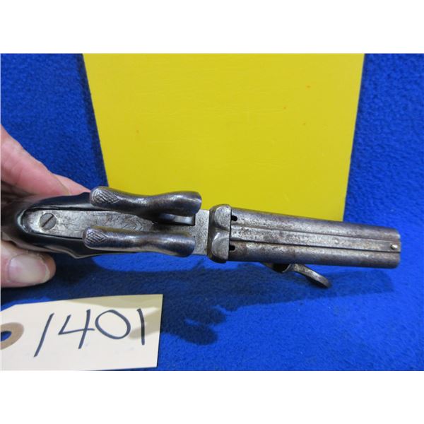 Antique - No PAL Required - Double Barrel Pinfire pistol with underlever opening in approx. 8mm - Rare and desireable, this is a vintage double barrel pinfire with folding trigger, action appears to be in good working order but underlever needs tightening. Barrels are 2 3/4". rifling is fair to good, bluing is gone with some pitting, has front bead sight, grip is good. Ser # 70
