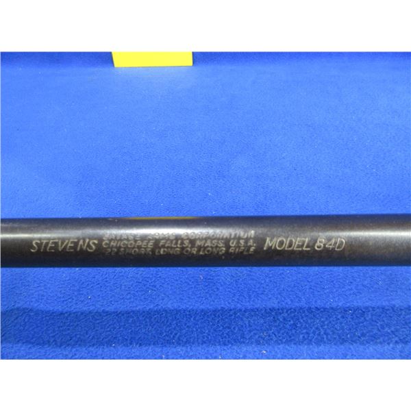 Non-Restricted - Barreled Action - Stevens 84D in 22 S/L/LR - This is a barrel, action only and trigger assembly only. Barrel is 24", rifling is good to very good, bluing is good for age, has rear sight, front sight is missing. Ser # None