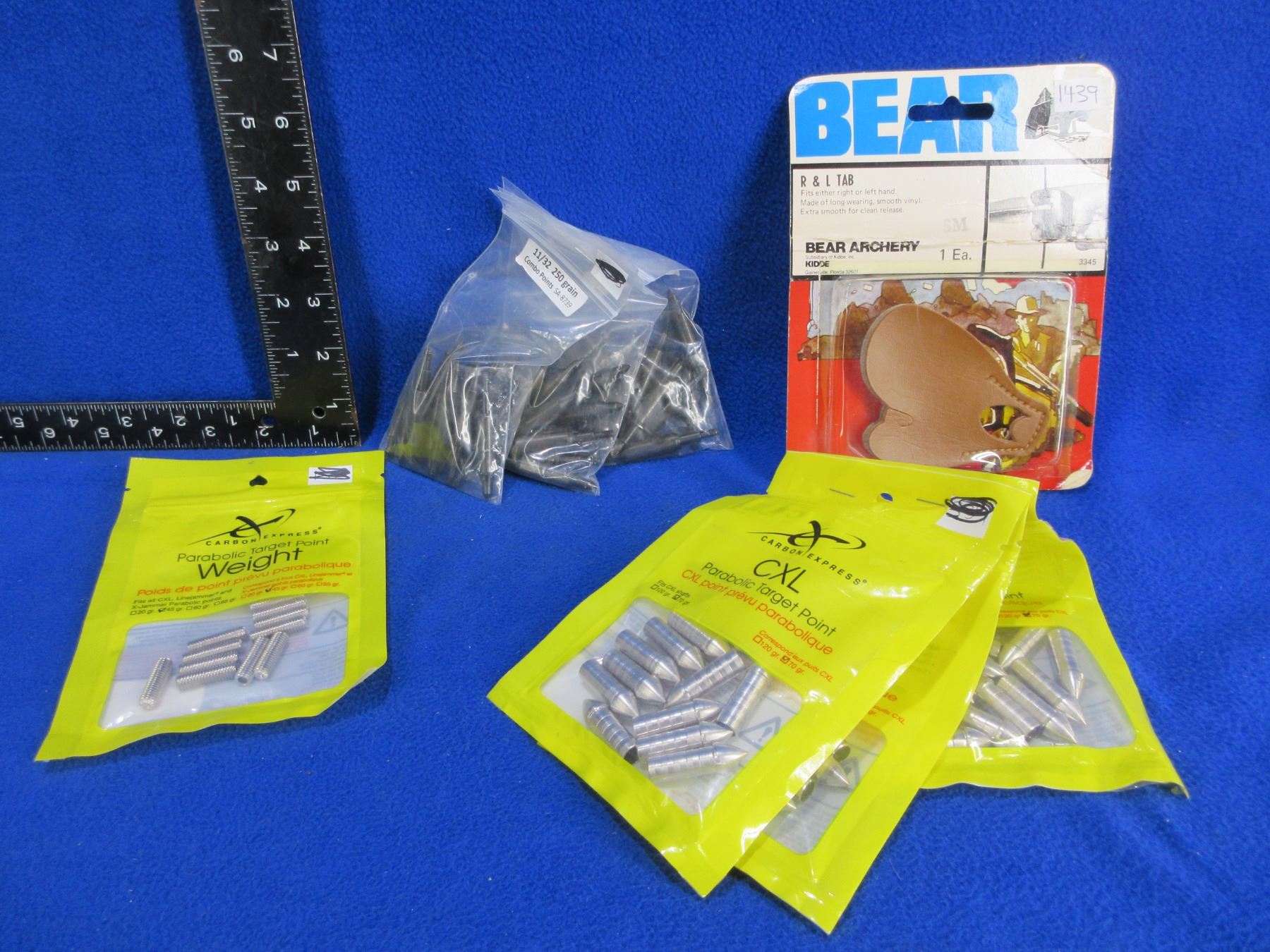 Archery Combo Points (3 Packs of 12, 11/32 250gr & Parabolic Target Points 70gr), Parabolic Target Point Weights (Carbon Express 45gr), Bear Archery R & L Tab - All New Old Stock