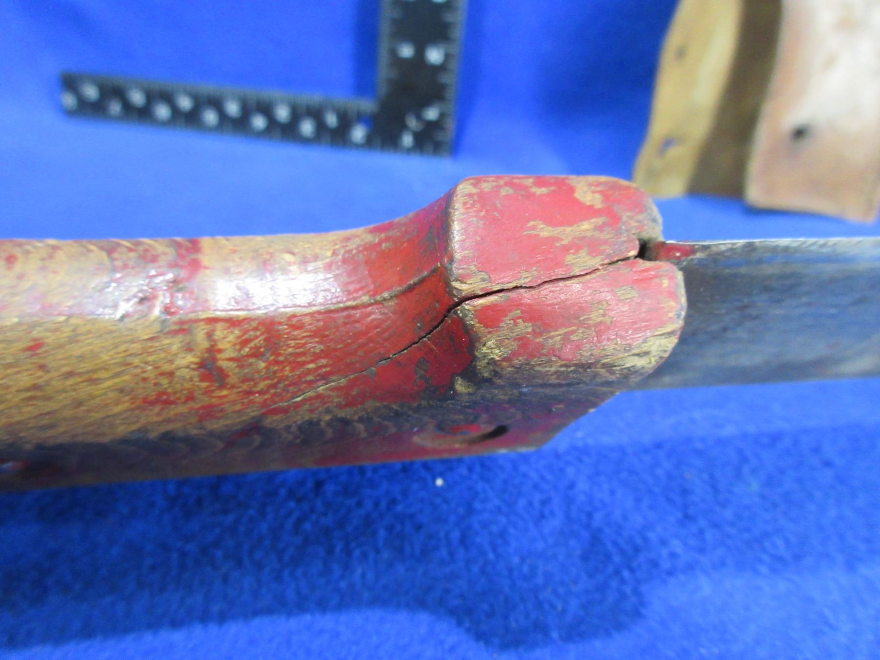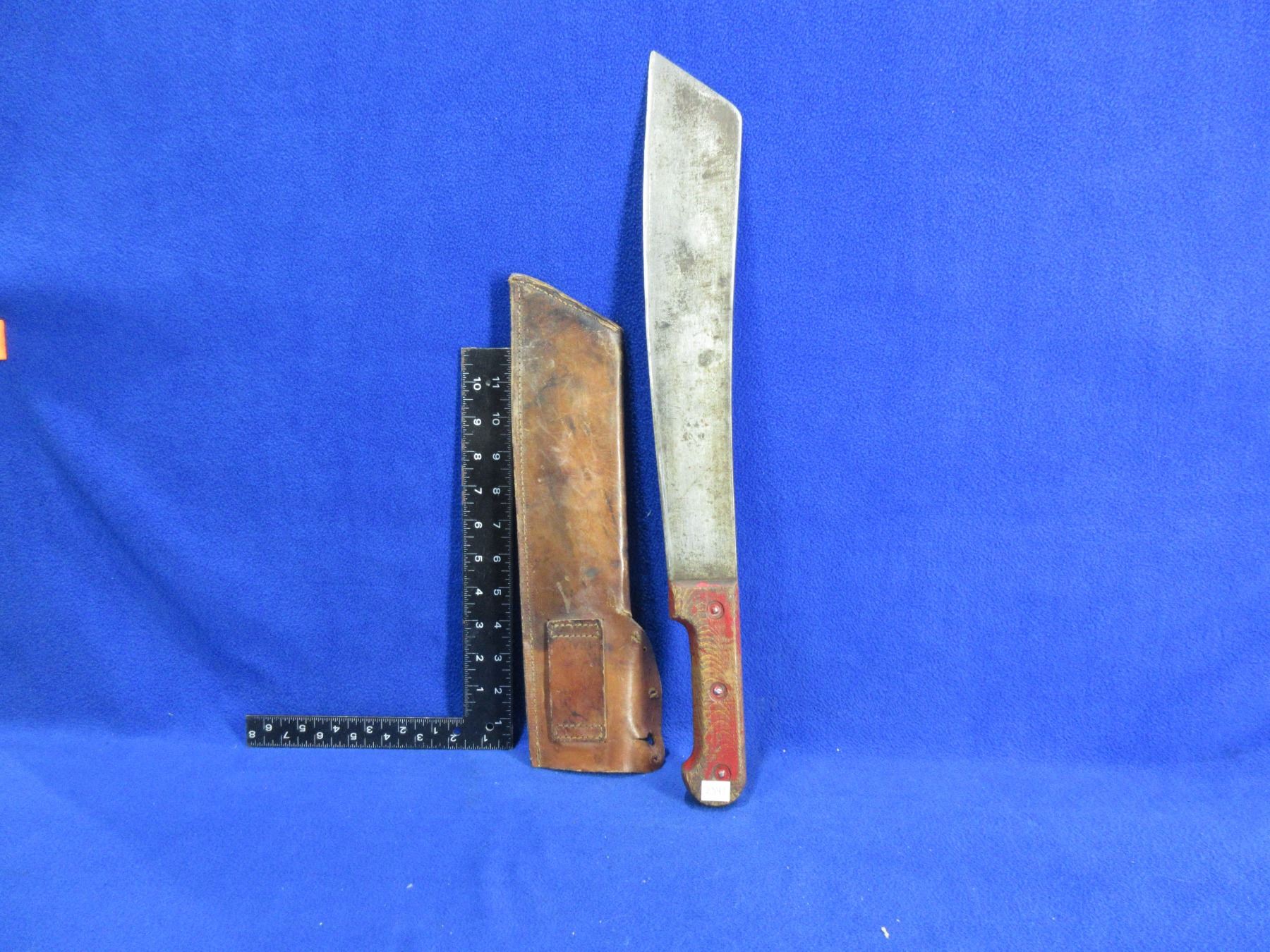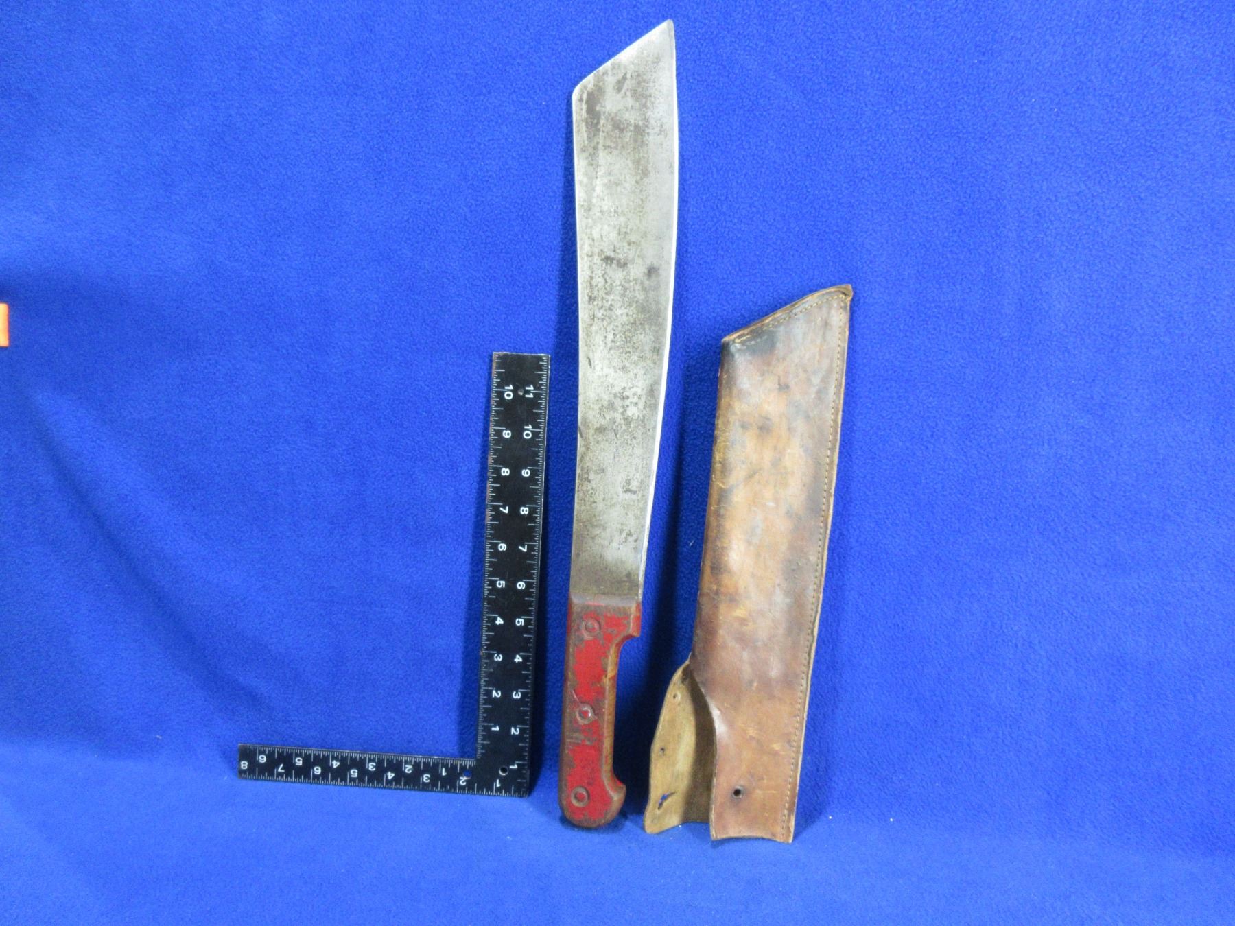 Machete with Leather Sheath - 14" Blade, 20" Total Length - Handle has a crack and a small amount of play, sheath is missing the snap button