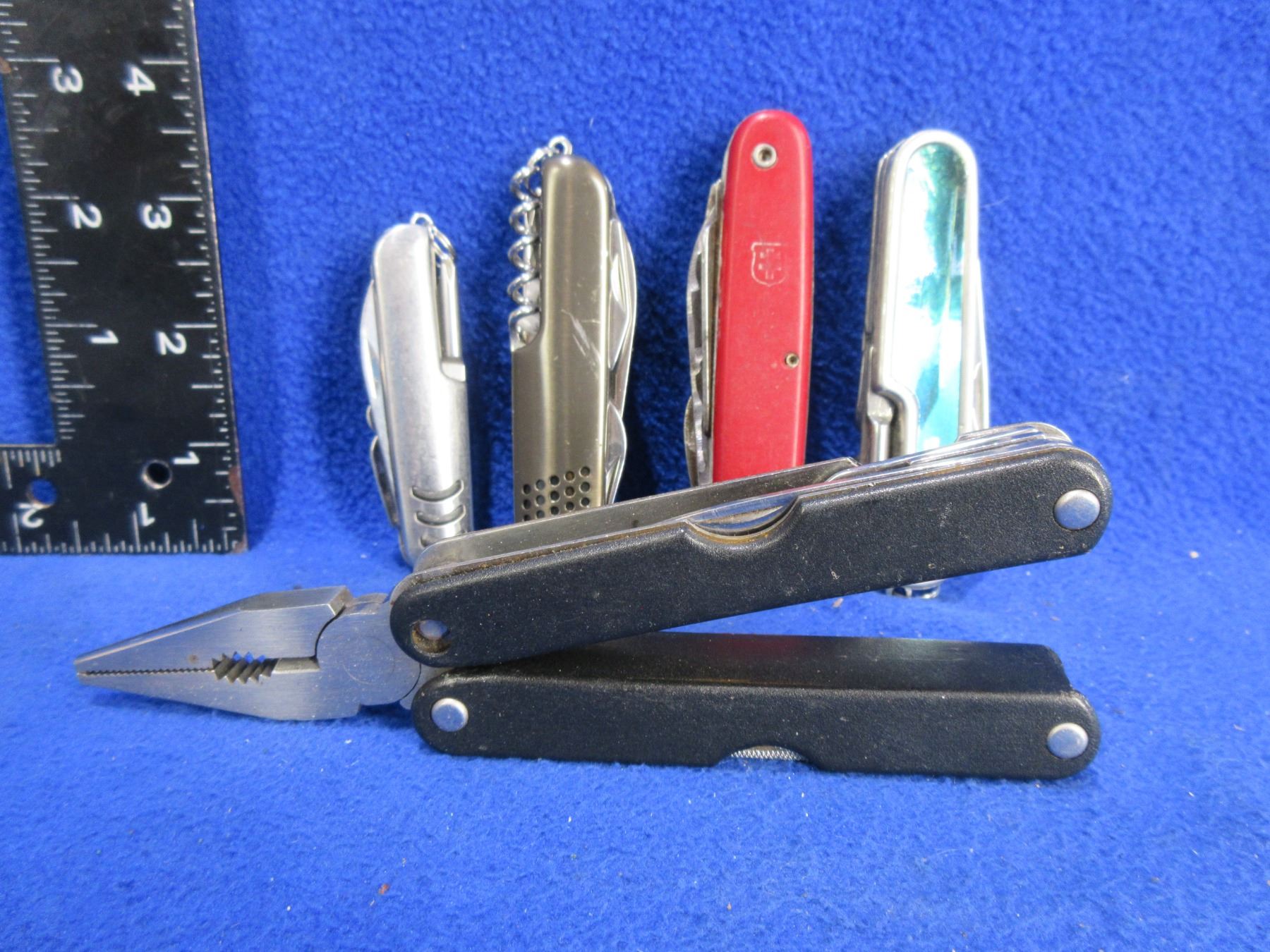 4 Swiss Army Style Folding Knives and a Multi-Tool Plier