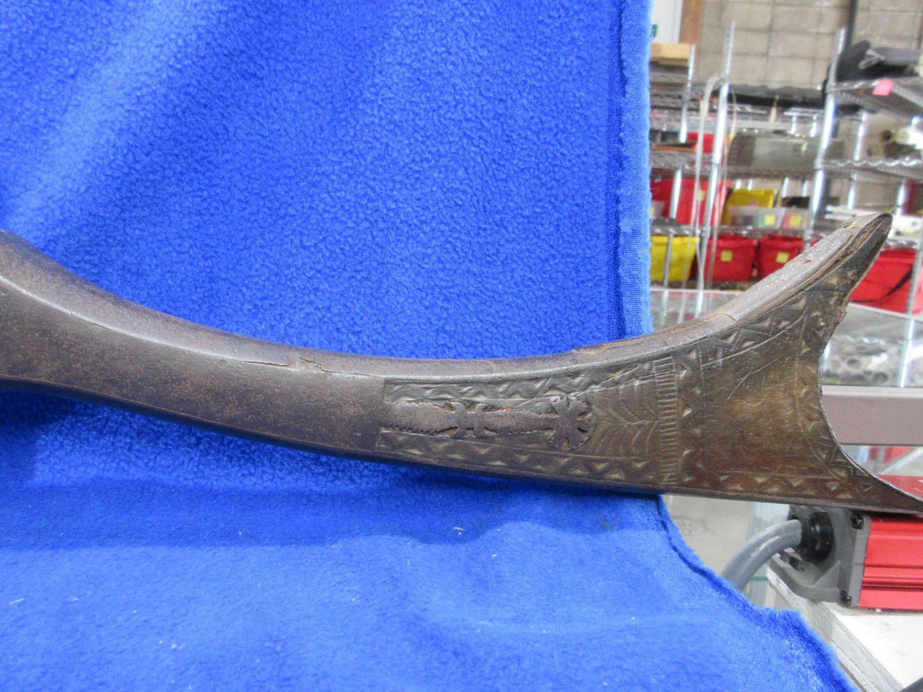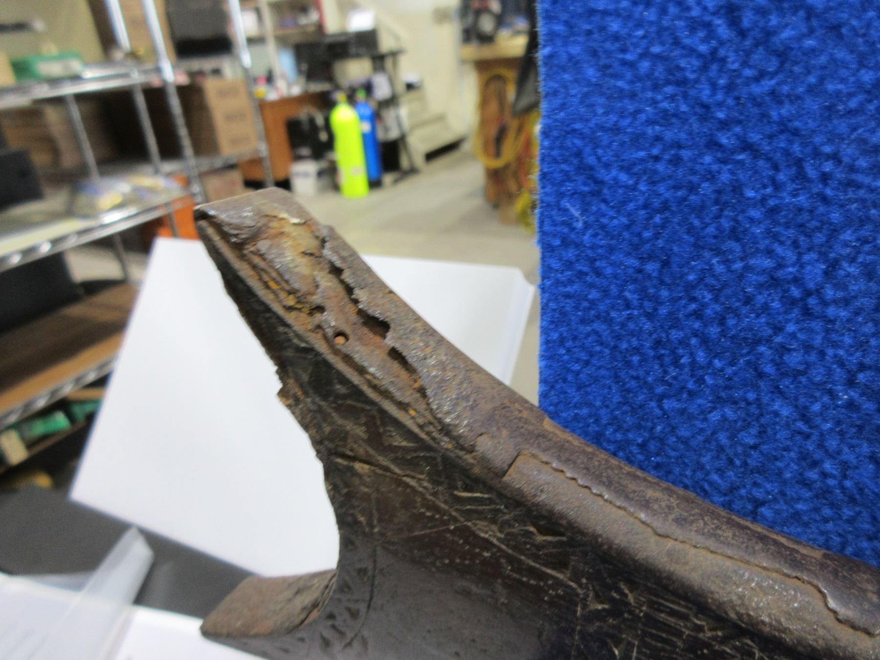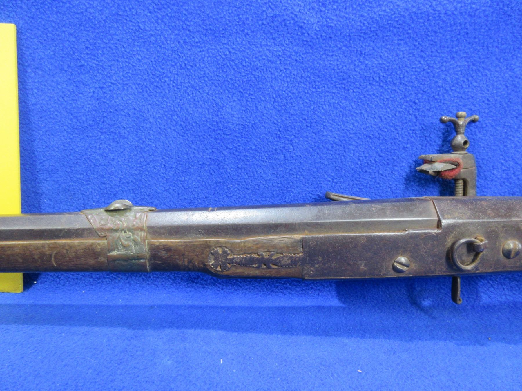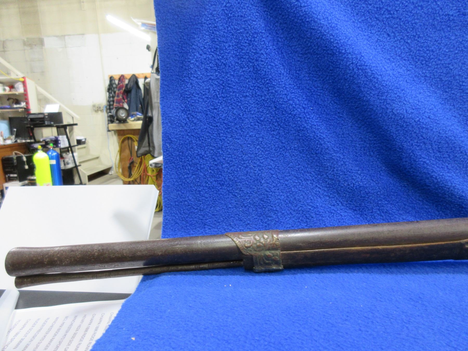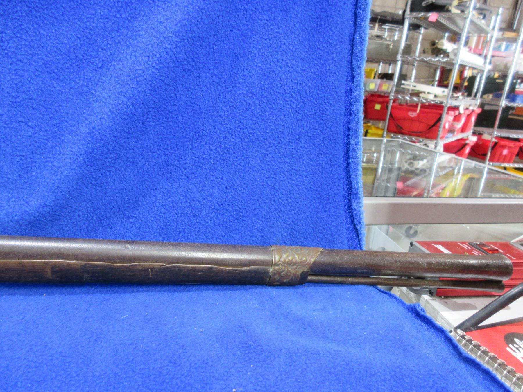 Antique - No PAL Required - Flintlock Musket Rifle, Unknown Caliber - This flintlock musket rifle is a nice wall hanger that onyone can own and appears to be real, action is in non working order. 41 1/2" barrel. Metal stock has engraving and has rust damage on the butt, wood forearm is cracked, brass barrel bands have some damage, comes with ram rod.