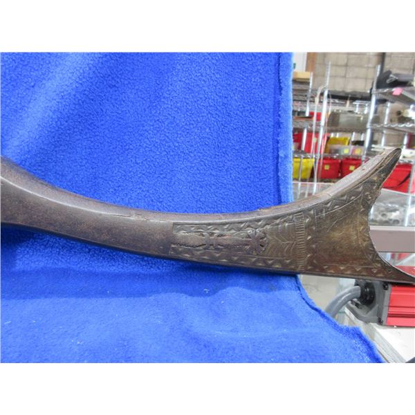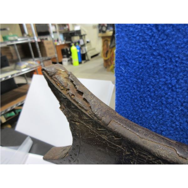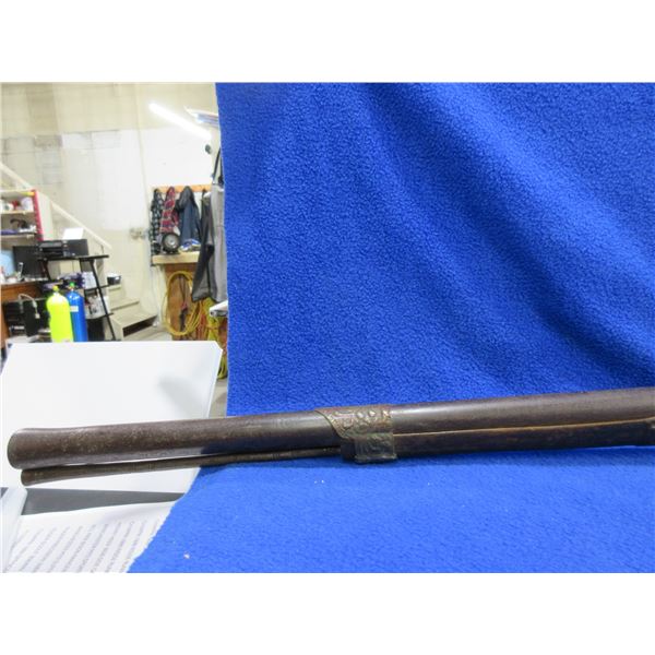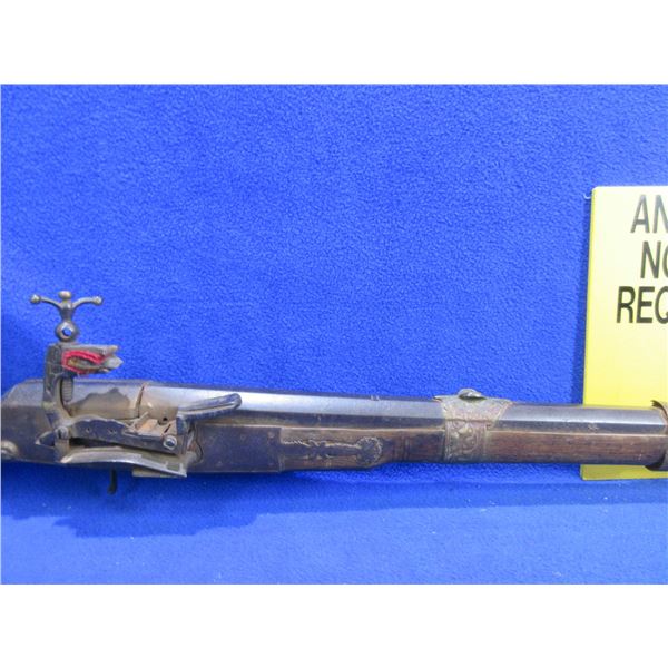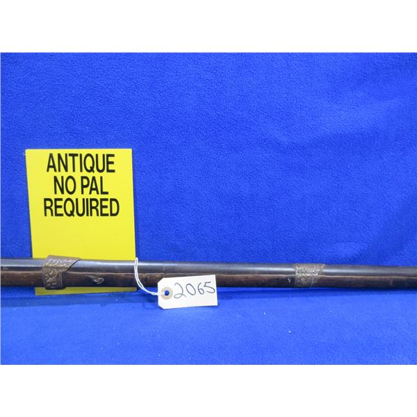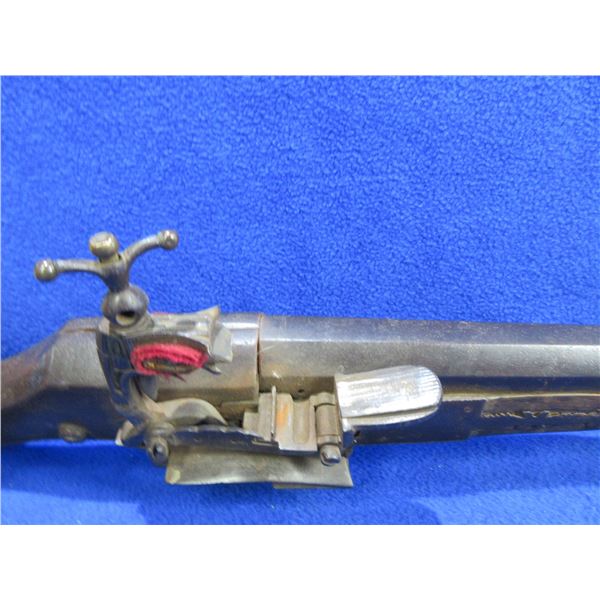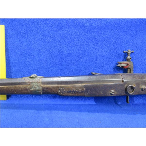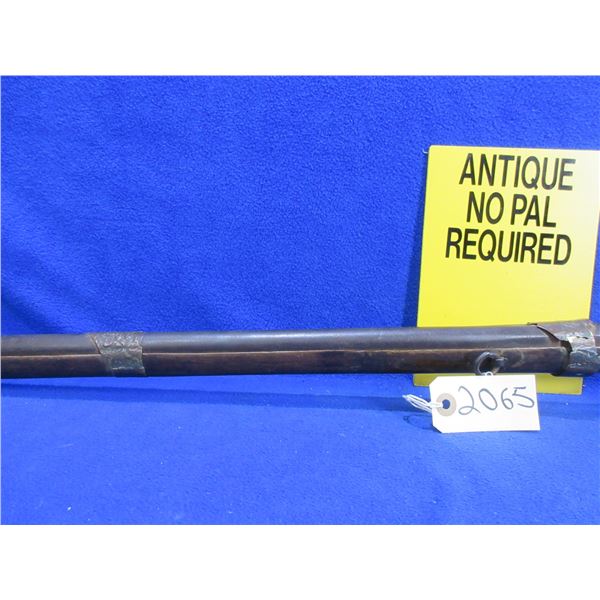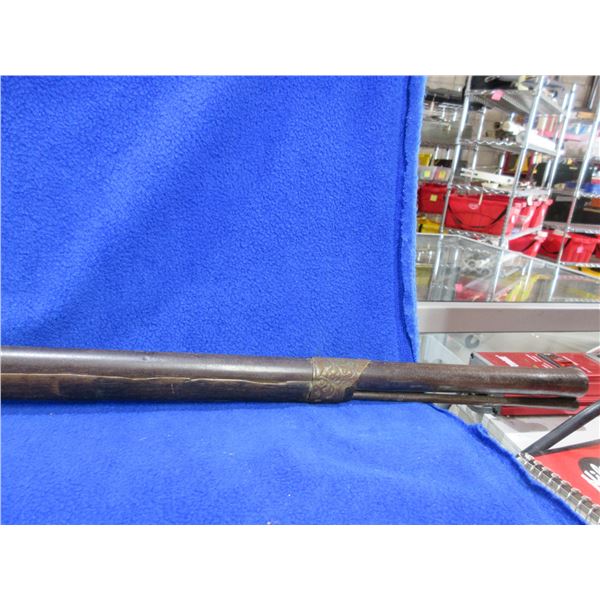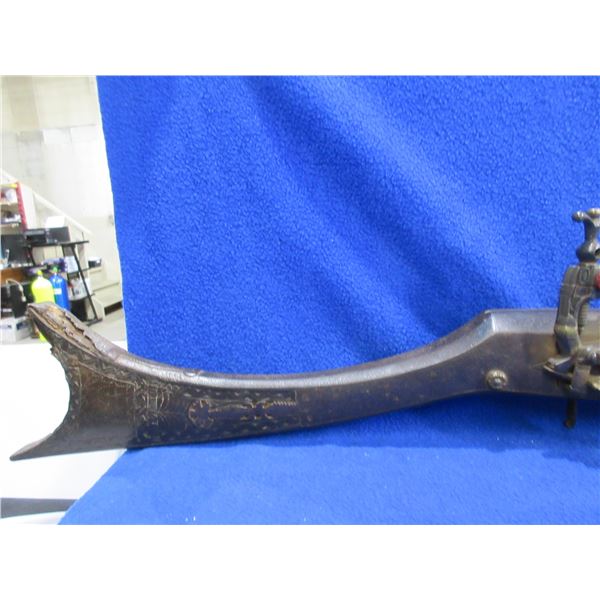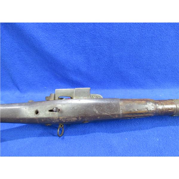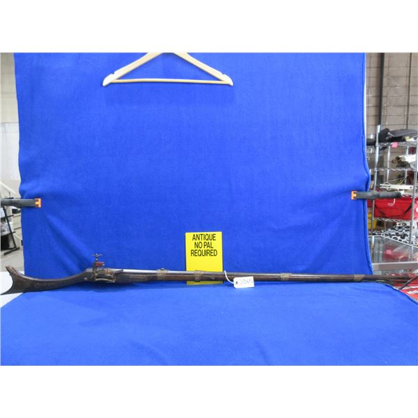 Antique - No PAL Required - Flintlock Musket Rifle, Unknown Caliber - This flintlock musket rifle is a nice wall hanger that onyone can own and appears to be real, action is in non working order. 41 1/2" barrel. Metal stock has engraving and has rust damage on the butt, wood forearm is cracked, brass barrel bands have some damage, comes with ram rod.