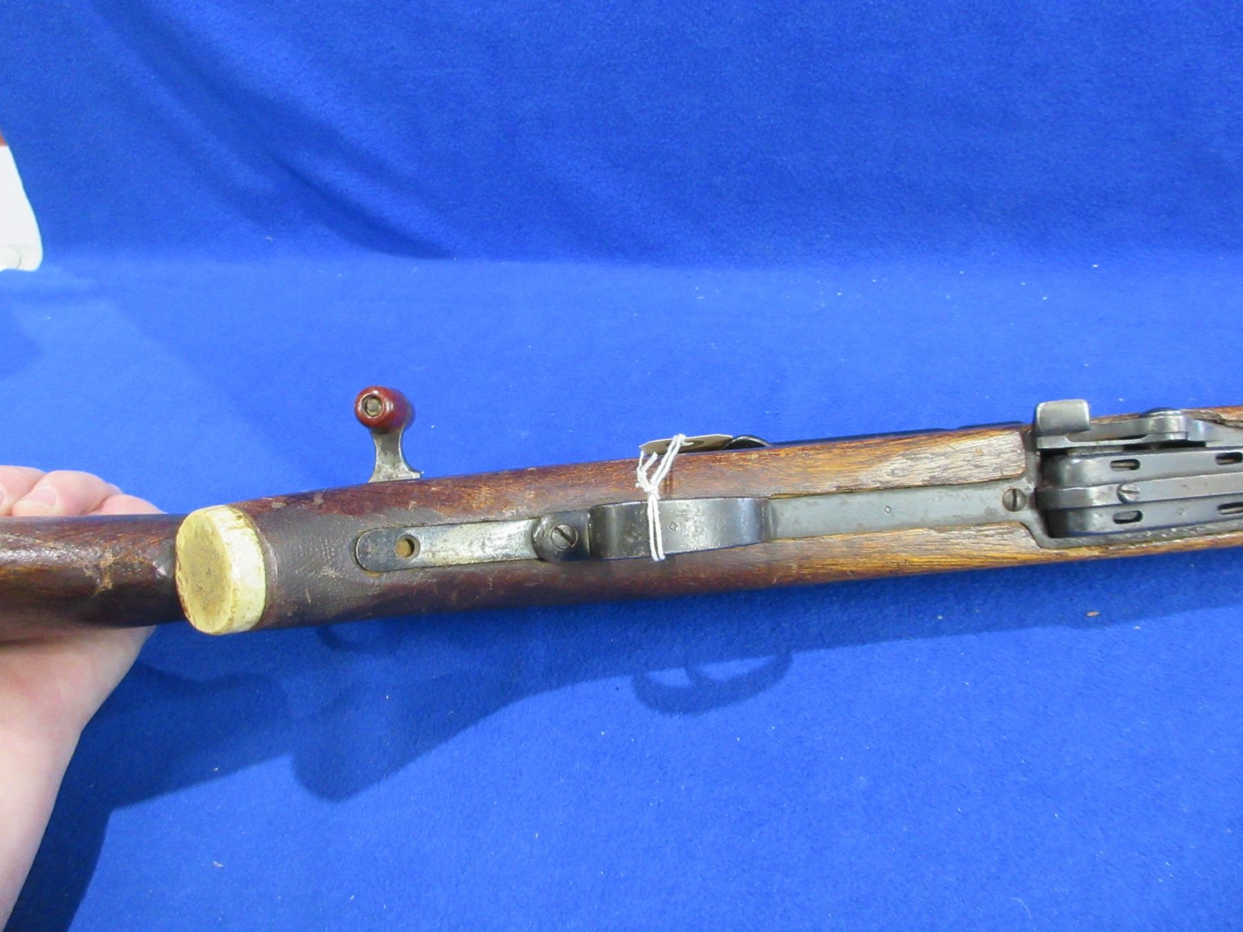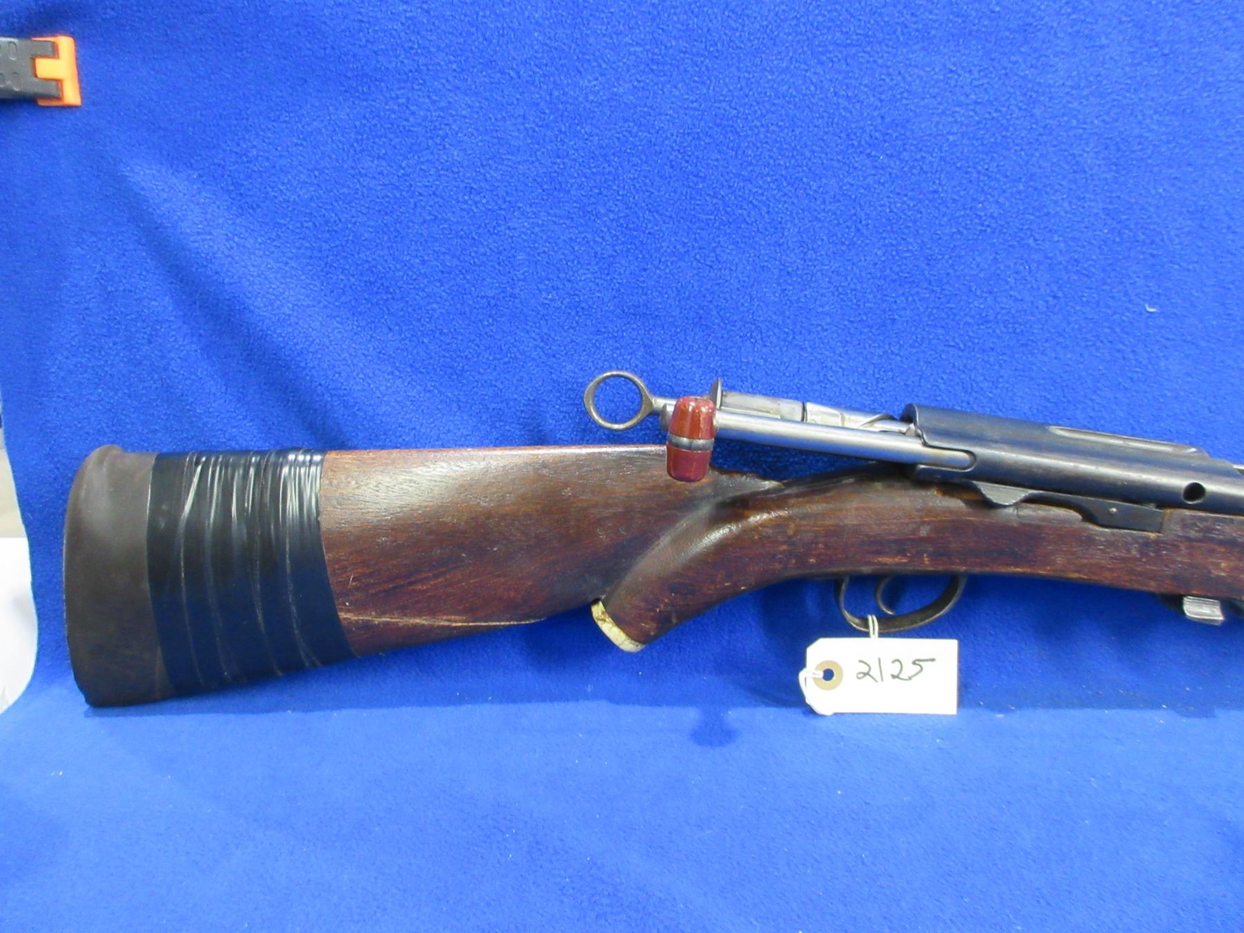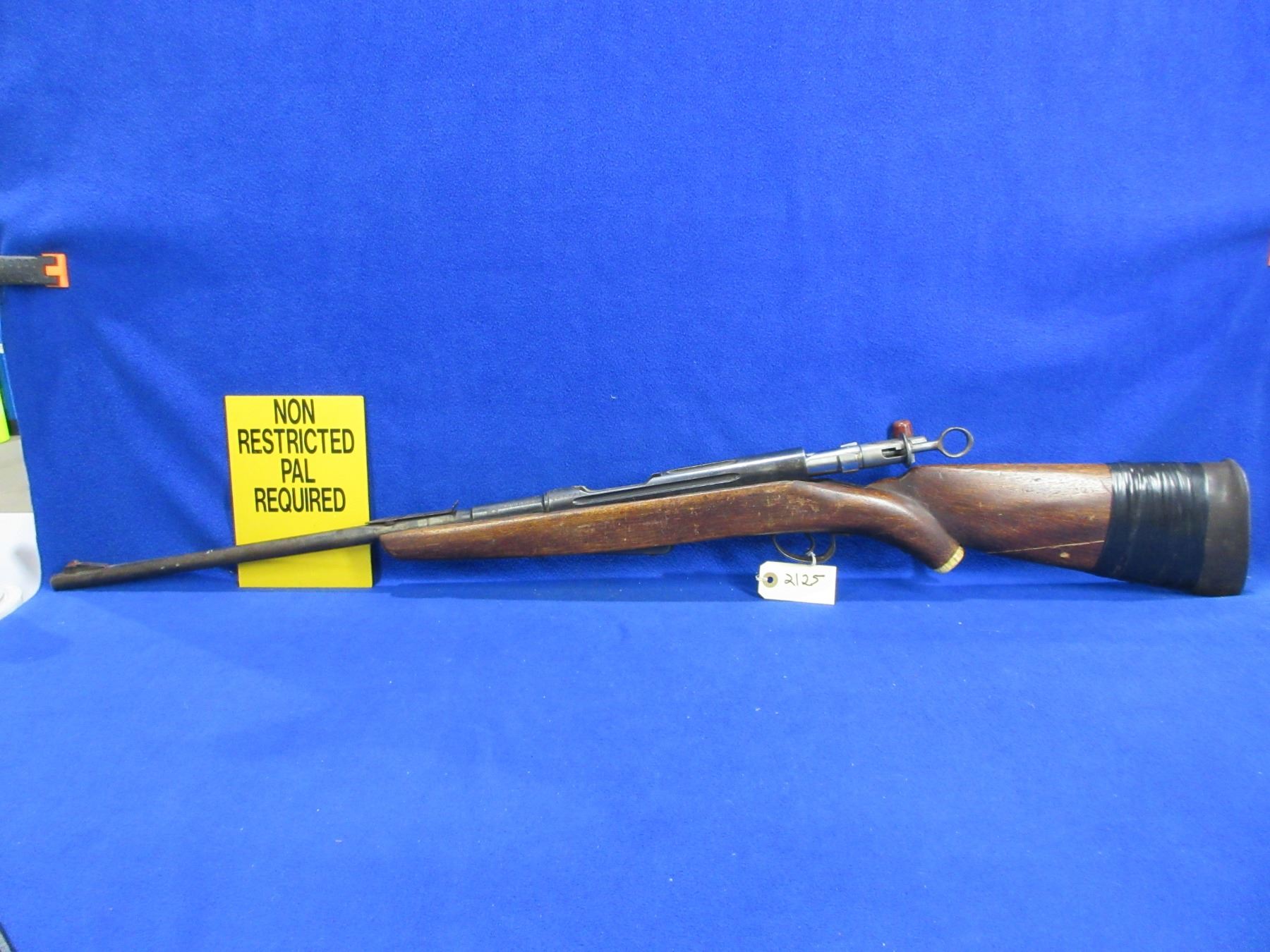 Non-Restricted - Schmidt Rubin in 30-30 WCF- Appears to be an 1889 but has no markings to verify. This is a bolt action rifle with internal magazine, action appears to be in good working order but is unsafe to fire as the stock is broken. Barrel is 20 1/4", rifling is good with some pitting at the muzzle, bluing is poor or gone, has both sights but rear sight is missing the ramp, stock appears to be home made and is broken and taped together at the butt and the forearm has cracks, slip on recoil pad poor. Ser #201768