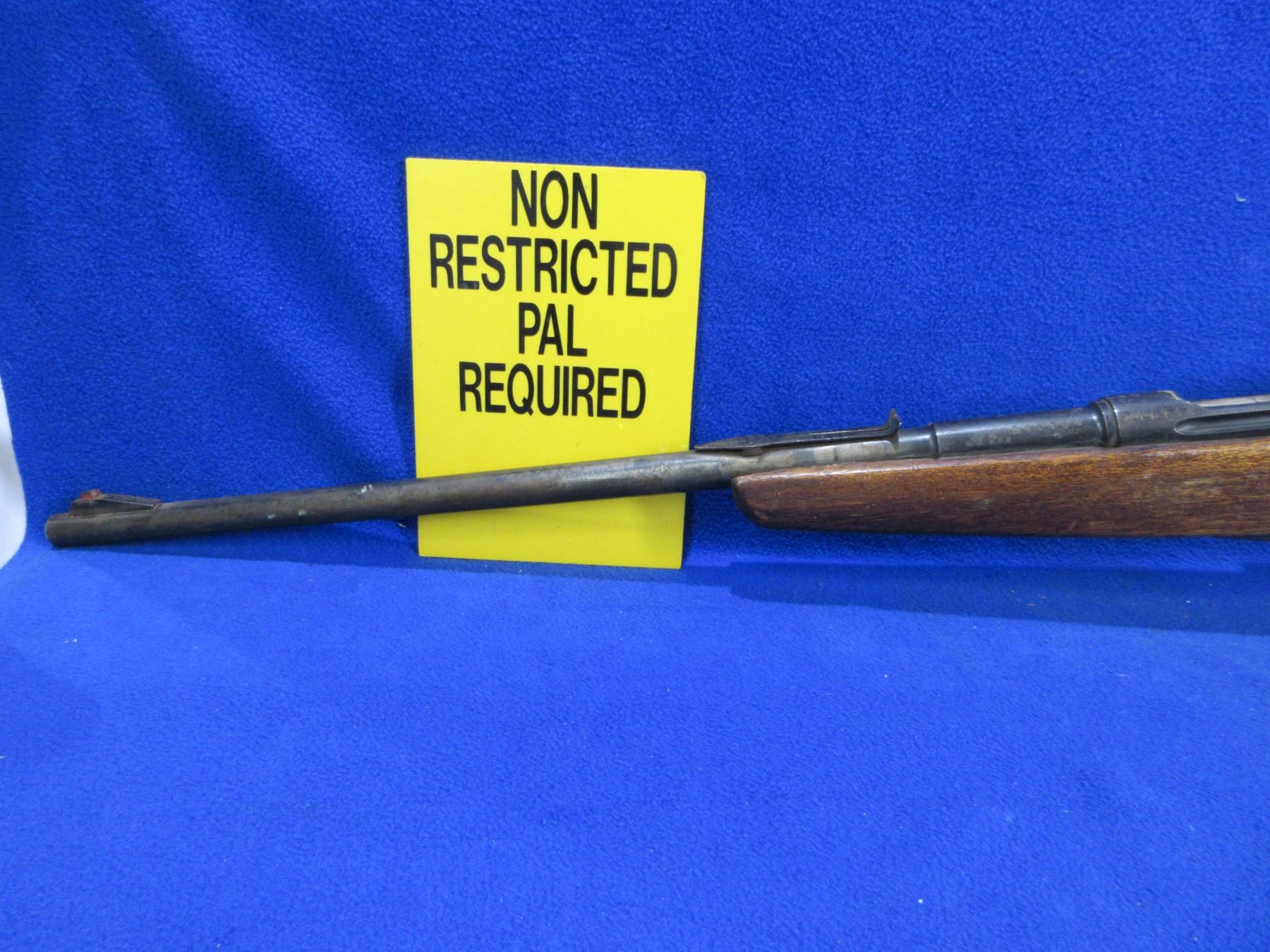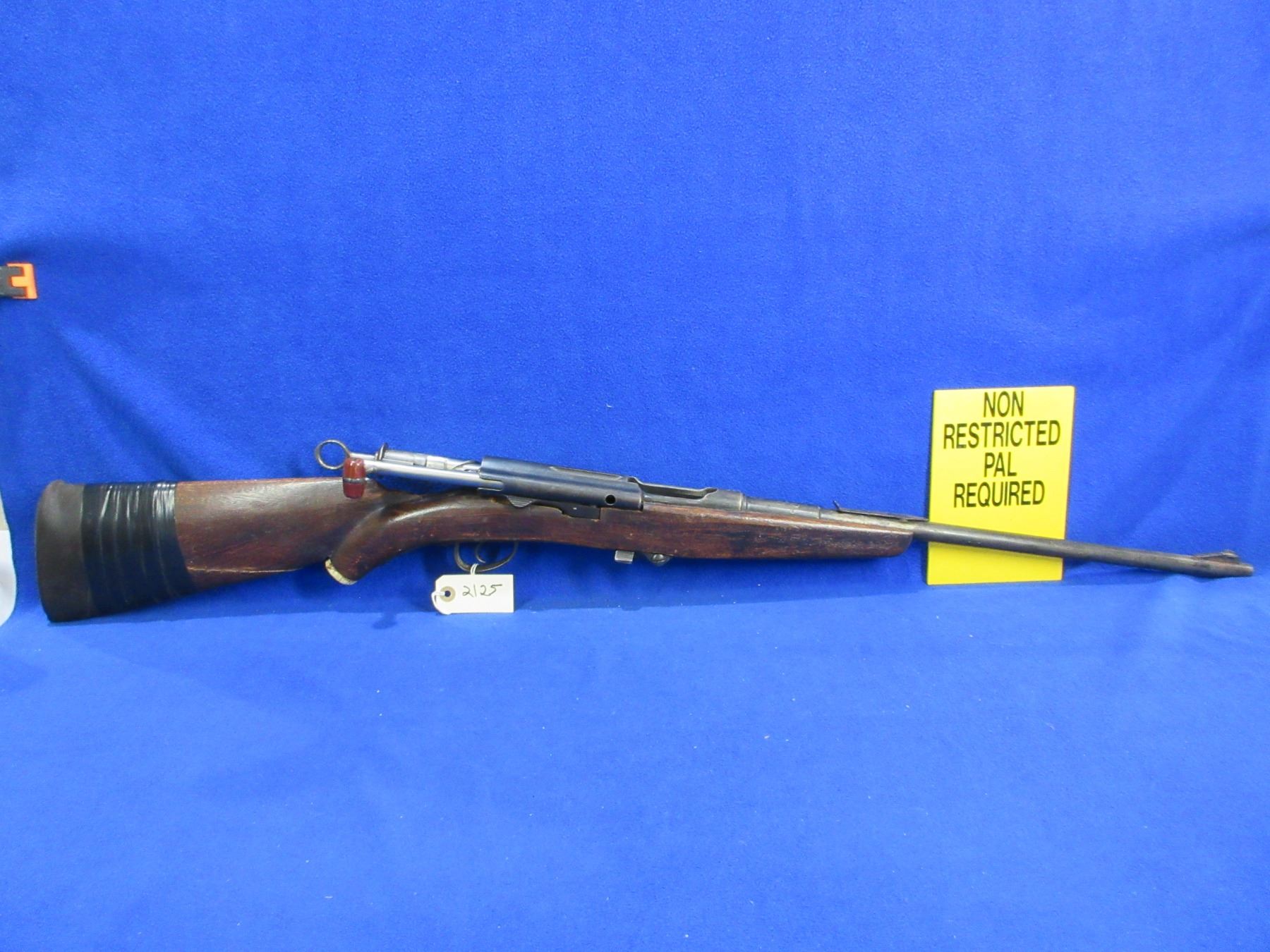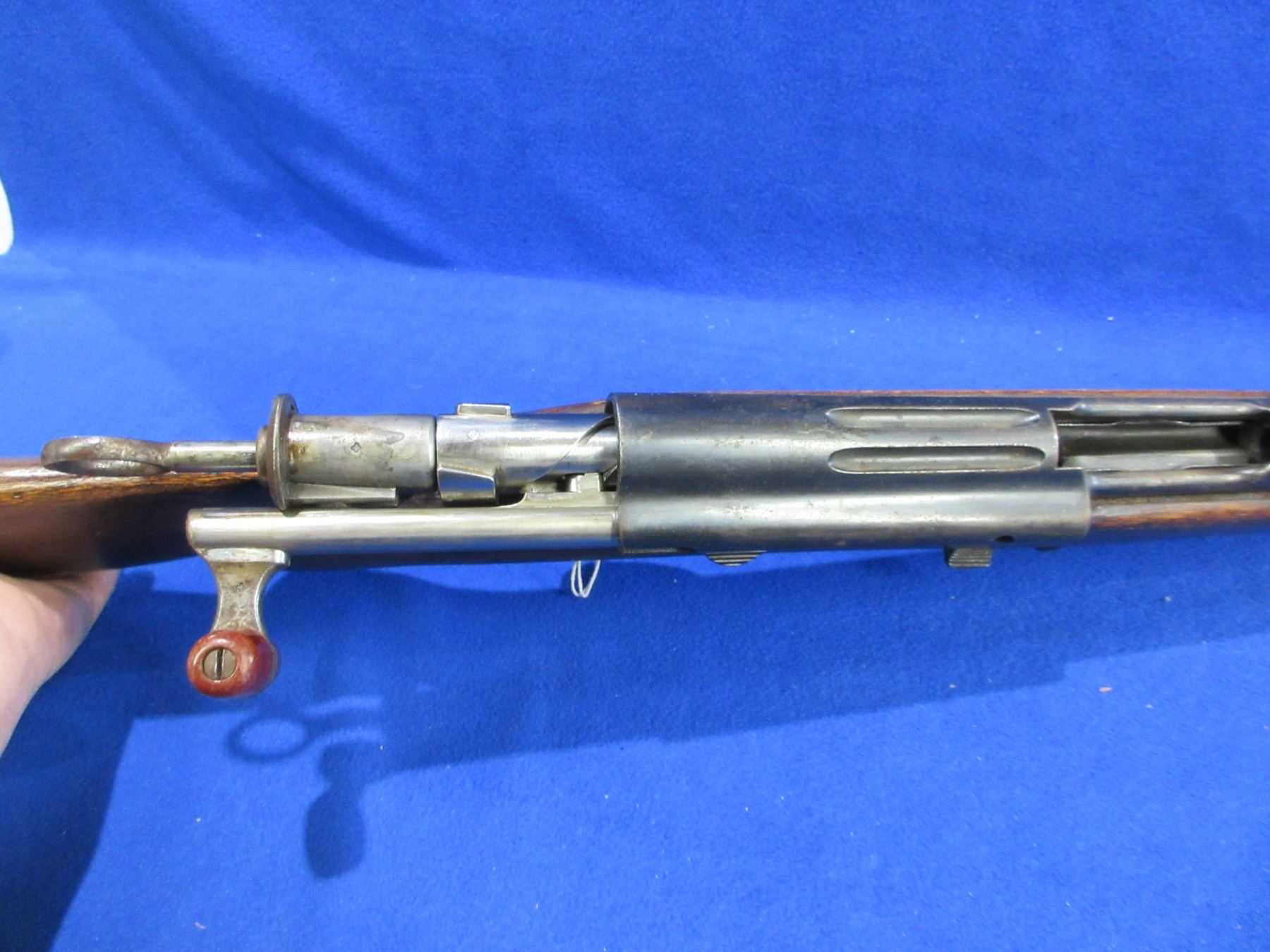 Non-Restricted - Schmidt Rubin in 30-30 WCF- Appears to be an 1889 but has no markings to verify. This is a bolt action rifle with internal magazine, action appears to be in good working order but is unsafe to fire as the stock is broken. Barrel is 20 1/4", rifling is good with some pitting at the muzzle, bluing is poor or gone, has both sights but rear sight is missing the ramp, stock appears to be home made and is broken and taped together at the butt and the forearm has cracks, slip on recoil pad poor. Ser #201768