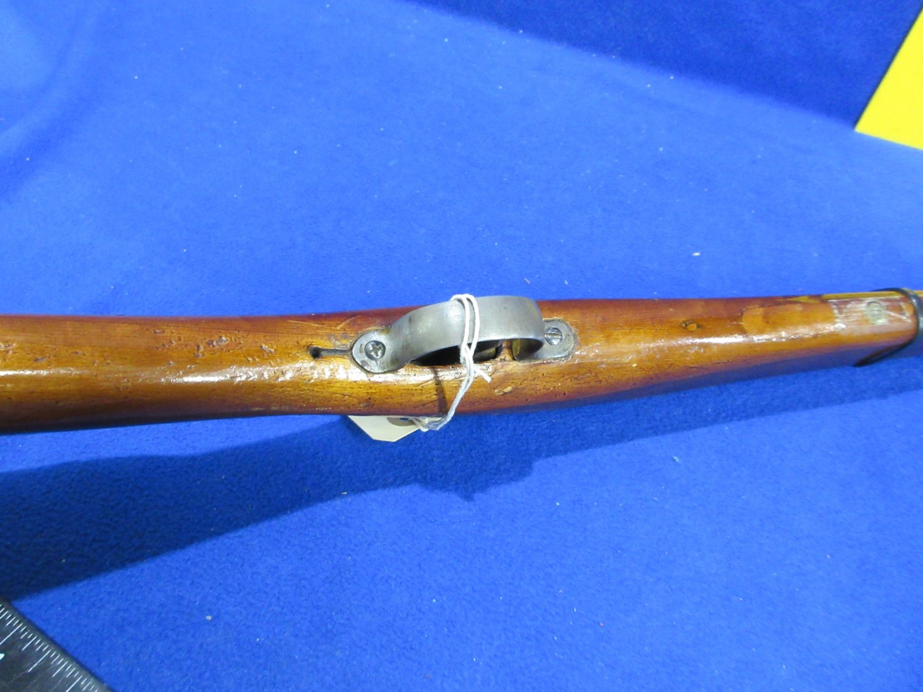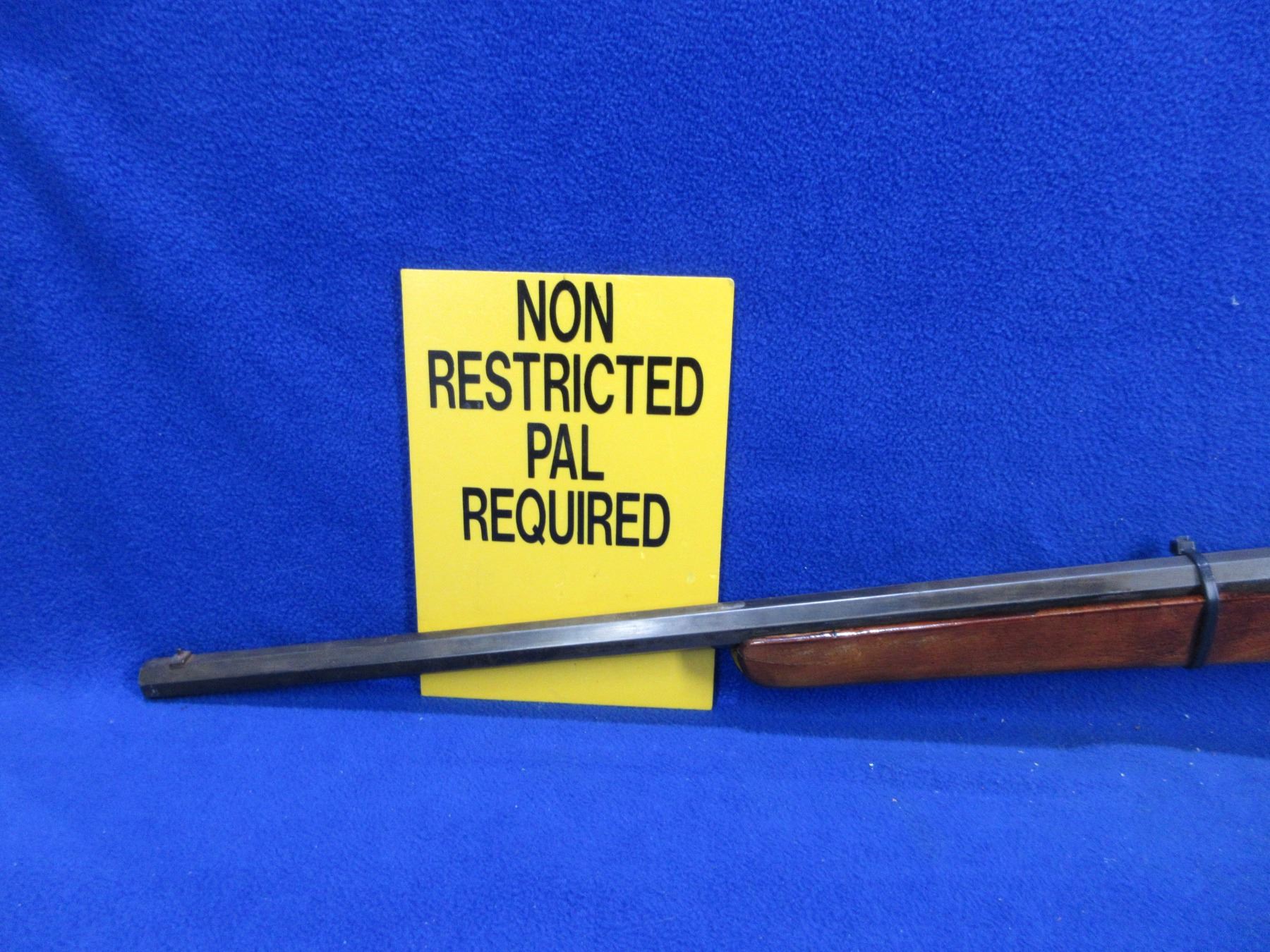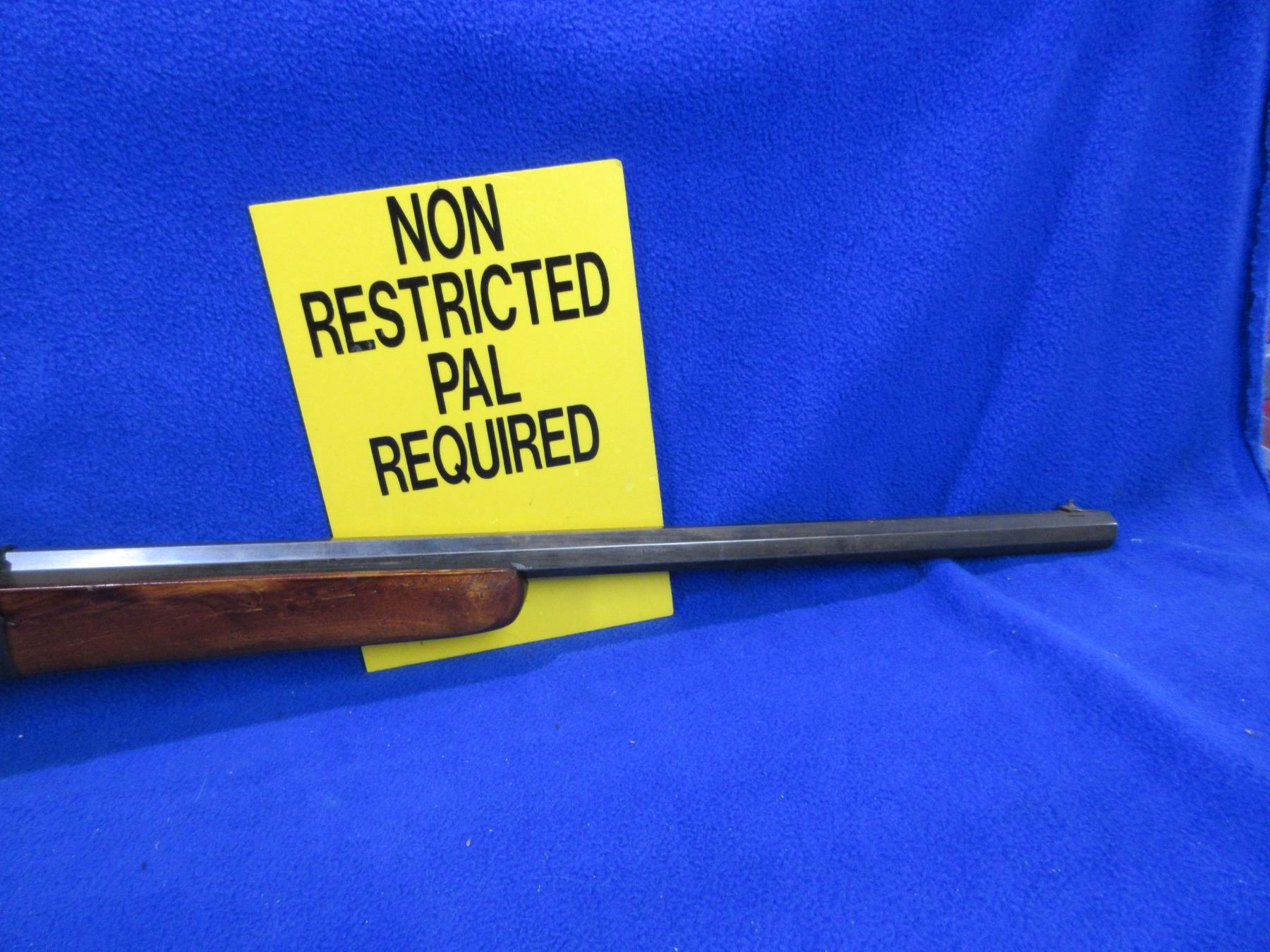 Non-Restricted - Belgian Flobert in 22 LR - This is a single shot breech loading rifle, action is in non working order as will not stay cocked, extractor is missing, . Barrel is 22", rifling is poor to fair, bluing is mostly gone, has front bead sight, rear sight missing, stock is appears to be incorrect for gun and is zip tied to gun, butt plate good. Ser # 18