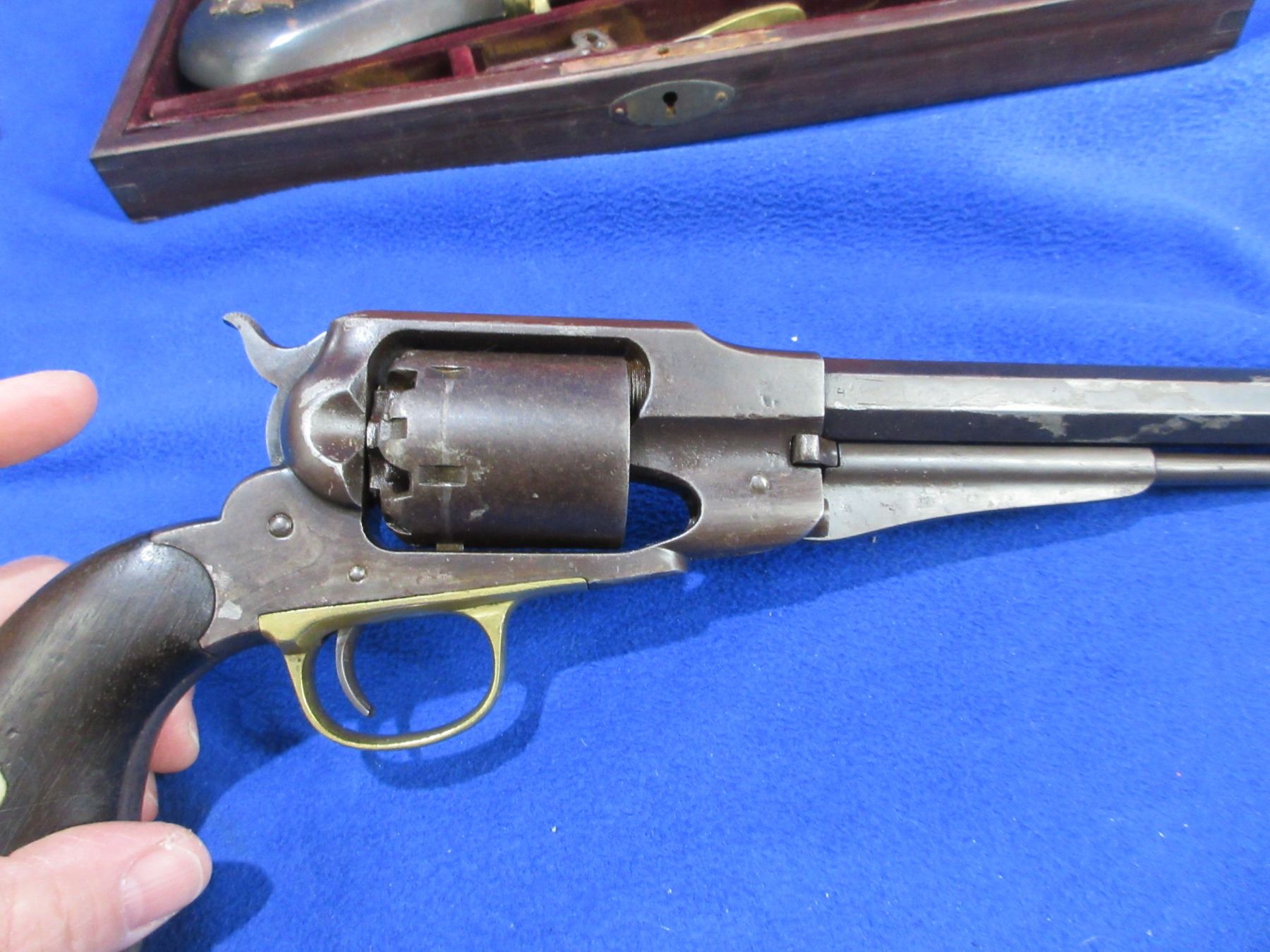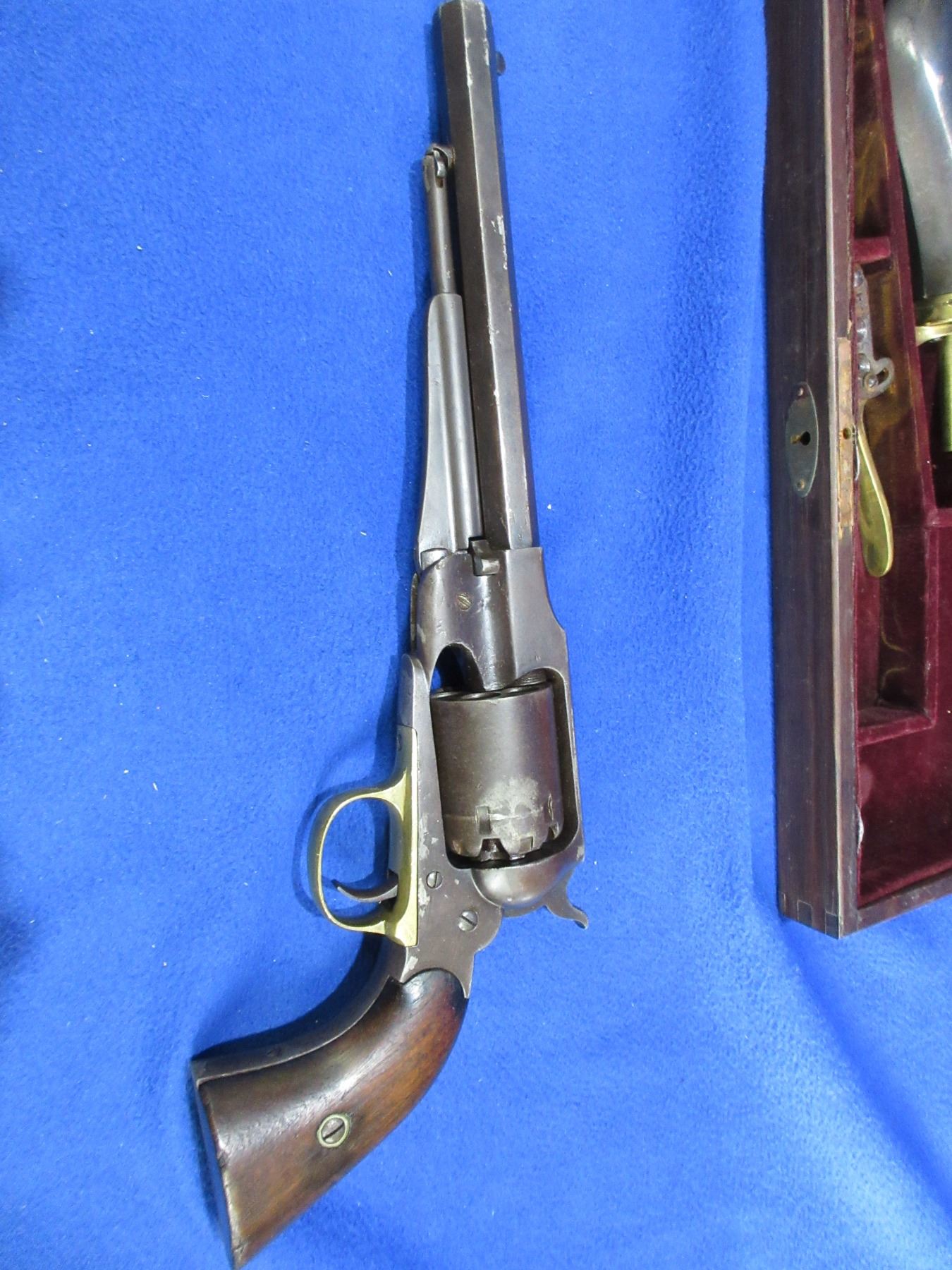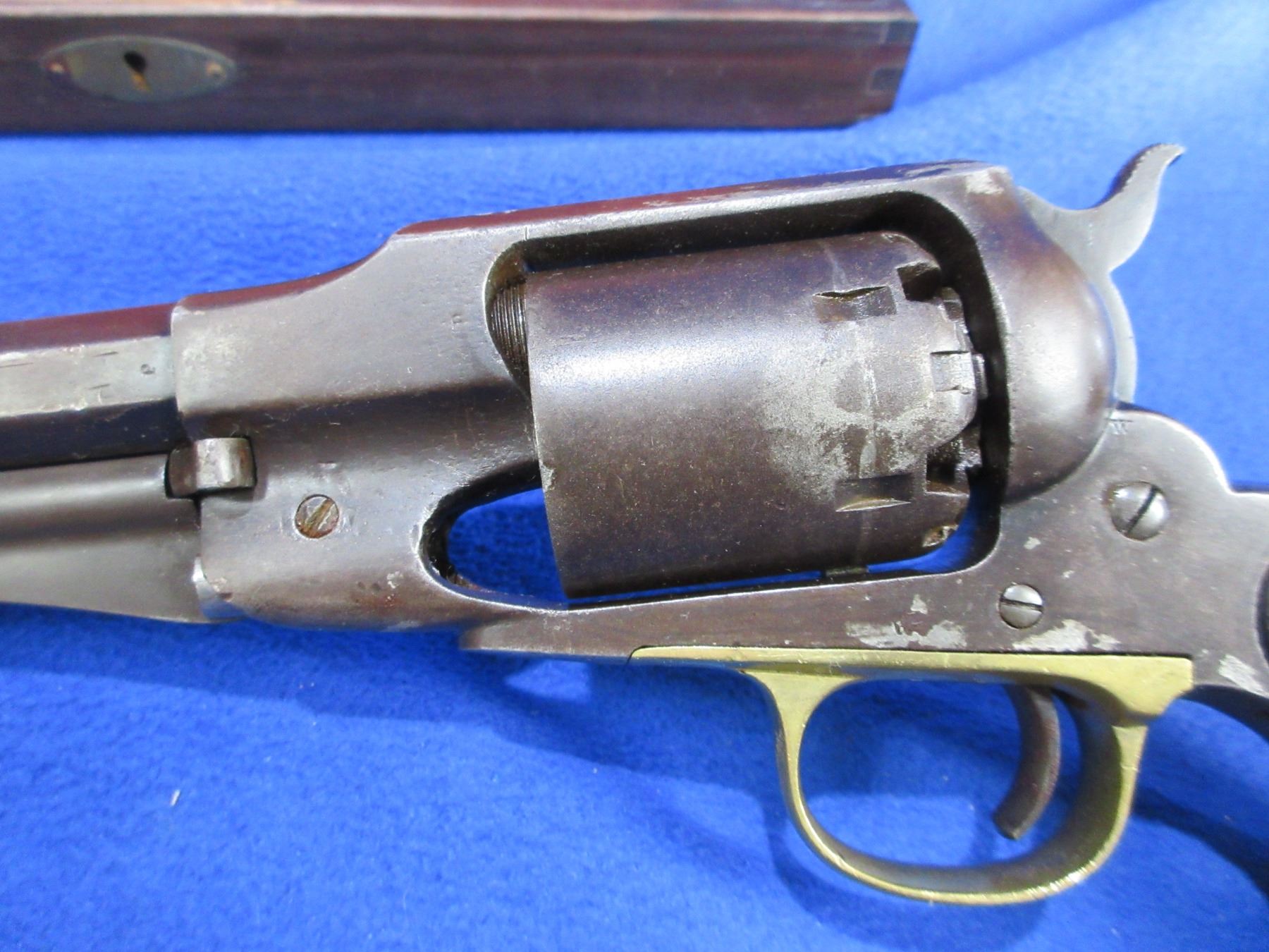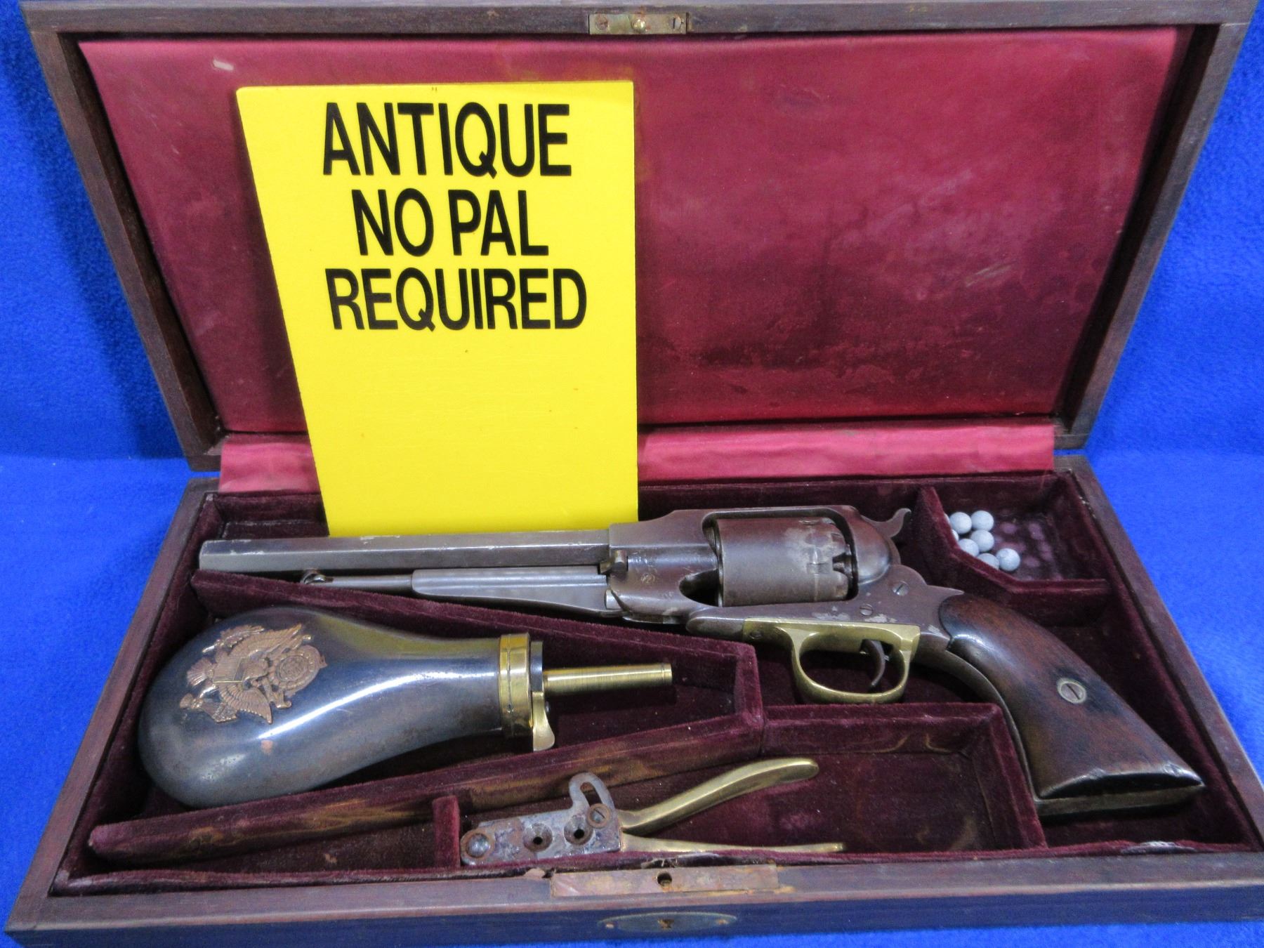 Antique - No PAL Required - Remington New Model 1858 Army in 44 Cal. - Rare and desireable, this is a six shot single action cap and ball revolver, action appears to be in good working order, cylinder lock up has some play. Octagon barrel is 8". rifling is good for age, bluing is has mostly turned brown with wear patches, has both sights, wood grips are good with usual wear, comes with powder horn, bullet mold, lead balls and display case. Ser # 90553.