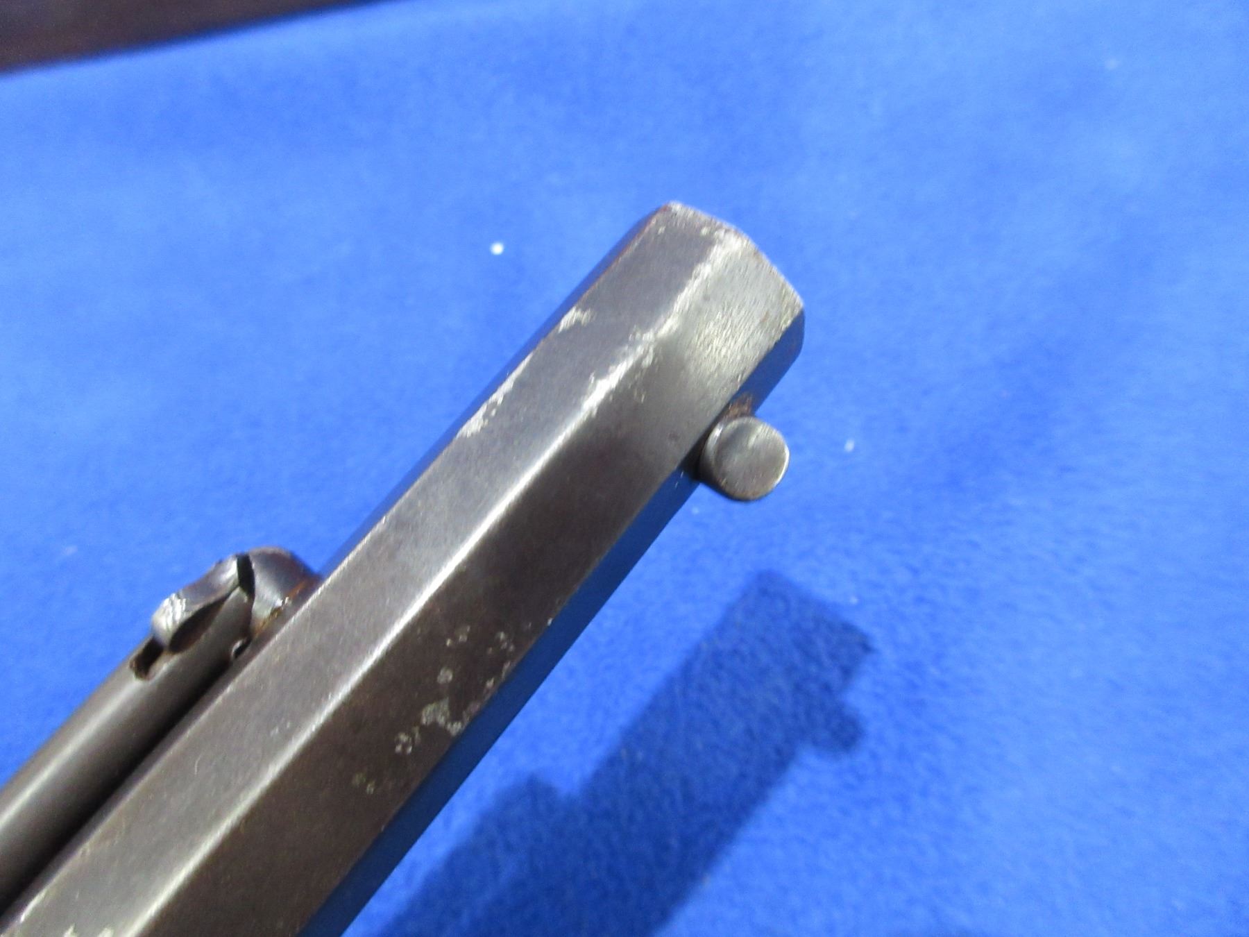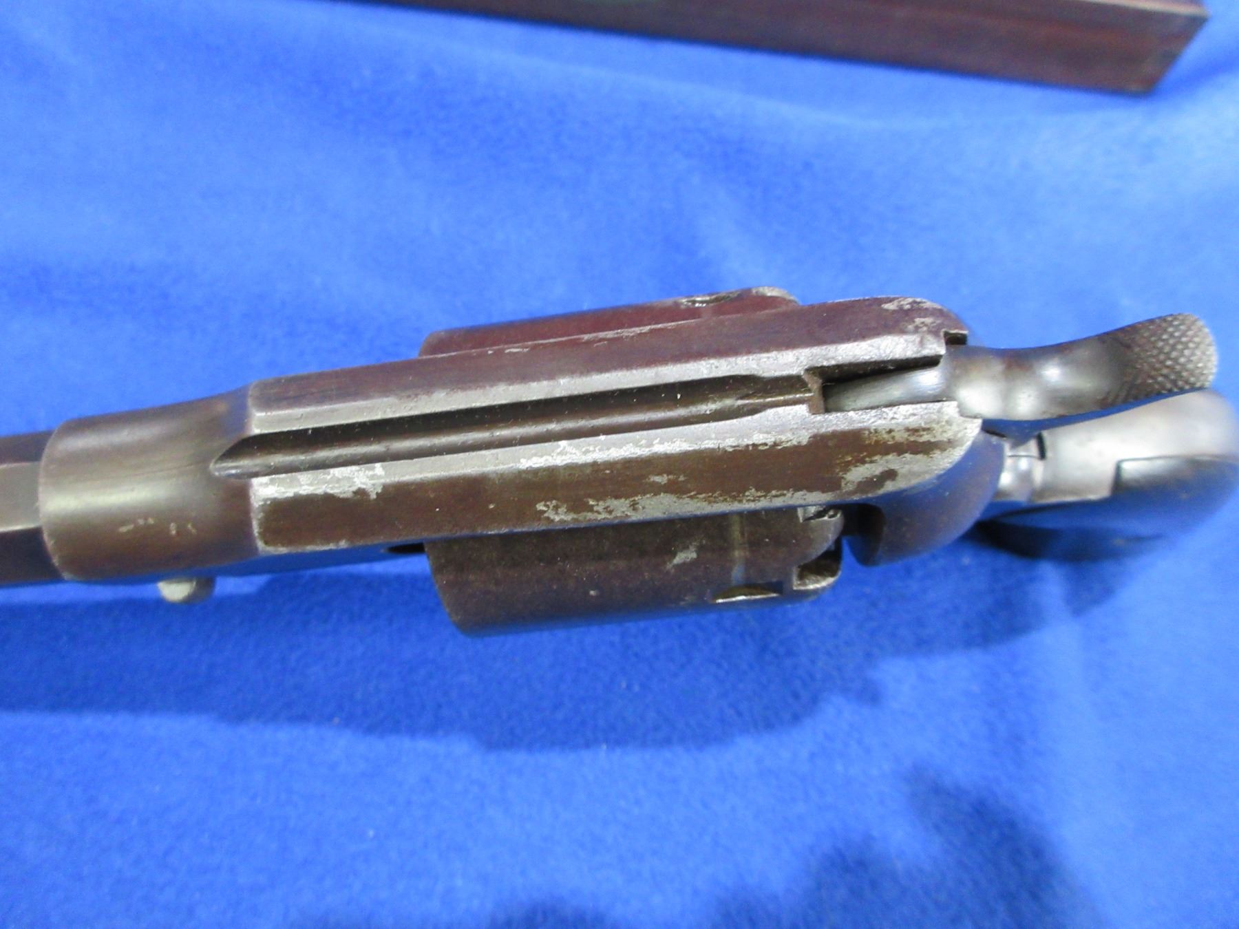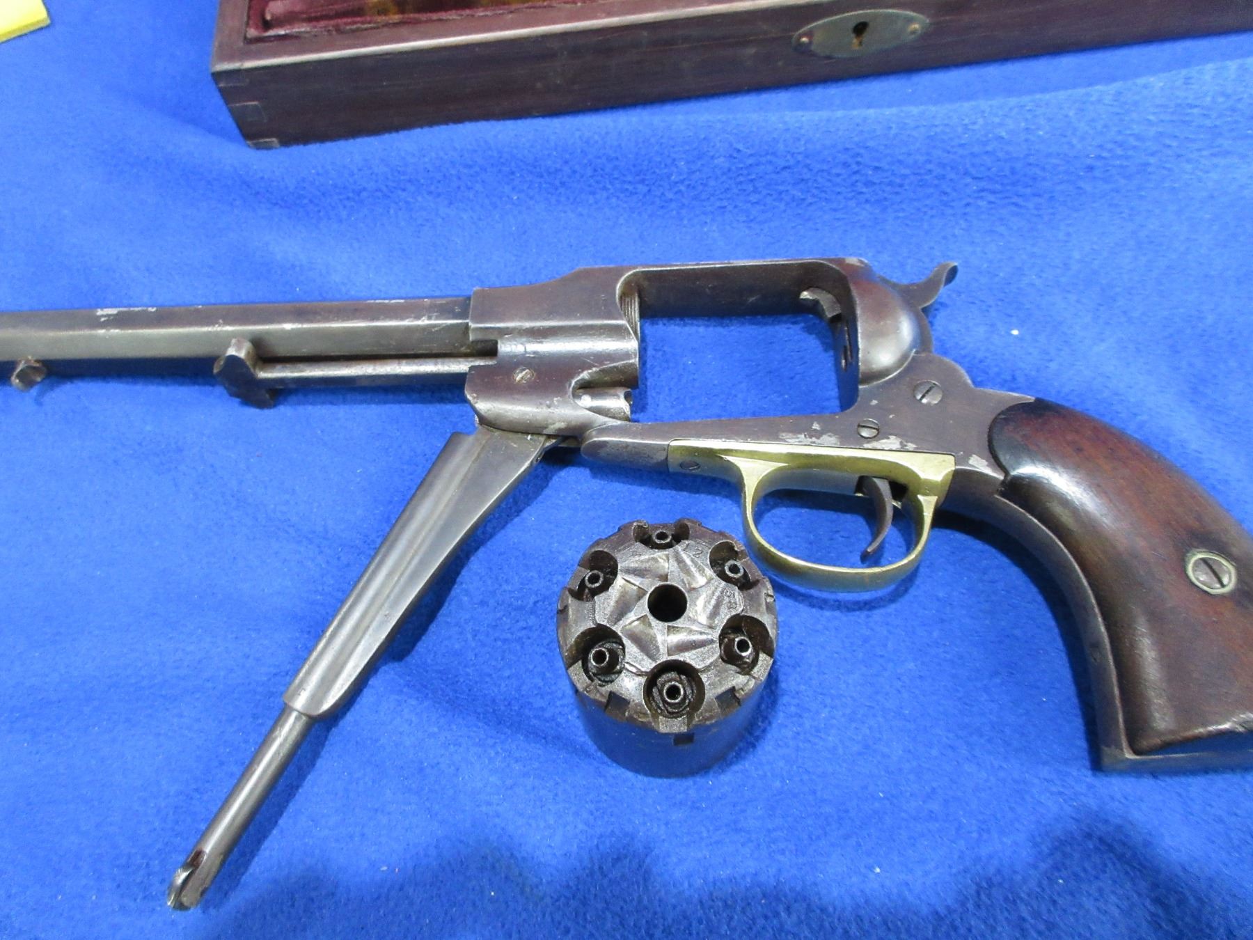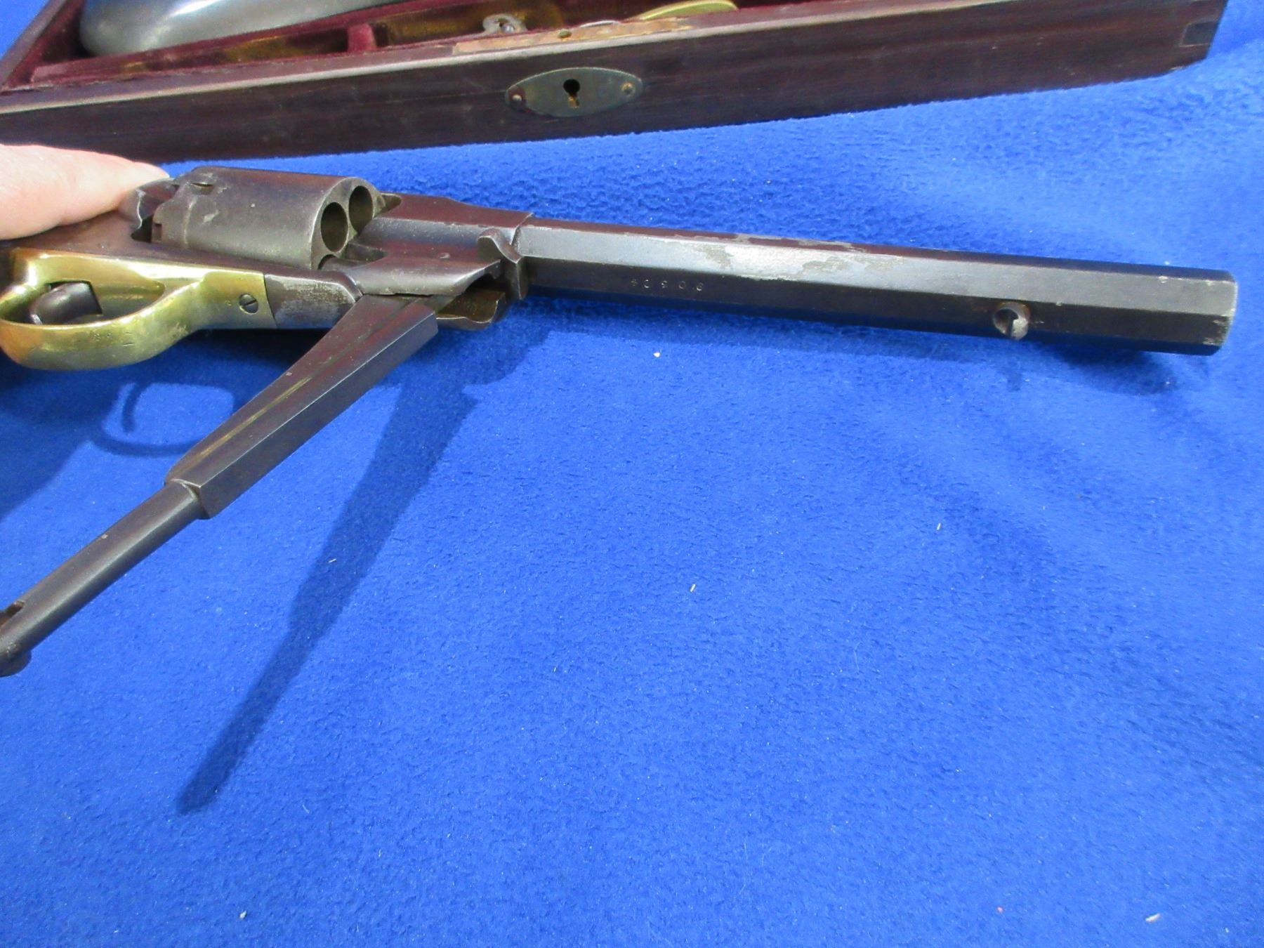 Antique - No PAL Required - Remington New Model 1858 Army in 44 Cal. - Rare and desireable, this is a six shot single action cap and ball revolver, action appears to be in good working order, cylinder lock up has some play. Octagon barrel is 8". rifling is good for age, bluing is has mostly turned brown with wear patches, has both sights, wood grips are good with usual wear, comes with powder horn, bullet mold, lead balls and display case. Ser # 90553.
