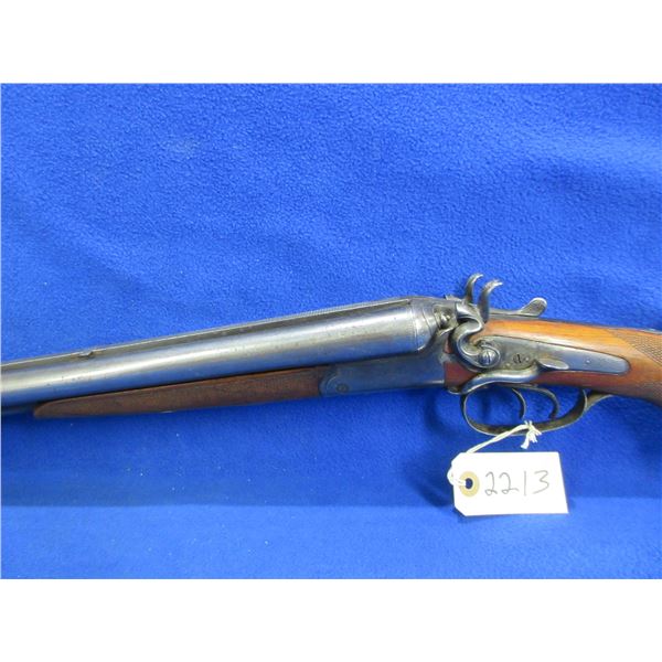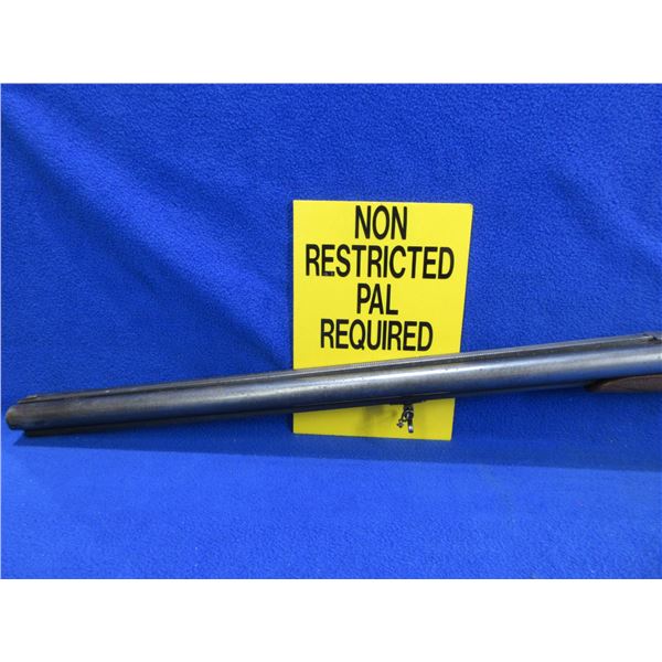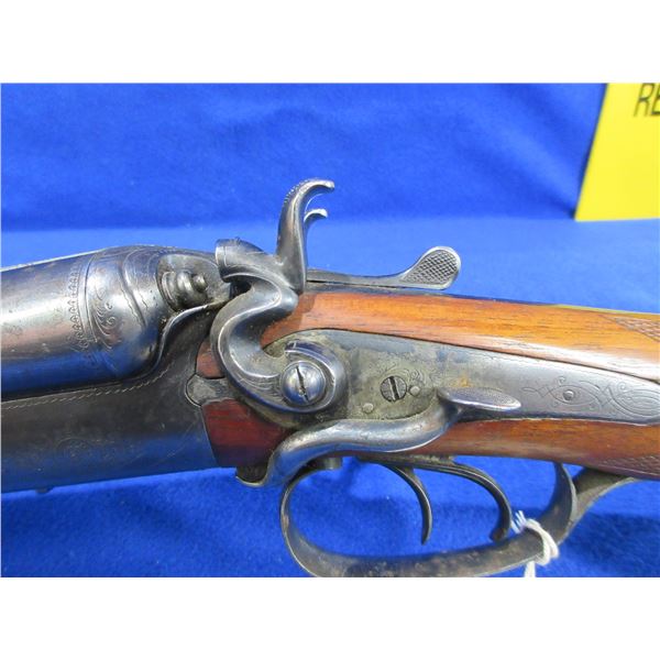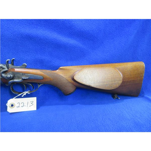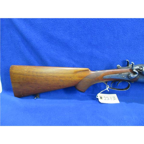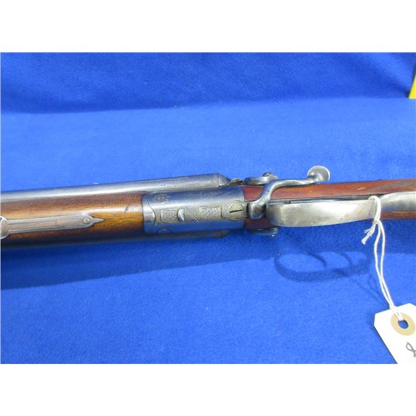 Non-Restricted - Unknown Drilling in 12 Ga. 2 1/2"/8x57JR - This is a hammer tip up with side lever drilling shotgun/rifle, action is tight and appears to be in good to very good working order. Solid rib 12 Ga. barrels are 26 1/2" - bores are good but chambers have some pitting, rifle barrel is 26 1/2" - rifling is fair to good for age, bluing is mostly gone, has blade front sight and tip up rear sight, stock is good for age with a small chip on the toe, forearm is good for age, butt plate missing, comes with swivels. Ser # 13715