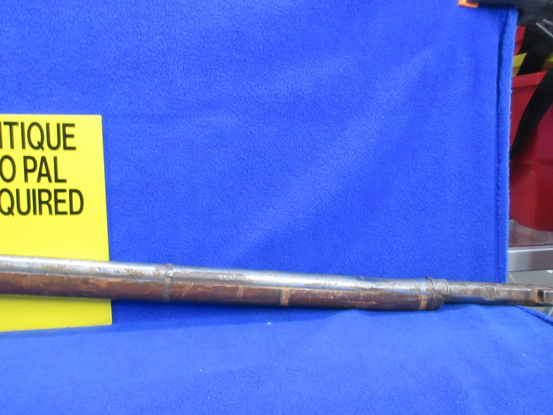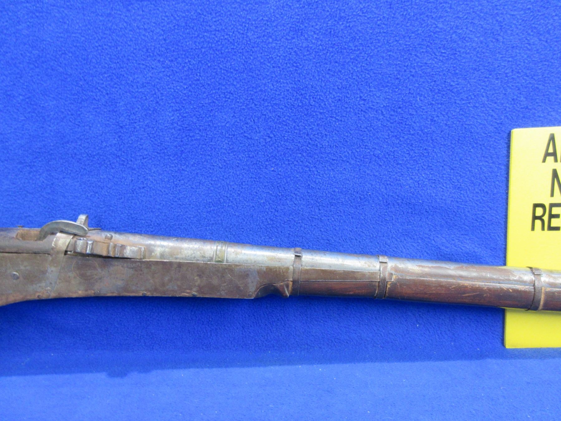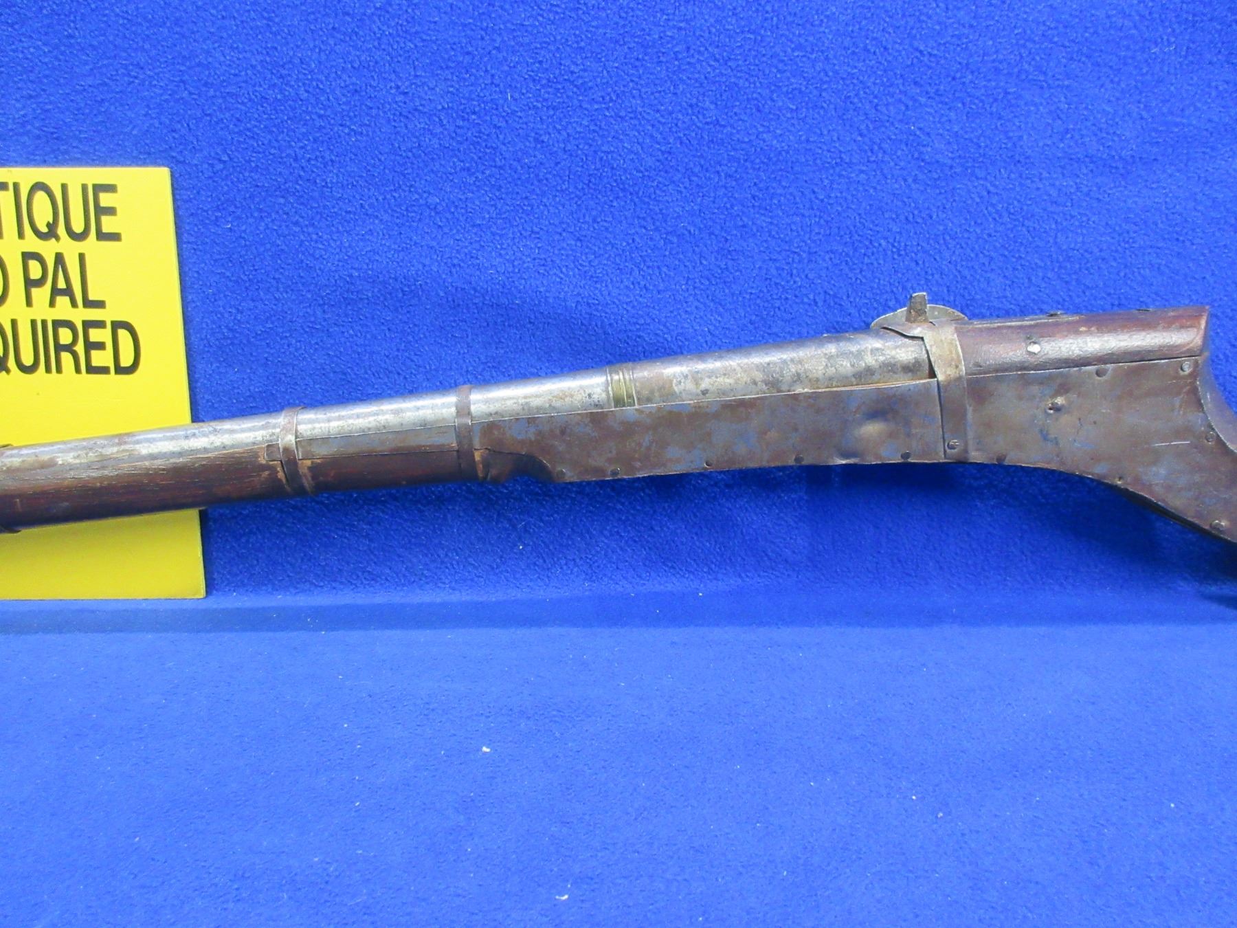 Antique - No PAL Required - Indian Matchlock Musket - This muzzleloading single-shot rifle appears to be from the Sing region of India and would be a nice wallhanger, trigger is working but action is missing parts. Barrel is 35" and has dents, Bore has rust and pitting, finish has rust and pitting, missing front sight, rear sight is broken, stock is good for age, missing 1 barrel band.
