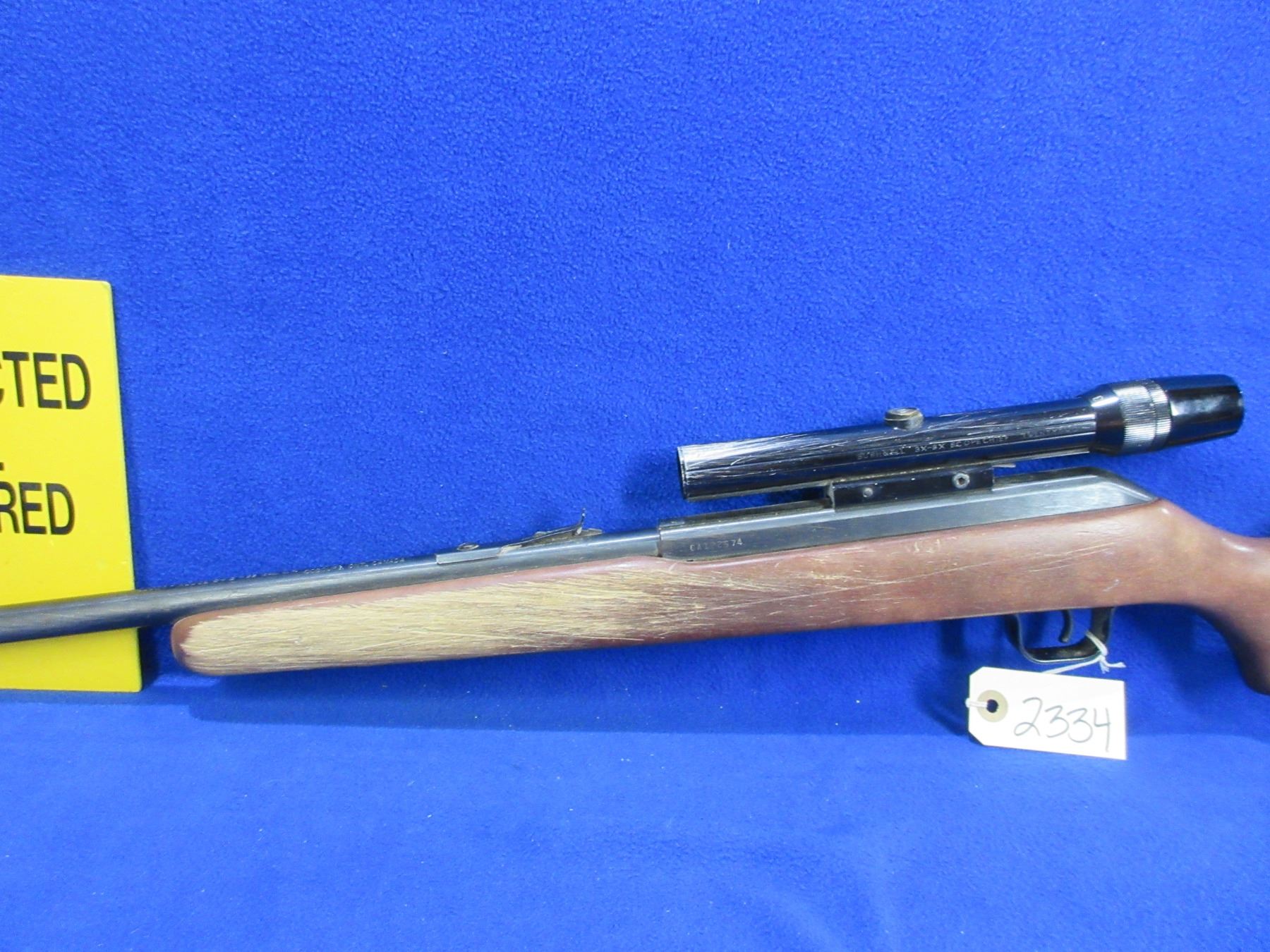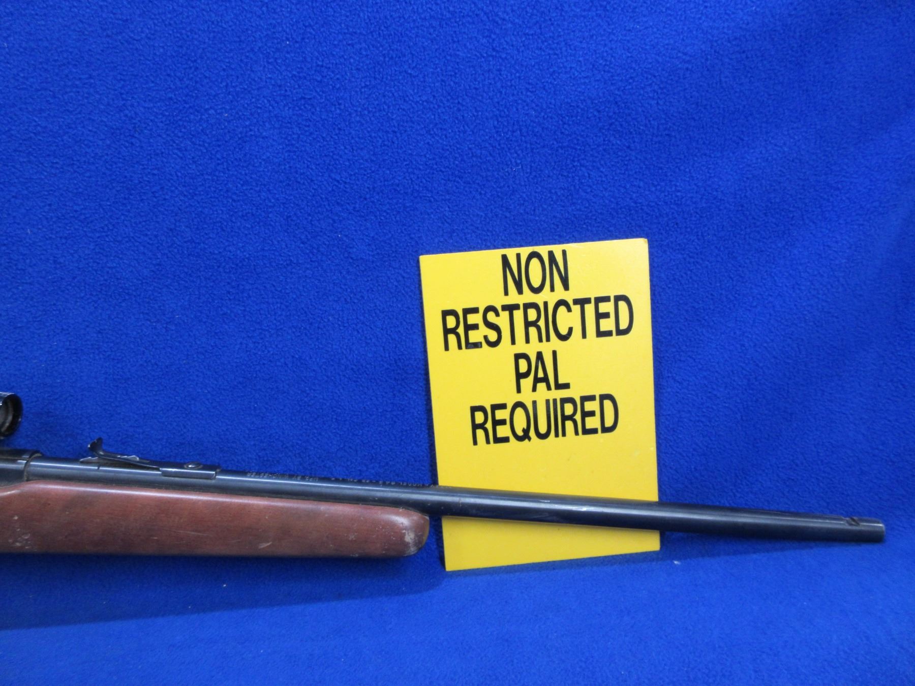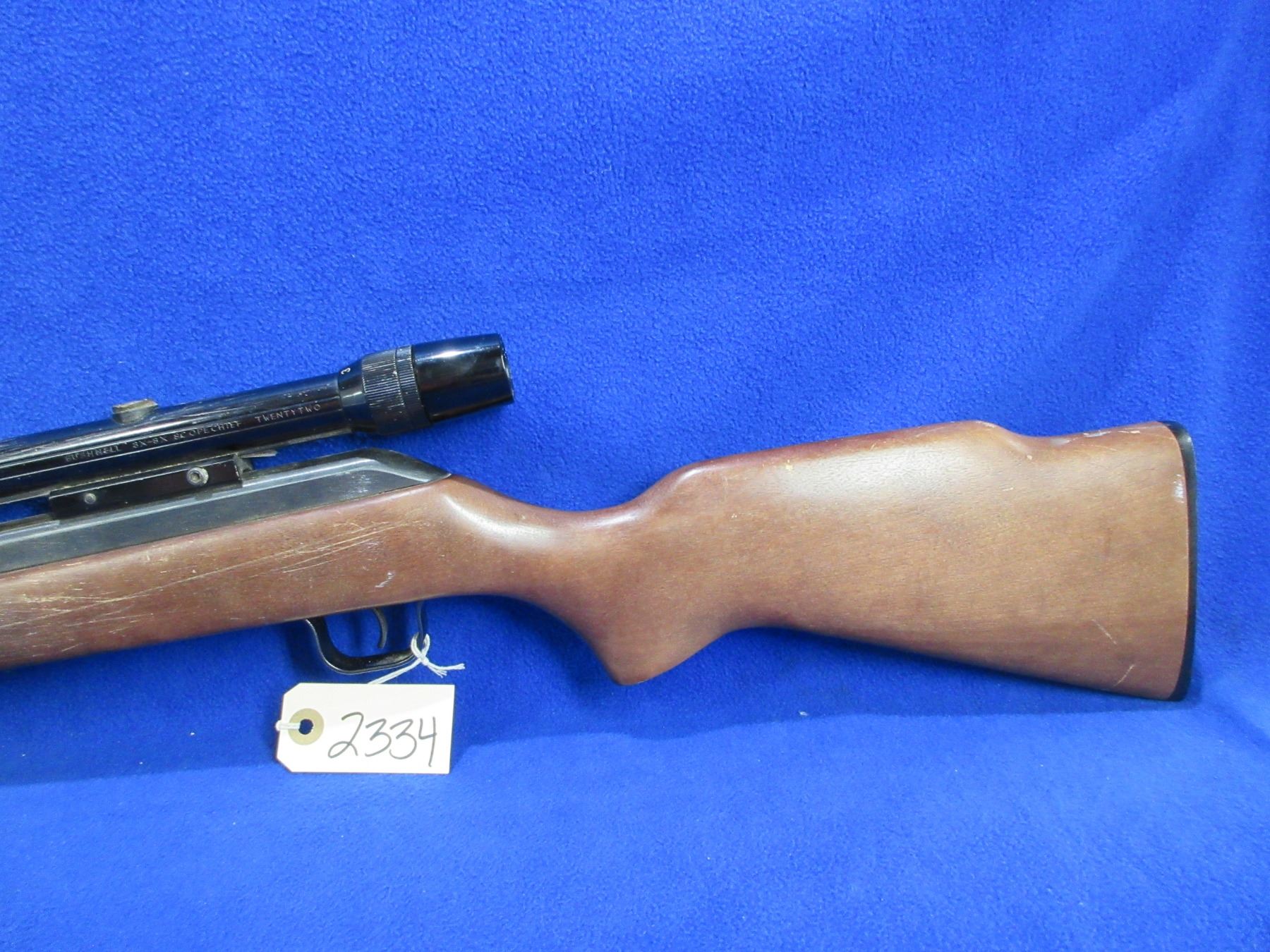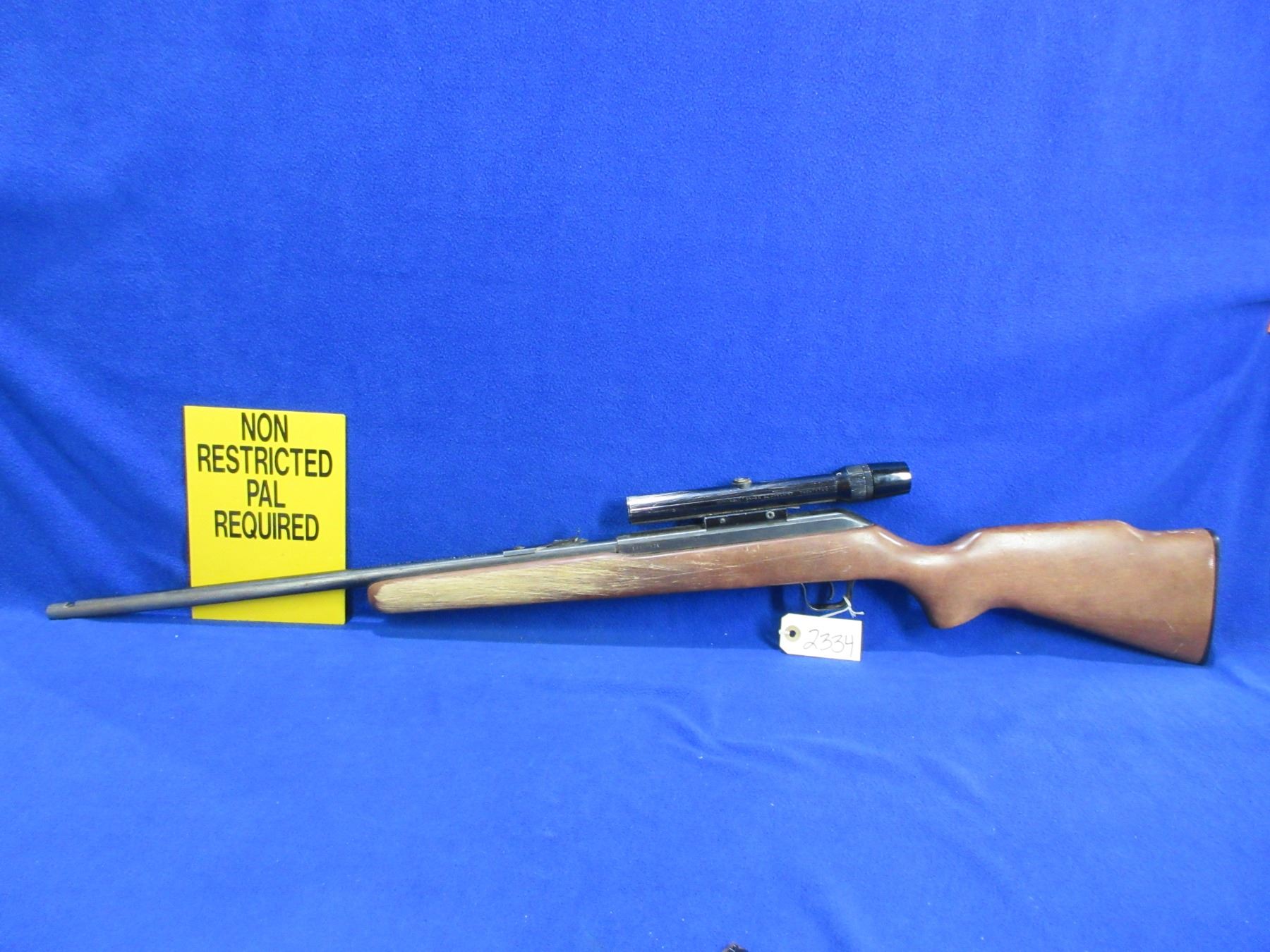 Non-Restricted - Cooey Model 64B in 22 LR - This is a semi-auto rifle with removable magazine (magazine missing), action appears to be in good to very good working order. Barrel is 20", rifling is good to very good, bluing is mostly gone on left side, has rear sight but front sight missing and has Bushnell Scopechief 3x-9x Twenty Two scope (has damage) - appears clear - standard reticle, stock has scratch damage on left at foreend, butt plate good. This gun looks like it has been dragged as the scope, barrel and stock all gave drag marks. Ser # CA122574