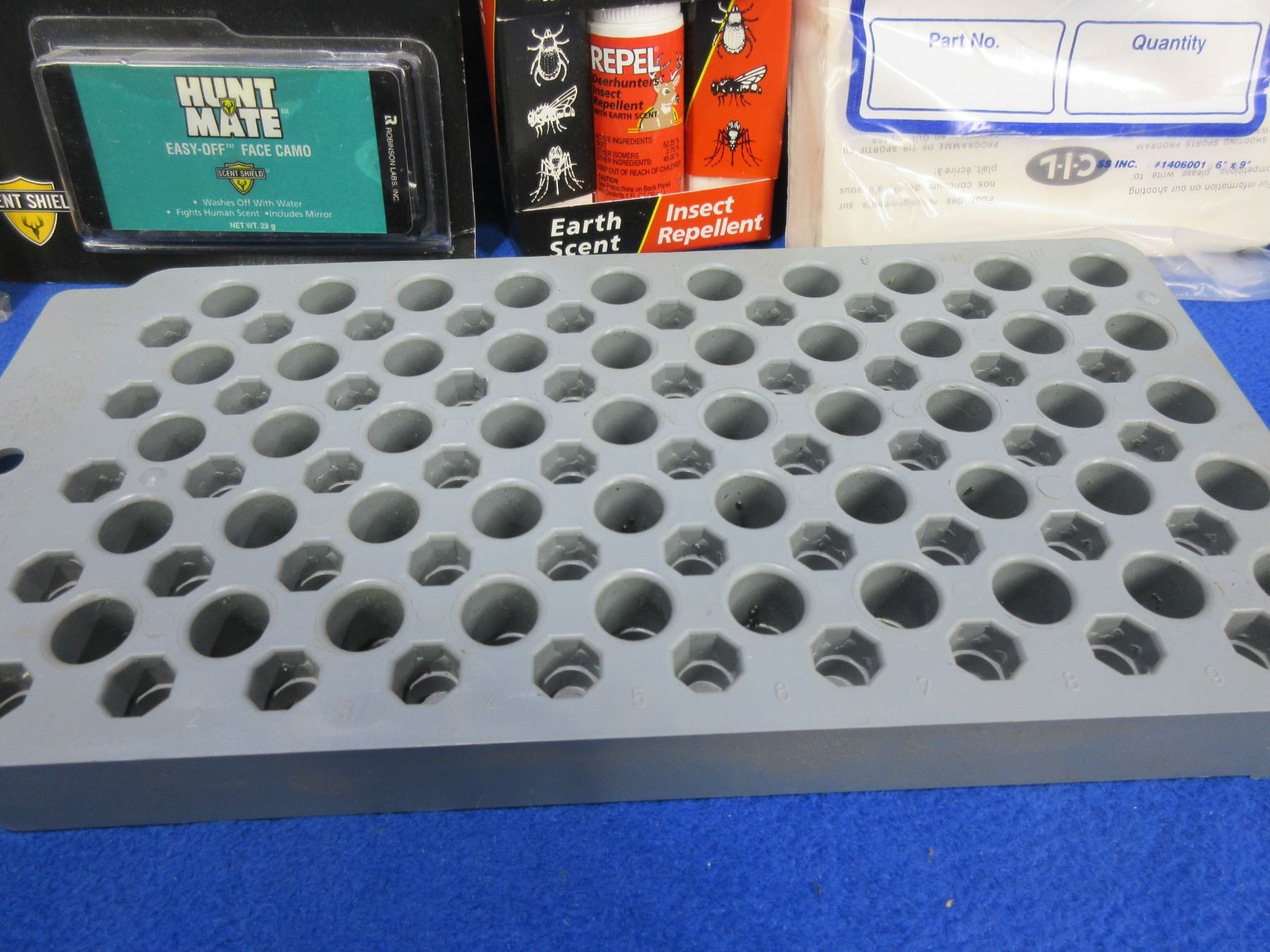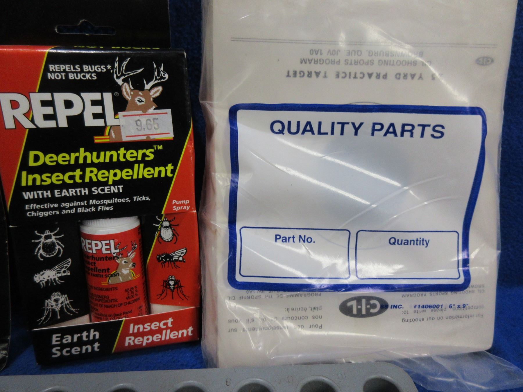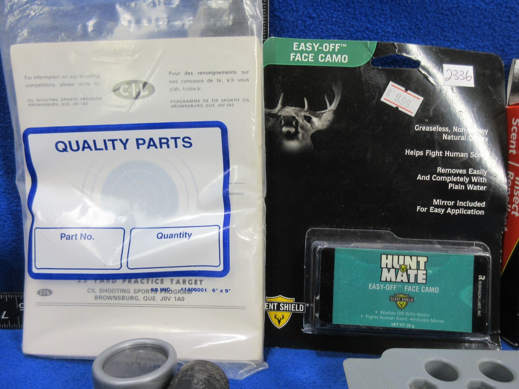 Lot of Misc. - Targets 6"x9", Repel Inset Repellent, Easy Off Face Camo, Reloading Block, Lens Covers