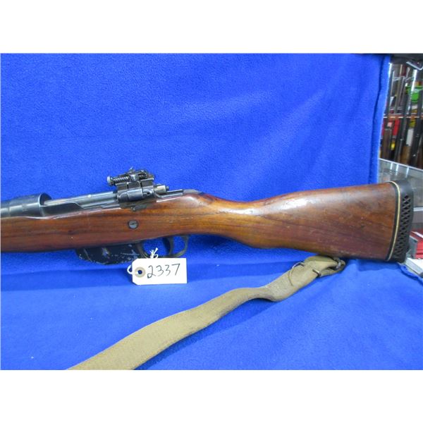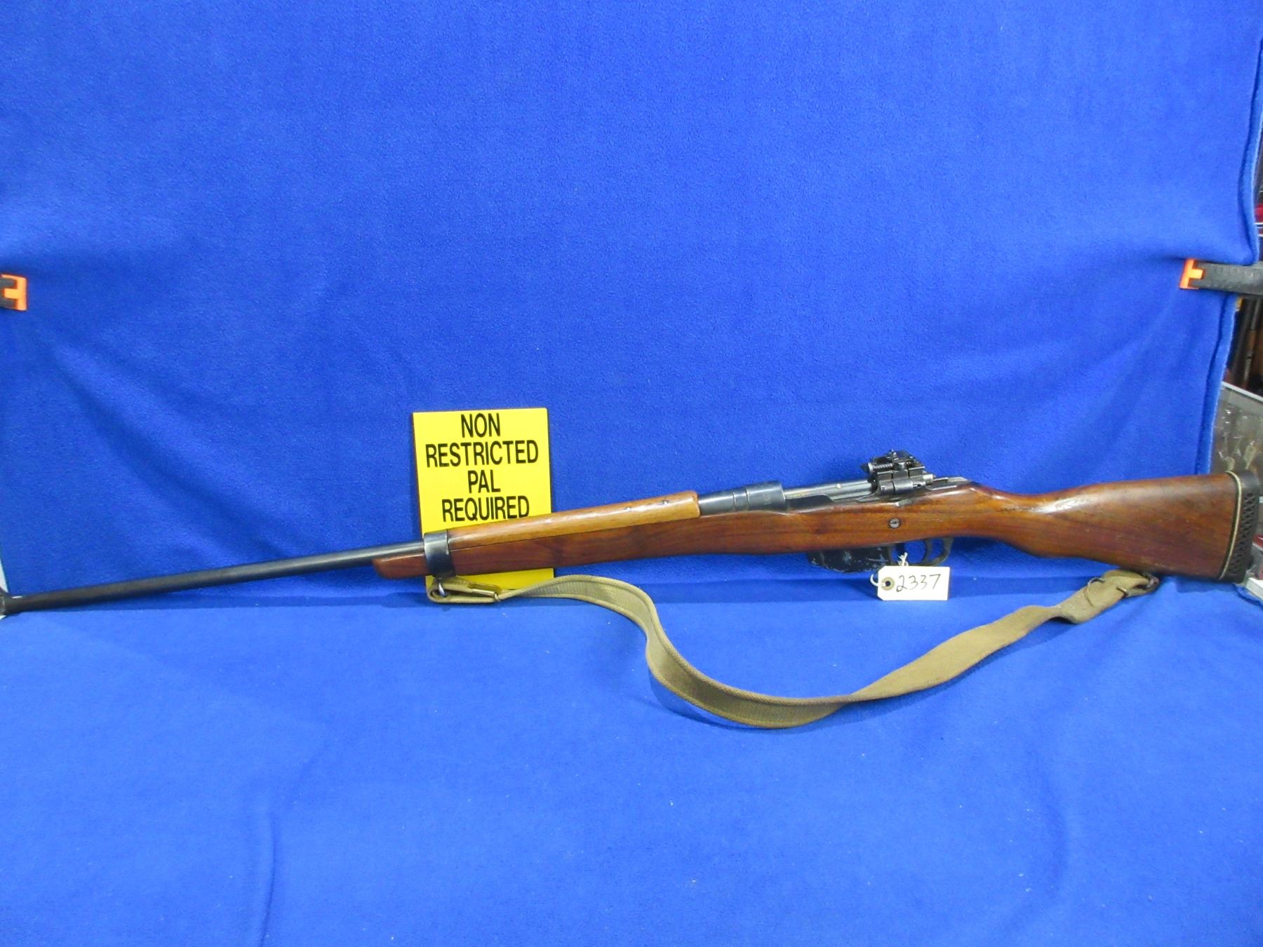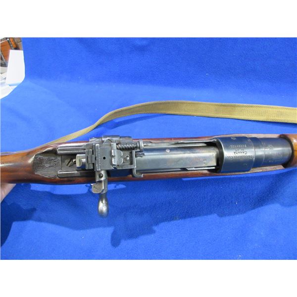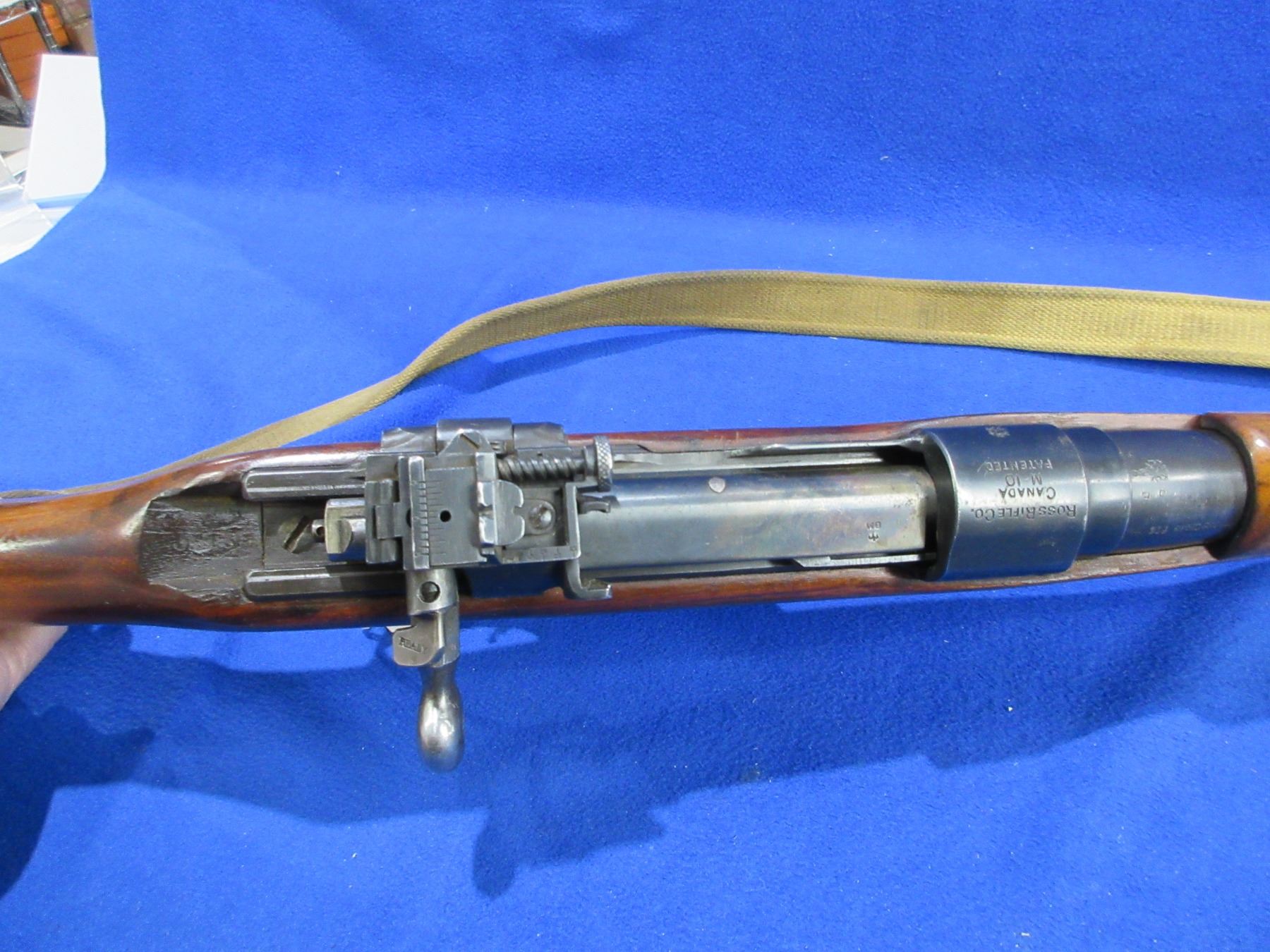 Non-Restricted - Ross Rifle Model M10 in 303 British- This is a straight pull bolt action rifle with internal magazine, action appears to be in good to very good working order. Barrel is 30 1/2", rifling is good to very good, bluing is good to very good for age, has both sights and rear peep sight, stock is good to very good for age with usage marks, rubber recoil pad good, comes with swivels and web strap. Ser #None