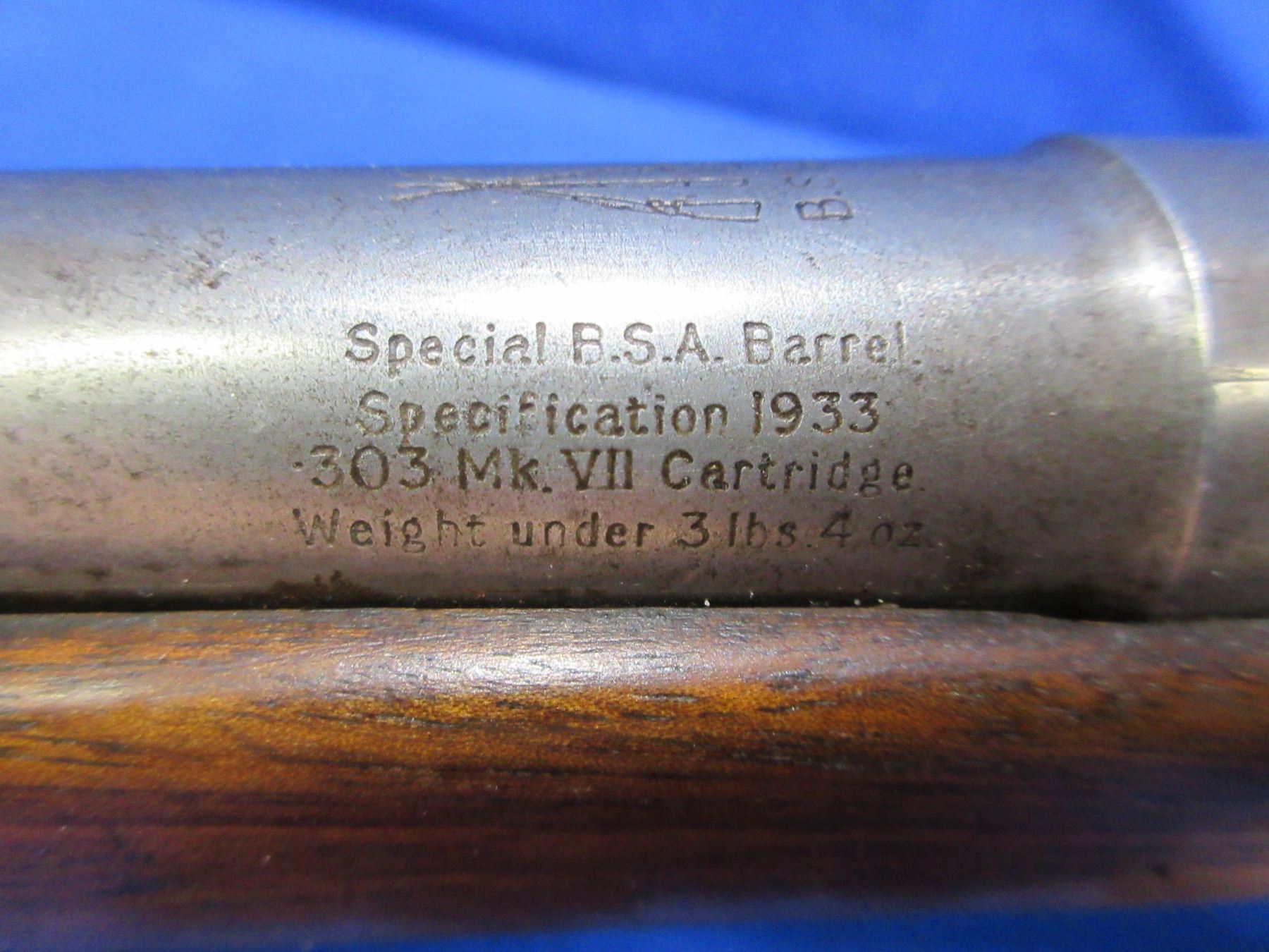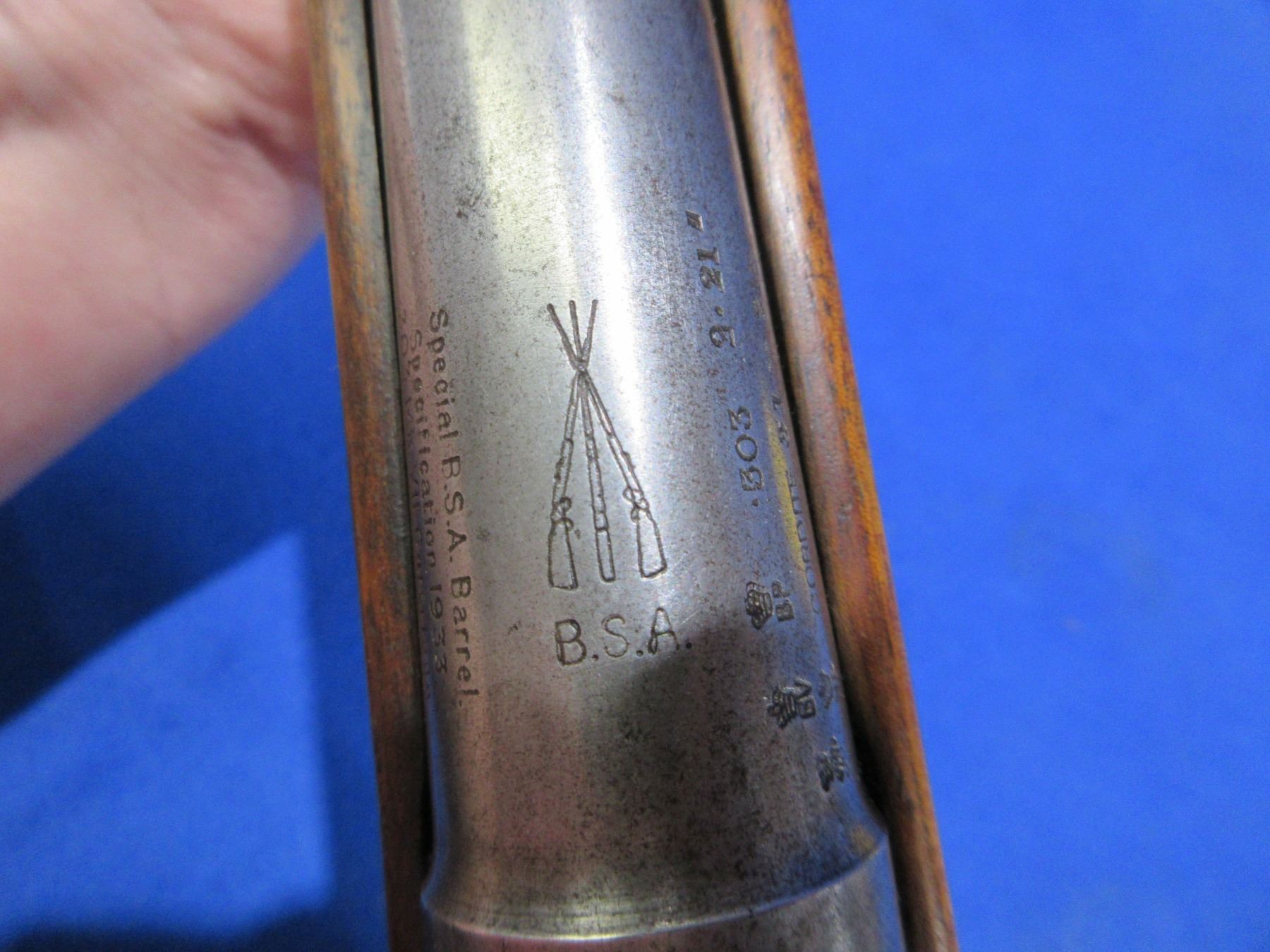 Non-Restricted - BSA Steyr Model 1896 in 303 British - This is a bolt action rifle with internal stripper clip magazine, action appears to be in good to very good working order. Custom barrel marked "Special B.S.A. Barrel Specification 1933 303 Mk VII Cartridges weight under 3 lb 4 oz" and "Cordite 31-215". Barrel is 30 1/2" and has sight lug sweated onto barrel approx 3" from muzzle, rifling is good to very good, bluing is gone, has no sights , stock is good, metal butt plate good, rear swivel missing. Ser #956