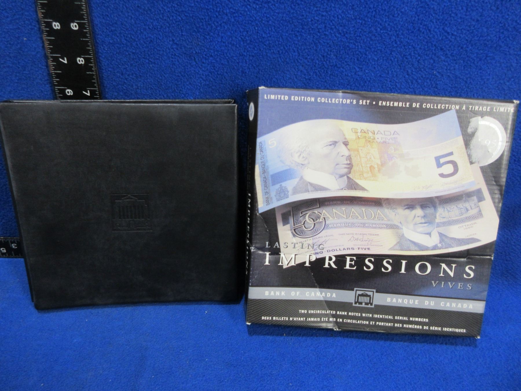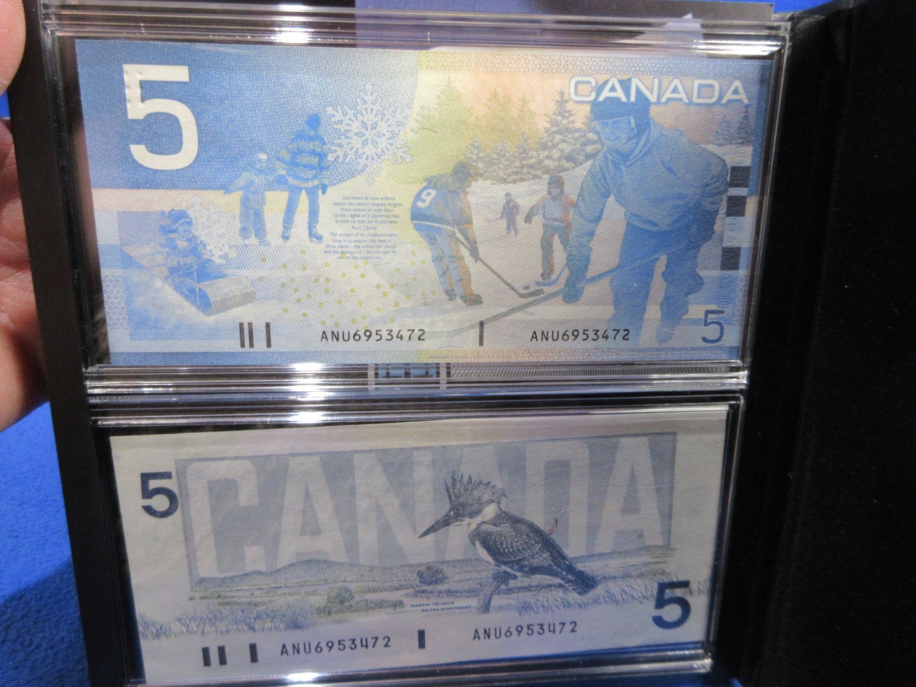 Bank of Canada 2 Uncirculated 5 Dollar Bills 1986 & 2002 - Identical Serial Numbers - Lasting Impressions Dual Series Collector's Set in Display Folder and Original Box