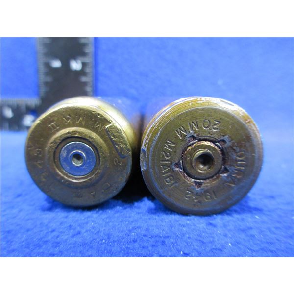 2 - 20MM Shell Casings - 1 Brass (1942) and 1 Steel (1943)