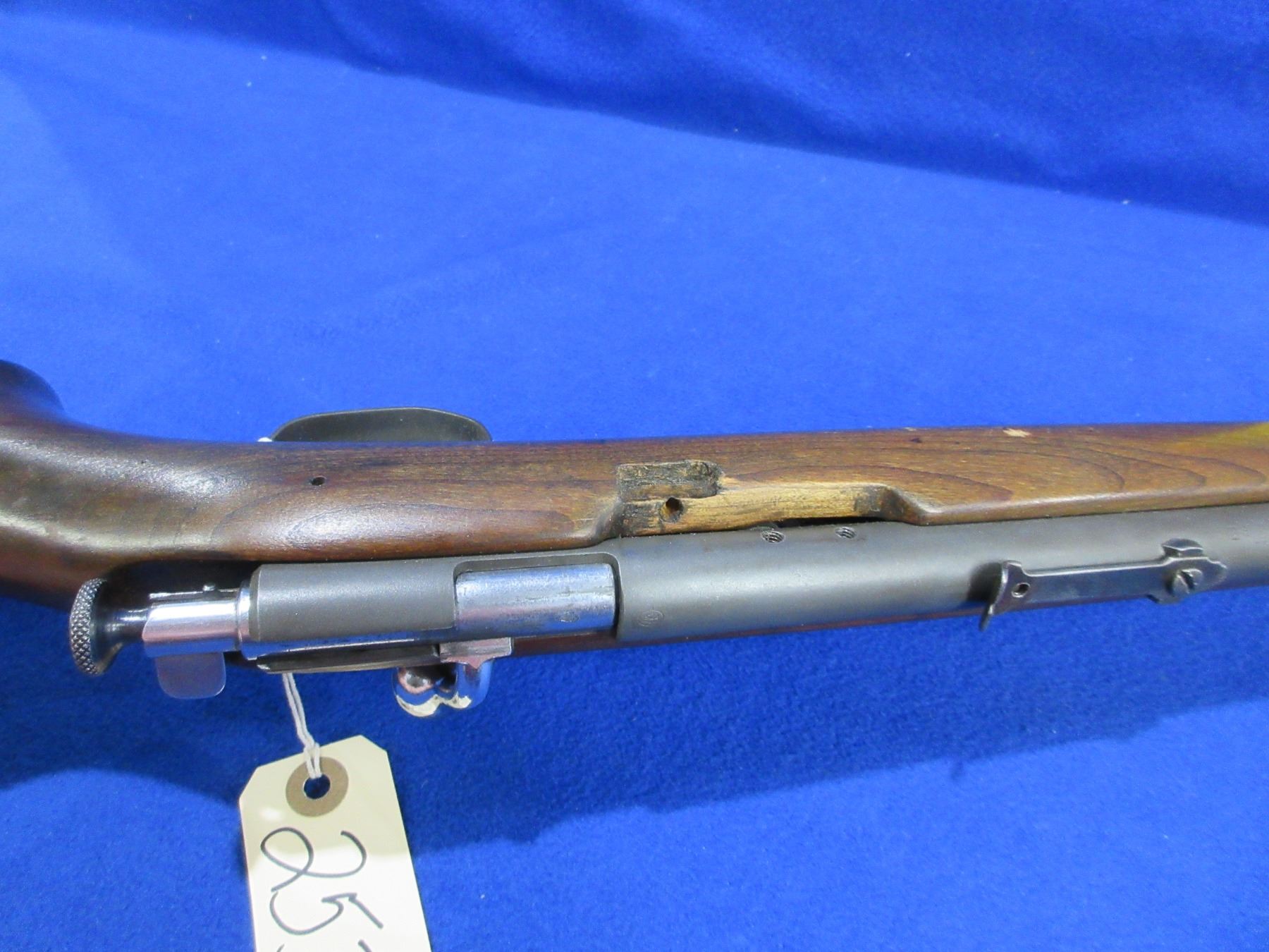Non-Restricted - Winchester Model 67 in 22 LR - This is a single shot bolt action rifle, action appears to be in good to very good working order. Barrel is 25 1/2", rifling is good to very good but barrel may need recrowning, bluing is grey, has both sights but front sight appears blade broken off and rear missing adjusting screw and is drilled and tapped for side mount peep sight?, stock is good but has been midified to fit peep sight, butt plate good. Ser # None