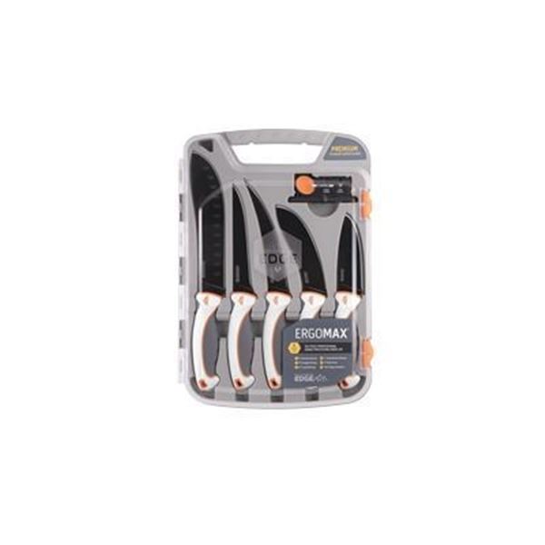 Outdoor Edge, ErgoMax, Fixed Blade Knife Set, Plain Edge, 5Cr13MoV Blade Steel, White and Orange Handles, Titanium Coated Blades, Kit includes 5 Knives and Sharpener
