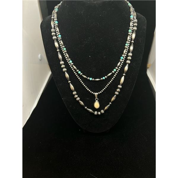 Meticulously handcrafted this stunning set of 3 authentic Navajo Pearl stacker necklaces feature King Man Turquoise and a Alberta Elk Ivory Pendant. There are three separate necklaces of differing lengths that can be worn together as a set or worn individually. The middle necklace features a Elk Ivory Pendant set in Silver with a Bail that allows the pendant to be removed if wanted.