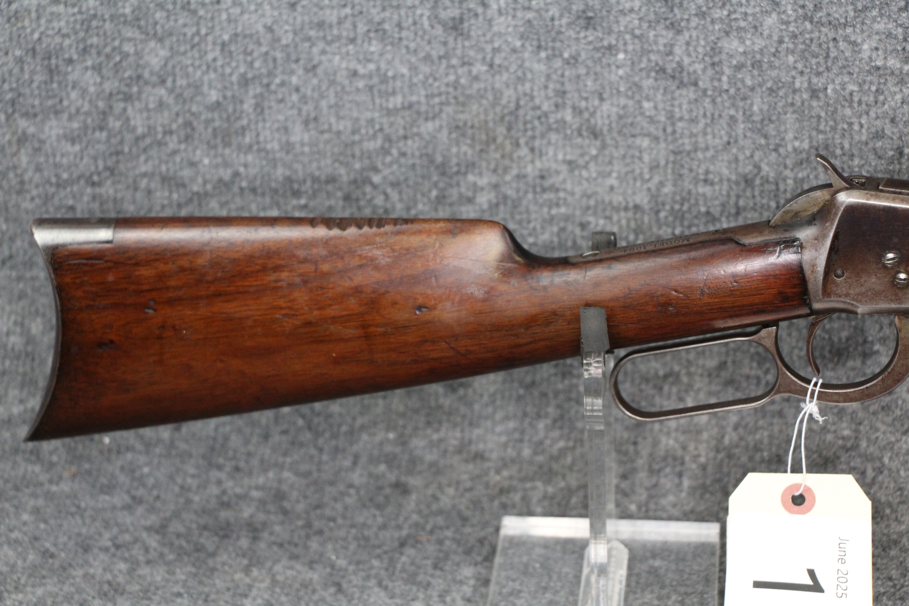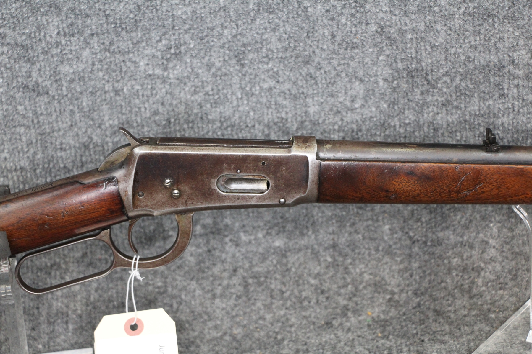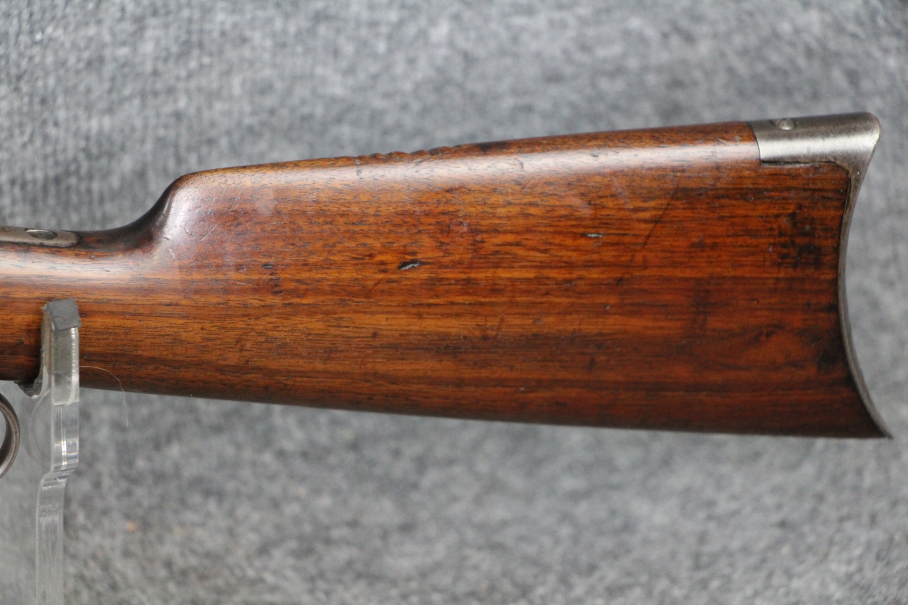 Condition good. Much handling wear and kill notches. Lots of shallow scratches on the receiver as well as blueing wear. No rust nor dents in the tube. Barrel length 26". Cal. 38-55. Aftermarket rear sight. Appears to have had the tube replaced.
